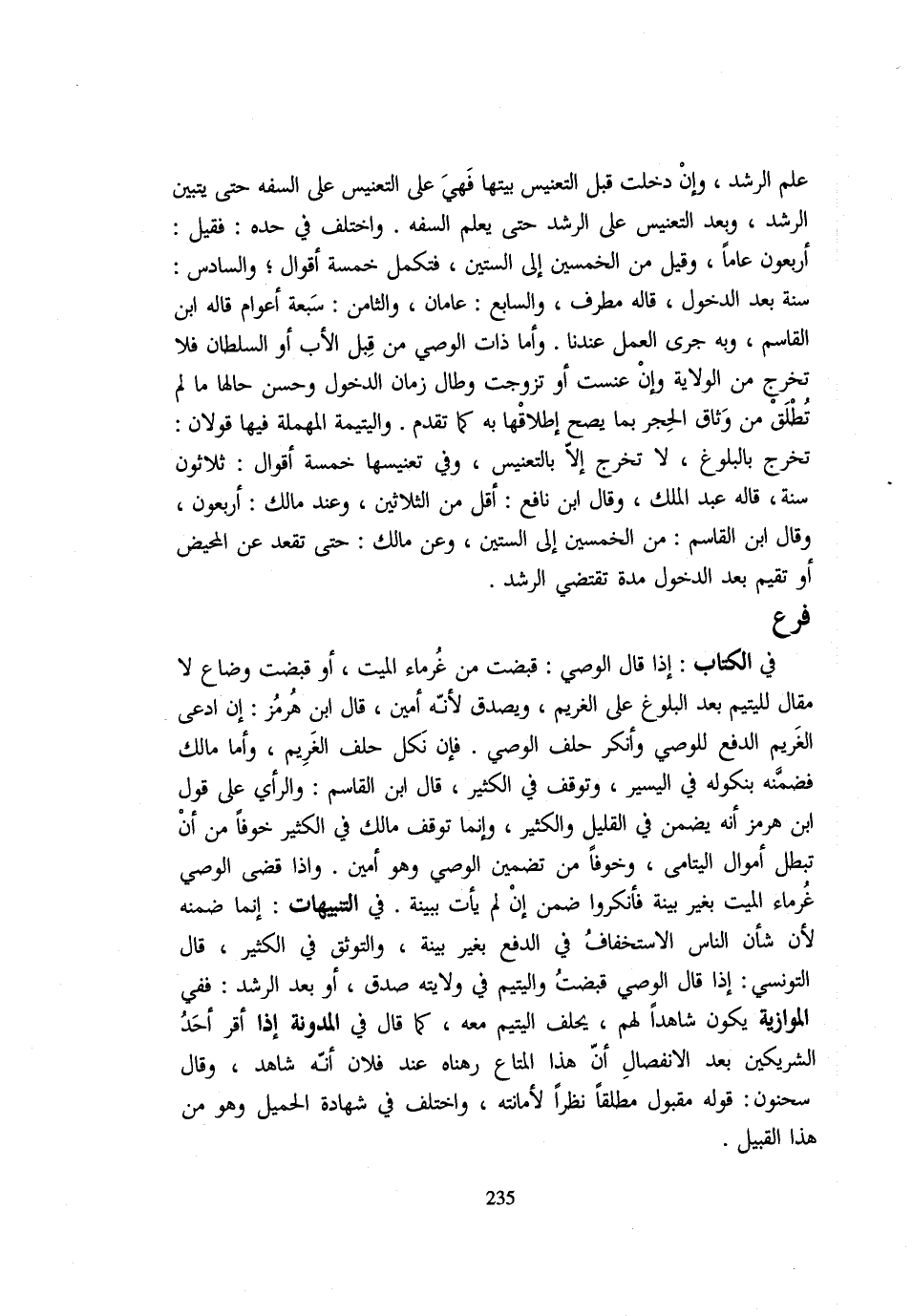 عُلِمَ الرُّشْدُ وَإِنْ دَخَلَتْ قَبْلَ التَّعْنِيسِ بَيْتَهَا فَهِيَ عَلَى التَّعْنِيسِ عَلَى السَّفَهِ حَتَّى يُتَبَيَّنَ الرُّشْدُ وَبَعْدَ التَّعْنِيسِ عَلَى الرُّشْدِ حَتَّى يُعْلَمَ السَّفَهُ وَاخْتُلِفَ فِي حَدِّهِ: فَقِيلَ: أَرْبَعُونَ عَامًا وَقِيلَ مِنَ الْخَمْسِينَ إِلَى السِّتِّينَ فَتَكْمُلُ خَمْسَةُ أَقْوَالٍ وَالسَّادِسُ: سَنَةٌ بَعْدَ الدُّخُولِ قَالَهُ مُطَرِّفٌ وَالسَّابِعُ: عَامَانِ وَالثَّامِنُ: سَبْعَةُ أَعْوَامٍ قَالَهُ ابْنُ الْقَاسِمِ وَبِهِ جَرَى الْعَمَلُ عِنْدَنَا وَأَمَّا ذَاتُ الْوَصِيِّ مِنْ قِبل الْأَبِ أَوِ السُّلْطَانِ فَلَا تَخْرُجُ مِنَ الْوَلَايَةِ وَإِنْ عَنَّسَتْ أَوْ تَزَوَّجَتْ وَطَالَ زَمَانُ الدُّخُولِ وَحَسُنَ حَالُهَا مَا لَمْ تُطْلق مِنْ وَثاق الحِجر بِمَا يَصِحُّ إِطْلَاقُهَا بِهِ كَمَا تَقَدَّمَ وَالْيَتِيمَةُ الْمُهْمَلَةُ فِيهَا قَوْلَانِ: تَخْرُجُ بِالْبُلُوغِ لَا تَخْرُجُ إِلَّا بِالتَّعْنِيسِ وَفِي تَعْنِيسِهَا خَمْسَةُ أَقْوَالٍ: ثَلَاثُونَ سَنَةً قَالَهُ عَبْدُ الْمَلِكِ وَقَالَ ابْنُ نَافِعٍ: أَقَلُّ مِنَ الثَلَاثِينَ وَعِنْدَ مَالِكٍ: أَرْبَعُونَ وَقَالَ ابْنُ الْقَاسِمِ: مِنَ الْخَمْسِينَ إِلَى السِّتِّينَ وَعَنْ مَالِكٍ: حَتَّى تَقْعُدَ عَن الْمَحِيض أوتقيم بَعْدَ الدُّخُولِ مُدَّةً تَقْتَضِي الرُّشْدَ
