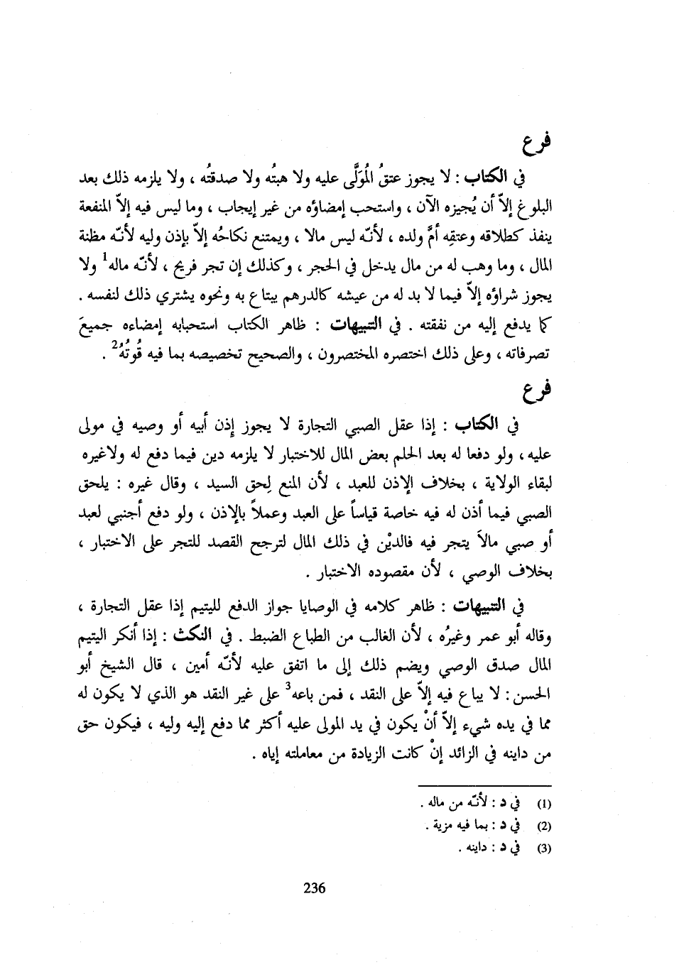 فِي الْكِتَابِ: إِذَا عَقَلَ الصَّبِيُّ التِّجَارَةَ لَا يَجُوزُ إِذْنُ أَبِيهِ أَوْ وَصِيِّهِ فِي مَوْلًى عَلَيْهِ وَلَوْ دَفَعَا لَهُ بَعْدَ الْحُلُمِ بَعْضَ الْمَالِ لِلِاخْتِبَارِ لَا يَلْزَمَهُ دَيْنٌ فِيمَا دُفِعَ لَهُ وَلَا غَيْرُهُ لِبَقَاءِ الْوَلَايَةِ بِخِلَافِ الْإِذْنِ لِلْعَبْدِ لِأَنَّ الْمَنْعَ لِحق السَّيِّدِ وَقَالَ غَيْرُهُ: يَلْحَقُ الصَّبِيَّ فِيمَا أُذِنَ لَهُ فِيهِ خَاصَّةً قِيَاسًا عَلَى الْعَبْدِ وَعَمَلًا بِالْإِذْنِ وَلَوْ دَفَعَ أَجْنَبِيٌّ لِعَبْدٍ أَوْ صَبِيٍّ مَالَا يَتَّجِرُ فِيهِ فَالدَّيْنُ فِي ذَلِكَ الْمَالِ لِتَرَجُحِّ الْقَصْدِ لِلتَّجْرِ عَلَى الِاخْتِبَارِ بِخِلَافِ الْوَصِيِّ لِأَنَّ مَقْصُودَهُ الِاخْتِبَارُ فِي التَّنْبِيهَاتِ: ظَاهِرُ كَلَامِهِ فِي الْوَصَايَا جَوَازُ الدَّفْعِ لِلْيَتِيمِ إِذَا عَقَلَ التِّجَارَةَ وَقَالَهُ أَبُو عُمَرَ وَغَيْرُهُ لِأَنَّ الْغَالِبَ مِنَ الطِّبَاعِ الضَّبْطُ فِي النكث: إِذَا أَنْكَرَ الْيَتِيمُ الْمَالَ صُدِّقَ الْوَصِيُّ وَيُضَمُّ ذَلِكَ إِلَى مَا اتُّفِقَ عَلَيْهِ لِأَنَّهُ أَمِينٌ قَالَ الشَّيْخُ أَبُو الْحَسَنِ: لَا يُبَاعُ فِيهِ إِلَّا عَلَى النَّقْدِ فَمَنْ بَاعَهُ عَلَى غَيْرِ النَّقْدِ هُوَ الَّذِي لَا يَكُونُ لَهُ مِمَّا فِي يَدِهِ شَيْءٌ إِلَّا أَنْ يَكُونَ فِي يَدِ الْمَوْلَى عَلَيْهِ أَكْثَرُ مِمَّا دَفَعَ إِلَيْهِ وَلَيُّهُ فَيَكُونَ حَقُّ مَنْ دَايَنَهُ فِي الزَّائِدِ إِنْ كَانَتِ الزِّيَادَةُ مِنْ مُعَامَلَتِهِ إِيَّاهُ