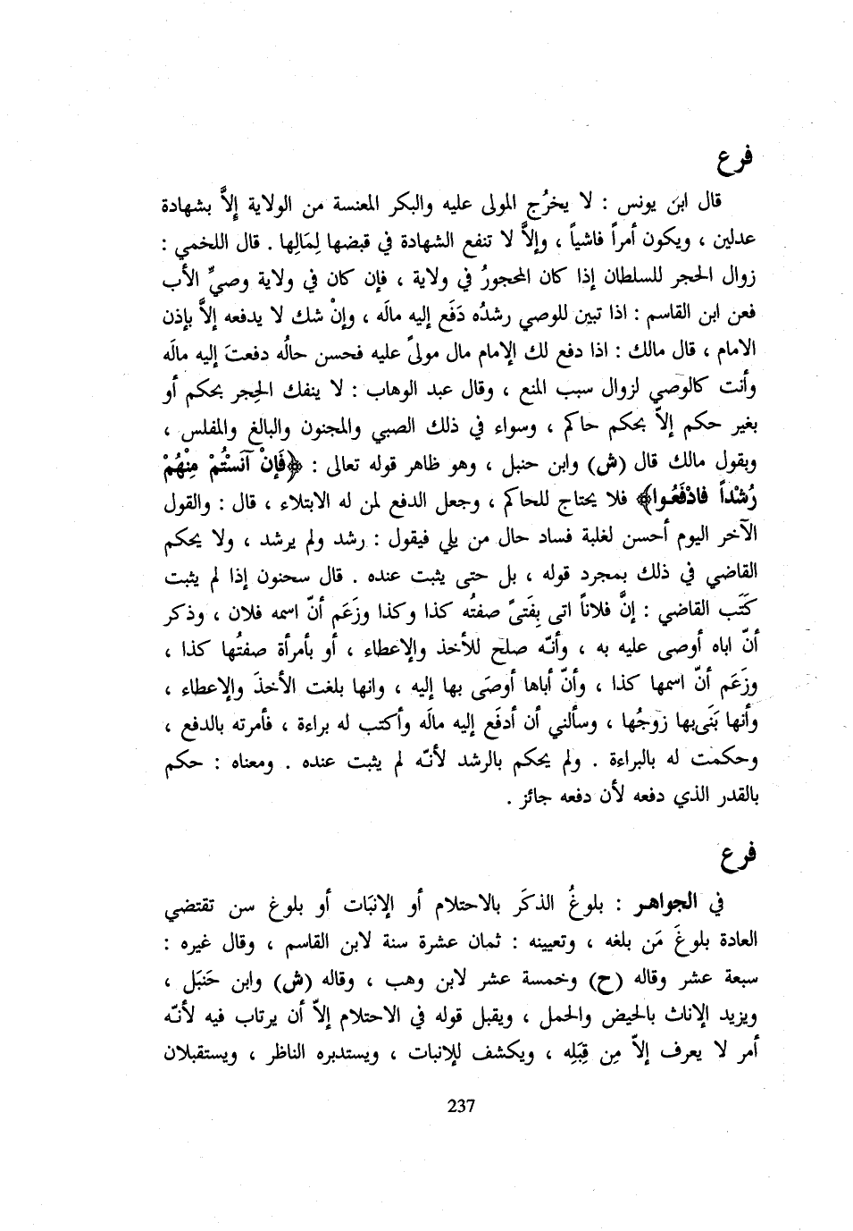 قَالَ ابْنُ يُونُسَ: لَا يخرُج الْمَوْلَى عَلَيْهِ وَالْبِكْرُ الْمُعَنَّسَةُ مِنَ الْوَلَايَةِ إِلَّا بِشَهَادَةِ عَدْلَيْنِ وَيَكُونُ أَمْرًا فَاشِيًا وَإِلَّا لَا تَنْفَعُ الشَّهَادَةُ فِي قَبْضِهَا لِمَالِهَا قَالَ اللَّخْمِيُّ: زَوَالُ الْحجر للسُّلْطَان إِذا كَانَ الْمَحْجُور فِي ولَايَة فَإِنْ كَانَ فِي وَلَايَةِ وصيِّ الْأَبِ فَعَنِ ابْنِ الْقَاسِمِ: إِذَا تَبَيَّنَ لِلْوَصِيِّ رشدُه دَفَع إِلَيْهِ مَالَهُ وَإِنْ شَكَّ لَا يَدْفَعُهُ إِلَّا بِإِذْنِ الْإِمَامِ قَالَ مَالِكٌ: إِذَا دَفَعَ لَكَ الْإِمَامُ مَالَ مَوْلًى عَلَيْهِ فَحَسُنَ حالُه دفعتَ إِلَيْهِ مَالَهُ وَأَنْتَ كَالْوَصِيِّ لِزَوَالِ سَبَبِ الْمَنْعِ وَقَالَ عَبْدُ الْوَهَّابِ: لَا يَنْفَكُّ الحِجر بِحُكْمٍ أَوْ بِغَيْرِ حُكْمٍ إِلَّا بِحُكْمِ حَاكِمٍ وَسَوَاءٌ فِي ذَلِكَ الصَّبِيُّ وَالْمَجْنُونُ وَالْبَالِغُ وَالْمُفْلِسُ وَبِقَوْلِ مَالِكٍ قَالَ (ش) وَابْنُ حَنْبَلٍ وَهُوَ ظَاهِرُ قَوْله تَعَالَى {فَإِنْ آنَسْتُمْ مِنْهُمْ رُشْدًا فَادْفَعُوا} فَلَا يُحْتَاجُ لِلْحَاكِمِ وَجَعَلَ الدَّفْعَ لِمَنْ لَهُ الِابْتِلَاءُ قَالَ: وَالْقَوْلُ الْآخَرُ الْيَوْمَ أَحْسَنُ لِغَلَبَةِ فَسَادِ حَالِ مَنْ يَلِي فَيَقُولُ رَشَدَ وَلَمْ يَرْشُدْ وَلَا يَحْكُمُ الْقَاضِي فِي ذَلِكَ بِمُجَرَّدِ قَوْلِهِ بَلْ حَتَّى يَثْبُتَ عِنْدَهُ قَالَ سُحْنُونٌ إِذَا لَمْ يَثْبُتْ كَتَب الْقَاضِي: إِنَّ فُلَانًا أَتَى بِفَتًى صفتُه كَذَا وَكَذَا وَزَعَمَ أَنَّ اسْمَهُ فُلَانٌ وَذَكَرَ أَنَّ أَبَاهُ أَوْصَى عَلَيْهِ بهع وَأَنَّهُ صَلُحَ لِلْأَخْذِ وَالْإِعْطَاءِ أَوْ بِامْرَأَةٍ صِفَتُهَا كَذَا وَزَعَمَ أَنَّ اسْمَهَا كَذَا وَأَنَّ أَبَاهَا أَوْصَى بِهَا إِلَيْهِ وَأَنَّهَا بَلَغَتِ الْأَخْذَ وَالْإِعْطَاءَ وَأَنَّهَا بَنَى بِهَا زَوْجُهَا وَسَأَلَنِي أَنْ أَدْفَعَ إِلَيْهِ مَالَهُ وَأَكْتُبَ لَهُ بَرَاءَةً فَأَمَرْتُهُ بِالدَّفْعِ وَحَكَمْتُ لَهُ بِالْبَرَاءَةِ وَلَمْ يَحْكُمْ بِالرُّشْدِ لِأَنَّهُ لَمْ يَثْبُتْ عِنْدَهُ وَمَعْنَاهُ: حُكْمٌ بِالْقَدْرِ الَّذِي دَفَعَهُ لِأَنَّ دَفْعَهُ جَائِزٌ