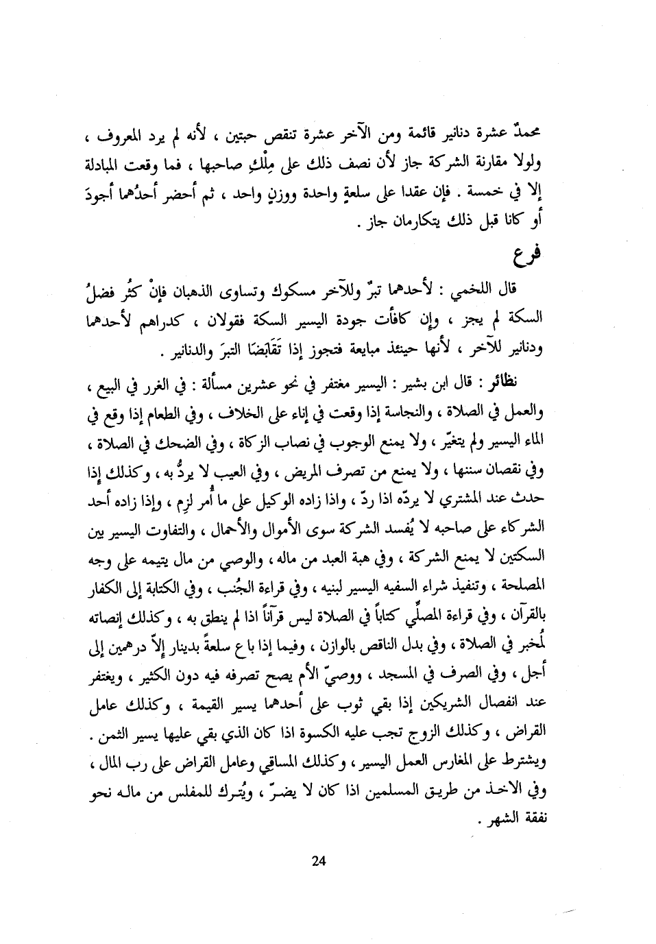 قَالَ اللَّخْمِيُّ: لِأَحَدِهِمَا تبرٌ وَلِلْآخَرِ مَسْكُوكٌ وَتَسَاوَى الذَّهَبَانِ فَإِنْ كثُر فَضْلُ السُّكَّةِ لَمْ يَجُزْ وَإِنْ كَافَأَتْ جَوْدَةُ الْيَسِيرِ السُّكَّةَ فَقَوْلَانِ كَدَرَاهِمَ لِأَحَدِهِمَا وَدَنَانِيرَ لِلْآخَرِ لِأَنَّهَا حِينَئِذٍ مُبَايَعَةٌ فَتَجُوزُ إِذَا تَقَابَضَا التِّبْرَ وَالدَّنَانِيرَ نَظَائِرٌ: قَالَ ابْنُ بَشِيرٍ: الْيَسِيرُ مُغْتَفَرٌ فِي نَحْوِ عِشْرِينَ مَسْأَلَةً: فِي الْغَرَرِ فِي الْبَيْعِ وَالْعَمَلِ فِي الصَّلَاةِ وَالنَّجَاسَةِ إِذَا وَقَعَتْ فِي إِنَاءٍ عَلَى الْخِلَافِ وَفِي الطَّعَامِ إِذَا وَقَعَ فِي الْمَاءِ الْيَسِيرِ وَلَمْ يَتَغَيَّرْ وَلَا يمْنَع الْوُجُوب فِي نِصَاب الزَّكَاة فِي الضَّحِكِ فِي الصَّلَاةِ وَفِي نُقْصَانِ سُنَنِهَا وَلَا يَمْنَعُ مِنْ تَصَرُّفِ الْمَرِيضِ وَفِي الْعَيْبِ لَا يردُّ بِهِ وَكَذَلِكَ إِذا حدث عد المُشْتَرِي لَا يردهُ إِذا رد وَإِذا زَاده الْوَكِيلُ عَلَى مَا أُمر لزِم وَإِذَا زَادَهُ أحد الشُّرَكَاء عل صَاحِبِهِ لَا يُفسد الشَّرِكَةَ سِوَى الْأَمْوَالِ وَالْأَحْمَالِ وَالتَّفَاوُتِ الْيَسِيرِ بَيْنَ السُّكَّتَيْنِ لَا يَمْنَعُ الشَّرِكَةَ وَفِي هِبَةِ الْعَبْدِ مِنْ مَالِهِ وَالْوَصِيِّ مِنْ مَال يتيمه وعَلى وَجْهِ الْمَصْلَحَةِ وَتَنْفِيذِ شِرَاءِ السَّفِيهِ الْيَسِيرِ لِبَنِيهِ وَفِي قِرَاءَةِ الجُنب وَفِي الْكِتَابَةِ إِلَى الْكُفَّارِ بِالْقُرْآنِ وَفِي قِرَاءَةِ الْمُصَلِّي كِتَابًا فِي الصَّلَاةِ لَيْسَ قُرْآنًا إِذَا لَمْ يَنْطِقْ بِهِ وَكَذَلِكَ إِنْصَاتُهُ لمُخبر فِي الصَّلَاةِ وَفِي بَدَلِ النَّاقِصِ بِالْوَازِنِ وَفِيمَا إِذَا بَاعَ سِلْعَةً بِدِينَارٍ إِلَّا دِرْهَمَيْنِ إِلَى أَجَلٍ وَفِي الصَّرْفِ فِي الْمَسْجِدِ وَوَصِيِّ الْأُمِّ يَصِحُّ تَصَرُّفُهُ فِيهِ دُونَ الْكَثِيرِ وَيُغْتَفَرُ عِنْدَ انْفِصَالِ الشَّرِيكَيْنِ إِذَا بَقِيَ ثَوْبٌ عَلَى أَحَدِهِمَا يَسِيرُ الْقِيمَةِ وَكَذَلِكَ عَامِلُ الْقِرَاضِ وَكَذَلِكَ الزَّوْجُ تَجِبُ عَلَيْهِ الْكُسْوَةُ إِذَا كَانَ الَّذِي بَقِيَ عَلَيْهَا يَسِيرَ الثَّمَنِ وَيُشْتَرَطُ عَلَى الْمُغَارِسِ الْعَمَلُ الْيَسِيرُ وَكَذَلِكَ الْمُسَاقِي وَعَامِلُ الْقِرَاضِ عَلَى رَبِّ الْمَالِ وَفِي الْأَخْذِ مِنْ طَرِيقِ الْمُسْلِمِينَ إِذَا كَانَ لَا يَضُرُّ ويُترك لِلْمُفْلِسِ مِنْ مَالِهِ نَحْوُ نَفَقَةِ الشَّهْرِ