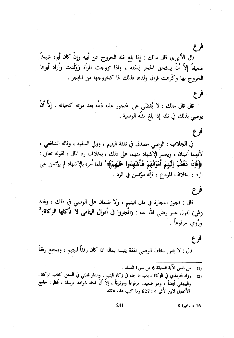 فِي الْجُلَّابِ: الْوَصِيُّ مُصَدَّقٌ فِي نَفَقَةِ الْيَتِيمِ وَوَلِيُّ السَّفِيهِ وَقَالَهُ الشَّافِعِي لِأَنَّهُمَا أَمِينَانِ وَيَعْسُرُ الْإِشْهَادُ مِنْهُمَا عَلَى ذَلِكَ بِخِلَافِ رَدِّ الْمَالِ لِقَوْلِهِ تَعَالَى: {فَإِذَا دَفَعْتُمْ إِلَيْهِمْ أَمْوَالهم فأشهدوا عَلَيْهِم} فَلَمَّا أَمَرَهُ بِالْإِشْهَادِ لَمْ يُؤْتَمَنْ عَلَى الرَّدِّ بِخِلَافِ الْمُودِعِ فَإِنَّهُ مُؤْتَمَنٌ فِي الرَّدِّ