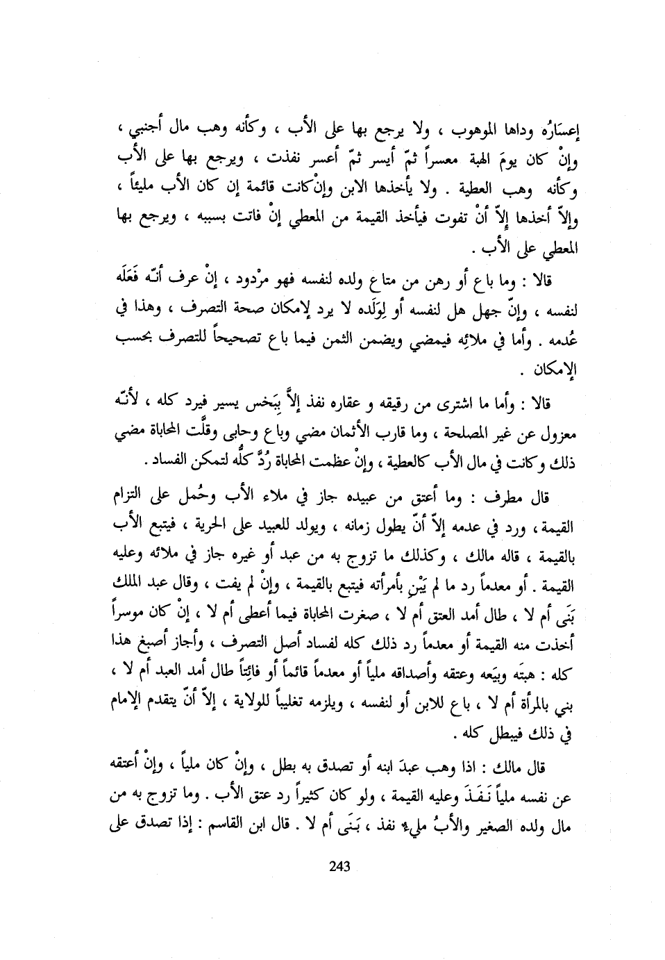 إِعْسَاره وداها الْمَوْهُوبُ وَلَا يَرْجِعُ بِهَا عَلَى الْأَبِ وَكَأَنَّهُ وَهَبَ مَالَ أَجْنَبِيٍّ وَإِنْ كَانَ يَوْمَ الْهِبَةِ مُعْسِرًا ثُمَّ أَيْسَرَ ثُمَّ أَعْسَرَ نُفِّذَتْ وَيَرْجِعُ بِهَا عَلَى الْأَبِ وَكَأَنَّهُ وَهَبَ الْعَطِيَّةَ وَلَا يَأْخُذُهَا الِابْنُ وَإِنْ كَانَتْ قَائِمَةً إِنْ كَانَ الْأَب مليئاً وَإِلَّا أَخذهَا إِلَّا أَنْ تَفُوتَ فَيَأْخُذَ الْقِيمَةَ مِنَ الْمُعْطِي إِنْ فَاتَتْ بِسَبَبِهِ وَيَرْجِعَ بِهَا الْمُعْطِي عَلَى الْأَبِ قَالَا: وَمَا بَاعَ أَوْ رَهَنَ مِنْ مَتَاعِ وَلَدِهِ لِنَفْسِهِ فَهُوَ مَرْدُودٌ إِنْ عُرِفَ أَنَّهُ فَعَلَهُ لِنَفْسِهِ وَإِنْ جُهِلَ هَلْ لِنَفْسِهِ أَو لوَلَده وَلَا يُرَدُّ لِإِمْكَانِ صِحَّةِ التَّصَرُّفِ وَهَذَا فِي عَدَمِهِ وَأَمَّا فِي مَلَائِهِ فَيَمْضِي وَيَضْمَنُ الثَّمَنَ فِيمَا بَاعَ تَصْحِيحًا لِلتَّصَرُّفِ بِحَسَبِ الْإِمْكَانِ قَالَا: وَأَمَّا مَا اشْتَرَى مِنْ رَقِيقِهِ وَعَقَارِهِ نَفَذَ إِلَّا بِبَخْسٍ يَسِيرٍ فَيُرَدُّ كُلُّهُ لِأَنَّهُ مَعْزُولٌ عَنْ غَيْرِ الْمَصْلَحَةِ وَمَا قَارَبَ الْأَثْمَانَ مُضِّيَ وَبَاعَ وَحَابَى وَقَلَّتِ الْمُحَابَاةُ مُضِّيَ ذَلِكَ وَكَانَتْ فِي مَالِ الْأَبِ كَالْعَطِيَّةِ وَإِنْ عَظُمَتِ الْمُحَابَاةُ رُدَّ كُلُّهُ لِتَمَكُّنِ الْفَسَادِ قَالَ مُطَرِّفٌ: وَمَا أُعْتِقَ مِنْ عَبِيدِهِ جَازَ فِي مَلَاءِ الْأَبِ وَحُمِلَ عَلَى الْتِزَامِ الْقِيمَةِ وَرُدَّ فِي عُدْمِهِ إِلَّا أَنْ يَطُولَ زَمَانُهُ وَيُولَدَ لِلْعَبِيدِ عَلَى الْحُرِّيَّةِ فَيُتَّبَعُ الْأَبُ بِالْقِيمَةِ قَالَهُ مَالِكٌ وَكَذَلِكَ مَا تَزَوَّجَ بِهِ مِنْ عَبْدٍ أَوْ غَيْرِهِ جَازَ فِي مَلَائِهِ وَعَلَيْهِ الْقِيمَةُ أَوْ مُعْدِمًا رَدَّ مَا لم بَين بِامْرَأَتِهِ فَيُتَّبَعُ بِالْقِيمَةِ وَإِنْ لَمْ يَفُتْ وَقَالَ عَبْدُ الْمَلِكِ بَنَى أَمْ لَا طَالَ أَمَدُ الْعِتْقِ أَمْ لَا صَغُرَتِ الْمُحَابَاةُ فِيمَا أَعْطَى أَمْ لَا إِنْ كَانَ مُوسِرًا أُخِذَتْ مِنَ الْقِيمَةِ أَوْ مُعْدِمًا رُدَّ ذَلِكَ كُلُّهُ لِفَسَادِ أَصْلِ التَّصَرُّفِ وَأَجَازَ أَصْبَغُ هَذَا كُلَّهُ: هِبَتَهُ وَبيعه وعتقه وأصداقه مَلِيًّا أَو مَعْدُوما قَائِمًا أَوْ فَائِتًا طَالَ أَمَدُ الْعَبْدِ أَمْ لَا بَنَى بِالْمَرْأَةِ أَمْ لَا بَاعَ لِلِابْنِ أَوْ لِنَفْسِهِ وَيَلْزَمُهُ تَغْلِيبًا لِلْوَلَايَةِ إِلَّا أَنْ يَتَقَدَّمَ الْإِمَامُ فِي ذَلِكَ فَيَبْطُلَ كُلُّهُ قَالَ مَالِكٌ: إِذَا وَهَبَ عَبْدٌ ابْنَهُ أَوْ تَصَدَّقَ بِهِ بَطل وَإِن كَانَ مَلِيًّا وَإِن أعْتقهُ عَن نَفسه مَلِيًّا نَفَذَ وَعَلَيْهِ الْقِيمَةُ وَلَوْ كَانَ كَثِيرًا رُدَّ عِتْقُ الْأَبِ وَمَا تَزَوَّجَ بِهِ مِنْ مَالِ وَلَدِهِ الصَّغِيرِ وَالْأَبُ مَلِيءٌ نَفَذَ بَنَى أَمْ لَا قَالَ ابْنُ الْقَاسِمِ: إِذَا تَصَدَّقَ عَلَى