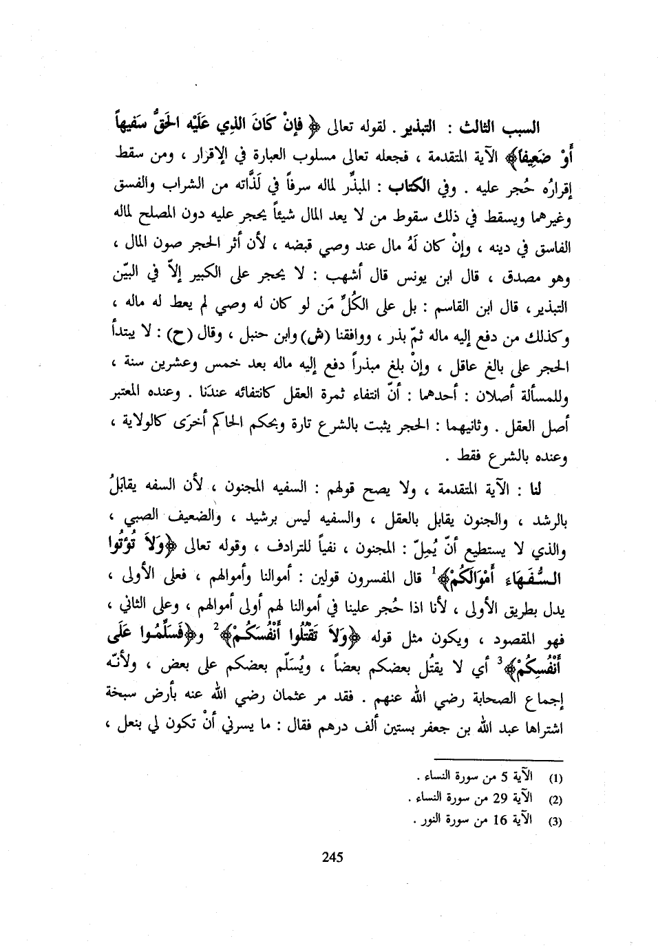 السَّبَبُ الثَّالِثُ: التَّبْذِيرُ لِقَوْلِهِ تَعَالَى: {فَإِنْ كَانَ الَّذِي عَلَيْهِ الْحق سَفِيها أَو ضَعِيفا} الْآيَةَ الْمُتَقَدِّمَةَ فَجَعَلَهُ تَعَالَى مَسْلُوبَ الْعِبَارَةِ فِي الْإِقْرَارِ وَمَنْ سَقَطَ إِقْرَارُهُ حُجِرَ عَلَيْهِ وَفِي الْكِتَابِ الْمُبَذِّرُ لِمَالِهِ سَرَفًا فِي لَذَّاتِهِ مِنَ الشَّرَابِ وَالْفِسْقِ وَغَيْرِهِمَا وَيَسْقُطُ فِي ذَلِكَ سُقُوطَ مَنْ لَا يَعُدُّ الْمَالَ شَيْئًا يُحْجَرُ عَلَيْهِ دُونَ الْمُصْلِحِ لِمَالِهِ الْفَاسِقِ فِي دِينِهِ وَإِنْ كَانَ لَهُ مَالٌ عِنْدَ وَصِيٍّ قَبَضَهُ لِأَنَّ أثر الْحجر صون المَال وَهُوَ مُصدق قَالَ ابْنُ يُونُسَ قَالَ أَشْهَبُ: لَا يُحْجَرُ عَلَى الْكَبِيرِ إِلَّا فِي الْبَيِّنِ التَّبْذِيرِ قَالَ ابْنُ الْقَاسِمِ: بَلْ عَلَى الْكُلِّ مَنْ لَوْ كَانَ لَهُ وَصِيٌّ لَمْ يُعْطَ لَهُ مَالُهُ وَكَذَلِكَ مَنْ دُفِعَ إِلَيْهِ مَالُهُ ثُمَّ بَذَّرَ وَوَافَقَنَا (ش) وَابْنُ حَنْبَلٍ وَقَالَ (ح) : لَا يُبْتَدَأُ الْحَجْرُ عَلَى بَالِغٍ عَاقِلٍ وَإِنْ بَلَغَ مُبَذِّرًا دُفِعَ إِلَيْهِ مَالُهُ بَعْدَ خَمْسٍ وَعِشْرِينَ سَنَةً وَلِلْمَسْأَلَةِ أَصْلَانِ: أَحَدُهُمَا: أَنَّ انْتِفَاءَ ثَمَرَةِ الْعَقْلِ كَانْتِفَائِهِ عِنْدَنَا وَعِنْدَهُ الْمُعْتَبَرُ أَصْلُ الْعَقْلِ وَثَانِيهِمَا: الْحَجْرُ يَثْبُتُ بِالشَّرْعِ تَارَةً وَبِحُكْمِ الْحَاكِمِ أُخْرَى كَالْوَلَايَةِ وَعِنْدَهُ بِالشَّرْعِ فَقَطْ لَنَا: الْآيَةُ الْمُتَقَدِّمَةُ وَلَا يَصِحُّ قَوْلُهُمْ: السَّفِيهُ الْمَجْنُونُ لِأَنَّ السَّفَهَ يُقَابَلُ بِالرُّشْدِ وَالْجُنُونَ يُقَابَلُ بِالْعَقْلِ وَالسَّفِيهُ لَيْسَ بِرَشِيدٍ وَالضَّعِيفُ الصَّبِيُّ وَالَّذِي لَا يَسْتَطِيعُ أَنْ يُمِلَّ: الْمَجْنُونُ نَفْيًا لِلتَّرَادُفِ وقَوْله تَعَالَى: {وَلَا تُؤْتوا السُّفَهَاء أَمْوَالكُم} قَالَ الْمُفَسِّرُونَ قَوْلَيْنِ: أَمْوَالنَا وَأَمْوَالهمْ فعلى الأولى لَهُم أولى يَدُلُّ بِطَرِيقِ الْأَوْلَى لِأَنَّا إِذَا حُجِرَ عَلَيْنَا فِي أَمْوَالِنَا لَهُمْ أَوْلَى أَمْوَالِهِمْ وَعَلَى الثَّانِي فَهُوَ الْمَقْصُودُ وَيَكُونُ مِثْلَ قَوْلِهِ: {وَلا تَقْتُلُوا أَنفسكُم} و {فَسَلمُوا على أَنفسكُم} أَيْ لَا يَقْتُلْ بَعْضُكُمْ بَعْضًا وَيُسَلِّمُ بَعْضُكُمْ عَلَى بَعْضٍ وَلِأَنَّهُ إِجْمَاعُ الصَّحَابَةِ رَضِيَ اللَّهُ عَنْهُمْ فَقَدْ مَرَّ عُثْمَانُ رَضِيَ اللَّهُ عَنْهُ بِأَرْضٍ سَبِخَةٍ اشْتَرَاهَا عَبْدُ اللَّهِ بْنُ جَعْفَرٍ بِسِتِّينَ أَلْفَ دِرْهَمٍ فَقَالَ: مَا يَسُرُّنِي أَنْ تَكُونَ لِي بِنَعْلٍ