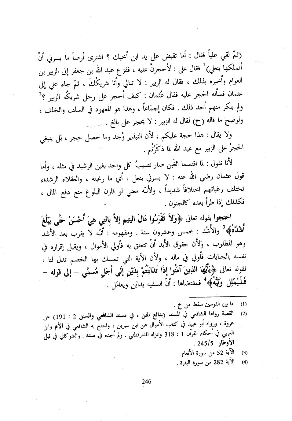 (ثُمَّ لَقِيَ عَلِيًّا فَقَالَ: أَمَا تَقْبِضُ عَلَى يَدِ ابْنِ أَخِيكَ؟ اشْتَرَى أَرْضًا مَا يَسُرُّنِي أَنْ أَتَمَلَّكَهَا بِنَعْلِي) فَقَالَ عَلِيٌّ: لَأَحْجُرَنَّ عَلَيْهِ فَفَزِعَ عَبْدُ اللَّهِ بْنُ جَعْفَرٍ إِلَى الزُّبَيْرِ بْنِ الْعَوَّامِ وَأَخْبَرَهُ بِذَلِكَ فَقَالَ لَهُ الزُّبَيْرُ: لَا تبالي وَأَنَا شَرِيكُكَ ثُمَّ جَاءَ عَلِيٌّ إِلَى عُثْمَانَ فَسَأَلَهُ الْحَجْرَ عَلَيْهِ فَقَالَ عُثْمَانُ: كَيْفَ أَحْجُرُ عَلَى رَجُلٍ شَرِيكُهُ الزُّبَيْرُ؟ وَلَمْ يُنْكِرْ مِنْهُمْ أَحَدٌ ذَلِكَ فَكَانَ إِجْمَاعًا وَهَذَا هُوَ الْمَعْهُودُ فِي السَّلَفِ وَالْخَلَفِ وَلَوْ صَحَّ مَا قَالَهُ (ح) لَقَالَ لَهُ الزُّبَيْرُ: لَا يُحْجَرُ عَلَى بَالِغٍ وَلَا يُقَالُ: هَذَا حُجَّةٌ عَلَيْكُمْ لِأَنَّ التَّبْذِيرَ وُجِدَ وَمَا حَصَلَ حَجْرٌ بَلْ يَنْبَغِي الْحَجْرُ عَلَى الزُّبَيْرِ مَعَ عَبْدِ اللَّهِ لِمَا ذَكَرْتُمْ لِأَنَّا نَقُولُ: لَمَّا اقْتَسَمَا الْغَبْنَ صَارَ نصيب كل وَاحِد بعبن الرَّشِيدِ فِي مِثْلِهِ وَأَمَّا قَوْلُ عُثْمَانَ رَضِيَ اللَّهُ عَنْهُ: لَا يَسُرُّنِي بِنَعْلٍ أَيْ مَا رَغِبْتُهُ وَالْعُقَلَاءُ الرُّشَدَاءُ تَخْتَلِفَ رَغَبَاتُهُمُ اخْتِلَافًا شَدِيدًا وَلِأَنَّهُ مَعْنِيٌّ لَوْ قَارَنَ الْبُلُوغَ مُنِعَ دَفْعَ الْمَالِ فَكَذَلِكَ إِذَا طَرَأَ بَعْدَهُ كَالْجُنُونِ احْتَجُّوا بِقَوْلِهِ تَعَالَى: {وَلا تَقْرَبُوا مَالَ الْيَتِيمِ إِلا بِالَّتِي هِيَ أحسن حَتَّى يبلغ أشده} وَالْأَشُدُّ: خَمْسٌ وَعِشْرُونَ سَنَةً وَمَفْهُومُهُ: أَنَّهُ لَا يُقْرَبُ بَعْدَ الْأَشُدِّ وَهُوَ الْمَطْلُوبُ وَلِأَنَّ حُقُوقَ الْأَبَد أَن تَتَعَلَّقَ بِهِ فَأَوْلَى الْأَمْوَالُ وَيُقْبَلُ إِقْرَارُهُ فِي نَفْسِهِ بِالْجِنَايَاتِ فَأَوْلَى فِي مَالِهِ وَلِأَنَّ الْآيَةَ الَّتِي تَمَسَّكَ بِهَا الْخَصْمُ تَدُلُّ لَنَا لِقَوْلِهِ تَعَالَى {يَا أَيُّهَا الَّذِينَ آمَنُوا إِذَا تَدَايَنْتُمْ بدين إِلَى أجل مُسَمّى} إِلَى قَوْله تَعَالَى {فليملل وليه} فمقتضاها: أَنَّ السَّفِيهَ يُدَايِنُ وَيُعَامِلُ