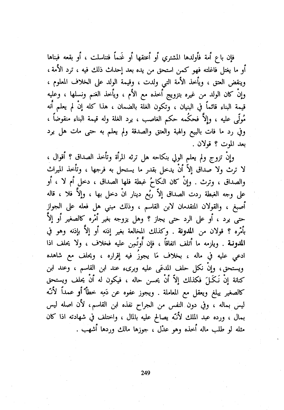 فَإِنْ بَاعَ أَمَةً فَأَوَلَدَهَا الْمُشْتَرِي أَوْ أَعْتَقَهَا أَوْ غَنَمًا فَتَنَاسَلَتْ أَوْ بُقْعَةً فَبَنَاهَا أَوْ مَا يُغْتَلُّ فَاغْتَلَّهُ فَهُوَ كَمَنِ اسْتَحَقَّ مِنْ يَدِهِ بَعْدَ إِحْدَاثِ ذَلِكَ فِيهِ تُرَدُّ الْأَمَةُ وينقض الْعتْق وَيَأْخُذ الْأمة الَّتِي ولدت وفقيمة الْوَلَدِ عَلَى الْخِلَافِ الْمَعْلُومِ وَإِنْ كَانَ الْوَلَدُ مِنْ غَيْرِهِ بِتَزْوِيجٍ أَخَذَهُ مَعَ الْأُمِّ وَيَأْخُذُ الْغَنَمَ وَنَسْلَهَا وَعَلَيْهِ قِيمَةُ الْبِنَاءِ قَائِمًا فِي الْبُنْيَانِ وَتَكُونُ الْغَلَّةُ بِالضَّمَانِ هَذَا كُلُّهُ إِنْ لَمْ يَعْلَمْ أَنَّهُ مُوَلًّى عَلَيْهِ وَإِلَّا فَحُكْمُهُ حُكْمُ الْغَاصِبِ يَرُدُّ الْغَلَّةَ وَلَهُ قِيمَةُ الْبِنَاءِ مَنْقُوضًا وَفِي رَدِّ مَا فَاتَ بِالْبَيْعِ وَالْهِبَةِ وَالْعِتْقِ وَالصَّدَقَةِ وَلَمْ يَعْلَمْ بِهِ حَتَّى مَاتَ هَلْ يُرَدُّ بَعْدَ الْمَوْتِ؟ قَوْلَانِ وَإِنْ تَزَوَّجَ وَلَمْ يَعْلَمِ الْوَلِيُّ بِنِكَاحِهِ هَلْ تَرِثُهُ الْمَرْأَةُ وَتَأْخُذُ الصَّدَاقَ؟ أَقْوَالٌ لَا تَرِثُ وَلَا صَدَاقَ إِلَّا أَن يدْخل بِقدر مَا يَسْتَحِيل بِهِ فرجهَا وَتَأْخُذ الْمِيرَاث وَالصَّدَاق وترث وَإِنْ كَانَ النِّكَاحُ غِبْطَةً فَلَهَا الصَّدَاقُ دَخَلَ أَمْ لَا أَوْ عَلَى وَجْهِ الْغِبْطَةِ رَدَّتِ الصَّدَاقَ إِلَّا رُبُعَ دِينَارٍ إِنْ دَخَلَ بِهَا وَإِلَّا فَلَا قَالَهُ أَصْبَغُ وَالْقَوْلَانِ الْمُتَقَدِّمَانِ لِابْنِ الْقَاسِمِ وَذَلِكَ مَبْنِيٌّ هَلْ فِعْلُهُ عَلَى الْجَوَازِ حَتَّى يُرَدَّ أَوْ عَلَى الرَّدِّ حَتَّى يُجَازَ وَهَلْ يُزَوِّجُهُ بِغَيْرِ أَمْرِهِ كَالصَّغِيرِ أَوْ إِلَّا بِأَمْرِهِ؟ قَوْلَانِ مِنَ الْمُدَوَّنَةِ وَكَذَلِكَ الْمُخَالَعَةُ بِغَيْرِ إِذْنِهِ أَوْ إِلَّا بِإِذْنِهِ وَهُوَ فِي الْمُدَوَّنَةِ وَيلْزمهُ مَا أتلف اتِّفَاقًا فَإِن أُوتُمِنَ عَلَيْهِ فَخِلَافٌ وَلَا يَحْلِفُ إِذَا ادُّعِيَ عَلَيْهِ فِي مَالِهِ بِخِلَافِ مَا يَجُوزُ فِيهِ إِقْرَارُهُ وَيَحْلِفُ مَعَ شَاهِدِهِ وَيَسْتَحِقُّ وَإِنْ نَكَلَ حَلَفَ الْمُدَّعَى عَلَيْهِ وَبَرِئَ عِنْدَ ابْنِ الْقَاسِمِ وَعِنْدَ ابْنِ كِنَانَةَ إِنْ نَكَلَ فَكَذَلِكَ إِلَّا أَنْ يَحْسُنَ حَالُهُ فَيَكُونَ لَهُ أَنْ يَحْلِفَ وَيَسْتَحِقَّ كَالصَّغِيرِ يَبْلُغُ وَيَعْقِلُ مَعَ الْمُعَامَلَةِ وَيَجُوزُ عَفْوُهُ عَنْ دَمِهِ خَطَأً أَوْ عَمْدًا لِأَنَّهُ لَيْسَ بِمَالِهِ وَفِي دُونَ النَّفْسِ مِنَ الْجِرَاحِ نَفَّذَهُ ابْنُ الْقَاسِمِ لِأَنَّ أَصْلَهُ لَيْسَ بِمَالٍ وَرَدَّهُ عَبْدُ الْمَلِكِ لِأَنَّهُ يُصَالَحُ عَلَيْهِ بِالْمَالِ وَاخْتُلِفَ فِي شَهَادَتِهِ إِذَا كَانَ مِثْلُهُ لَوْ طُلِبَ مَالُهُ أَخَذَهُ وَهُوَ عَدْلٌ جَوَّزَهَا مَالِكٌ وَرَدَّهَا أَشهب