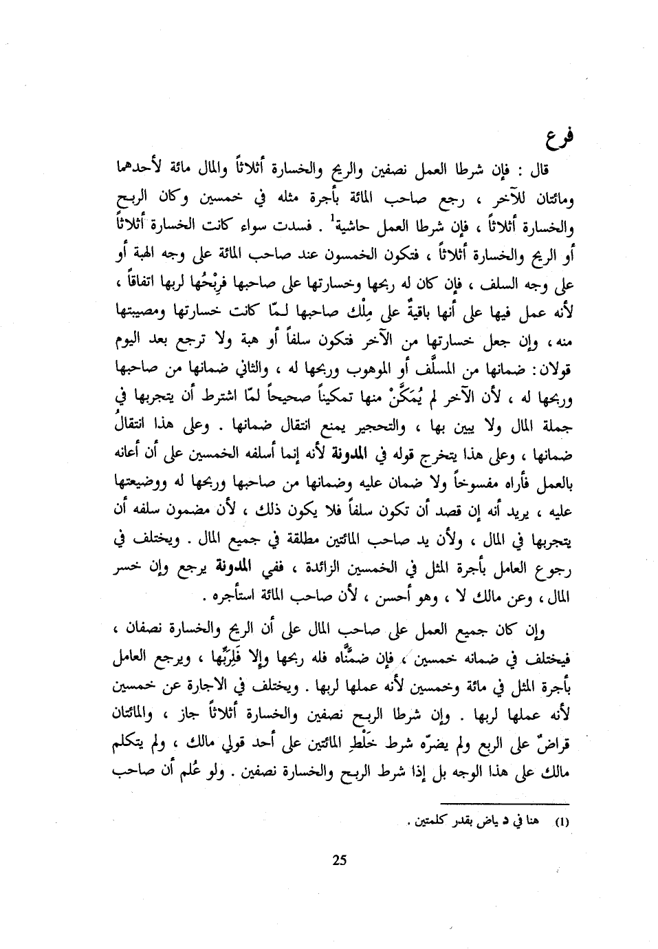 قَالَ: فَإِنْ شَرَطَا الْعَمَلَ نِصْفَيْنِ وَالرِّبْحَ وَالْخَسَارَةَ أَثْلَاثًا وَالْمَالَ مِائَةٌ لِأَحَدِهِمَا وَمِائَتَانِ لِلْآخَرِ رَجَعَ صَاحِبُ الْمِائَةِ بِأُجْرَةِ مِثْلِهِ فِي خَمْسِينَ وكا الرِّبْح والخسارة أَثلَاثًا فَإِن شرطا الْعَمَل حَاشِيَة فَسَدَتْ سَوَاءٌ كَانَتِ الْخَسَارَةُ أَثْلَاثًا أَوِ الرِّبْحُ وَالْخَسَارَةُ أَثْلَاثًا فَتَكُونُ الْخَمْسُونَ عِنْدَ صَاحِبِ الْمِائَةِ عَلَى وَجْهِ الْهِبَةِ أَوْ عَلَى وَجْهِ السَّلَفِ فَإِنْ كَانَ لَهُ رِبْحُهَا وَخَسَارَتُهَا عَلَى صَاحِبِهَا فرِبحُها لِرَبِّهَا اتِّفَاقًا لِأَنَّهُ عَمِلَ فِيهَا عَلَى أَنَّهَا باقيةٌ عَلَى مِلْكِ صَاحِبِهَا لَمَّا كَانَتْ خَسَارَتُهَا وَمُصِيبَتُهَا مِنْهُ وَإِنْ جَعَلَ خَسَارَتَهَا مِنَ الْآخَرِ فَتَكُونُ سَلَفًا أَوْ هِبَةً وَلَا تَرْجِعُ بعد الْيَوْم قَولَانِ: ضَمَانُهَا مِنَ الْمُسَلِّفِ أَوِ الْمَوْهُوبِ وَرِبْحُهَا لَهُ وَالثَّانِي ضَمَانهَا من صَاحبهَا وربحها لَهُ لأ الْآخَرَ لَمْ يُمكن مِنْهَا تَمْكِينًا صَحِيحًا لَمَّا اشْترط أَن تيجربها فِي جُمْلَةِ الْمَالِ وَلَا يَبِينُ بِهَا وَالتَّحْجِيرُ يَمْنَعُ انْتِقَالَ ضَمَانِهَا وَعَلَى هَذَا انْتِقَالُ ضَمَانِهَا وَعَلَى هَذَا يَتَخَرَّجُ قَوْلُهُ فِي الْمُدَوَّنَةِ لِأَنَّهُ إِنَّمَا أَسْلَفَهُ الْخَمْسِينَ عَلَى أَنْ أَعَانَهُ بِالْعَمَلِ فَأَرَاهُ مَفْسُوخًا وَلَا ضَمَانَ عَلَيْهِ وَضَمَانُهَا مِنْ صَاحبهَا وربحها لَهُ ووضعيتها عَلَيْهِ وَيُرِيد أَنَّهُ إِنْ قَصَدَ أَنْ تَكُونَ سَلَفًا فَلَا يكون ذَلِك لِأَن مَضْمُون سلفه أَن يتجربها فِي الْمَالِ وَلِأَنَّ يَدَ صَاحِبِ الْمِائَتَيْنِ مُطْلَقَةٌ فِي جَمِيعِ الْمَالِ وَيُخْتَلَفُ فِي رُجُوعِ الْعَامِلِ بِأُجْرَةِ الْمِثْلِ فِي الْخَمْسِينَ الزَّائِدَةِ فَفِي الْمُدَوَّنَةِ يَرْجِعُ وَإِنْ خَسِرَ الْمَالَ وَعَنْ مَالِكٍ لَا وَهُوَ أَحْسَنُ لِأَنَّ صَاحِبَ الْمِائَةِ اسْتَأْجَرَهُ وَإِنْ كَانَ جَمِيعُ الْعَمَلِ عَلَى صَاحِبِ الْمَالِ عَلَى أَنَّ الرِّبْحَ وَالْخَسَارَةَ نِصْفَانِ فَيُخْتَلَفُ فِي ضَمَانِهِ خَمْسِينَ فَإِنْ ضمنَّاه فَلَهُ رِبْحُهَا وَإِلَّا فلِرَبِّها وَيَرْجِعُ الْعَامِلُ بِأُجْرَةِ الْمِثْلِ فِي مِائَةٍ وَخَمْسِينَ لِأَنَّهُ عَمِلَهَا لِرَبِّهَا وَيُخْتَلَفُ فِي الْإِجَارَةِ عَنْ خَمْسِينَ لِأَنَّهُ عَمِلَهَا لِرَبِّهَا وَإِنْ شَرِطَا الرِّبْحَ نِصْفَيْنِ وَالْخَسَارَةَ أَثْلَاثًا جَازَ وَالْمِائَتَانِ قراضٌ عَلَى الرُّبُعِ وَلَمْ يَضُرَّهُ شَرْطُ خَلْطِ الْمِائَتَيْنِ عَلَى أَحَدِ قَوْلَيْ مَالِكٍ وَلَمْ يَتَكَلَّمْ مَالِكٌ عَلَى هَذَا الْوَجْهِ بَلْ إِذَا شَرَطَ الرِّبْحَ وَالْخَسَارَةَ نِصْفَيْنِ وَلَوْ عُلم أَنَّ صَاحِبَ