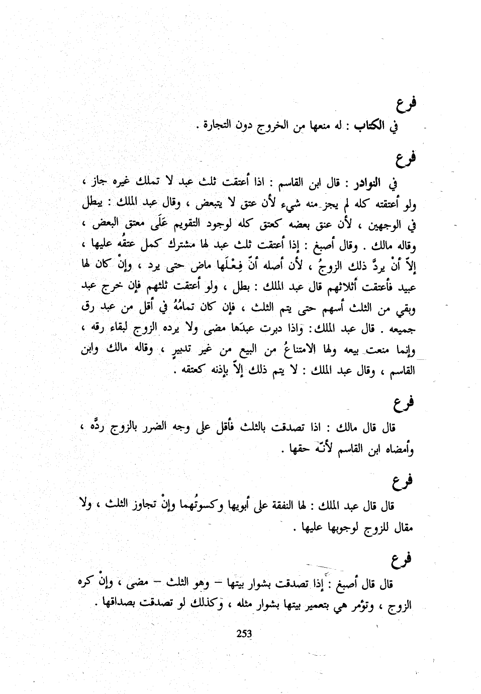 فِي النَّوَادِرِ: قَالَ ابْنُ الْقَاسِمِ: إِذَا أَعْتَقَتْ ثُلُثَ عَبْدٍ لَا تَمْلِكُ غَيْرَهُ جَازَ وَلَوْ أَعْتَقَتْهُ كُلَّهُ لَمْ يَجُزْ مِنْهُ شَيْء لِأَن عتق لَا يَتَبَعَّضُ وَقَالَ عَبْدُ الْمَلِكِ: يَبْطُلُ فِي الْوَجْهَيْنِ لِأَن عتق بعضه كتعق كُله لوُجُود التَّقْوِيمِ عَلَى مُعْتِقِ الْبَعْضِ وَقَالَهُ مَالِكٌ وَقَالَ أَصْبَغُ: إِذَا أَعْتَقَتْ ثُلُثَ عَبْدٍ لَهَا مُشْتَرَكٍ كَمُلَ عِتْقُهُ عَلَيْهَا إِلَّا أَنْ يردَّ ذَلِكَ الزَّوْجُ لِأَنَّ أَصْلَهُ أَنَّ فِعلها مَاضٍ حَتَّى يُرَدَّ وَإِنْ كَانَ لَهَا عَبِيدٌ فَأَعْتَقَتْ أَثَلَاثَهُمْ قَالَ عَبْدُ الْمَلِكِ: بَطَلَ وَلَوْ أَعْتَقَتْ ثُلُثَهُمْ فَإِنْ خَرَجَ عَبْدٌ وَبَقِيَ مِنَ الثُّلُثِ أَسْهَمَ حَتَّى يَتِمَّ الثُّلُثُ فَإِنْ كَانَ تَمَامُهُ فِي أَقَلَّ مِنْ عَبْدٍ رُقَّ جَمِيعُهُ قَالَ عَبْدُ الْمَلِكِ: وَإِذَا دَبَّرَتْ عَبْدَهَا مَضَى وَلَا يَرُدُّهُ الزَّوْجُ لِبَقَاءِ رِقِّهِ وَإِنَّمَا مُنِعَتْ بَيْعَهُ وَلَهَا الِامْتِنَاعُ مِنَ الْبَيْعِ مِنْ غَيْرِ تَدْبِيرٍ وَقَالَهُ مَالك وَابْن الْقَاسِم وَقَالَ عبد الْملك: لايتم ذَلِكَ إِلَّا بِإِذْنِهِ كَعِتْقِهِ