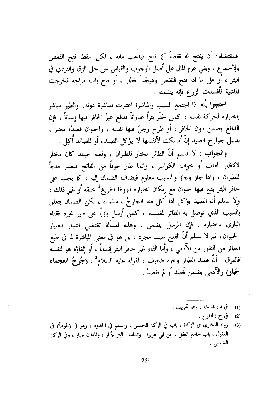 فمقتضاه: أَن لَهُ يفتح قَفَصًا كَمَا فَتَحَ فَيَذْهَبُ مَالُهُ لَكِنْ سَقَطَ فَتْحُ الْقَفَصِ بِالْإِجْمَاعِ وَبَقِيَ غُرْمُ الْمَالِ عَلَى أَصْلِ الْوُجُوبِ وَالْقِيَاسُ عَلَى حَلِّ الزِّقِّ وَالتَّرَدِّي فِي الْبِئْرِ أَوْ عَلَى مَا إِذَا فَتَحَ الْقَفَصَ وَهَيَّجَهُ فَطَارَ أَوْ فَتَحَ بَابَ مُرَاحِهِ فَخَرَجَتِ الْمَاشِيَةُ فَأَفْسَدَتِ الزَّرْعَ فَإِنَّهُ يَضْمَنُهُ احْتَجُّوا بِأَنَّهُ إِذَا اجْتَمَعَ السَّبَبُ وَالْمُبَاشَرَةُ اعْتُبِرَتِ الْمُبَاشَرَةُ دُونَهُ وَالطَّيْرُ مُبَاشِرٌ بِاخْتِيَارِهِ لِحَرَكَةِ نَفْسِهِ كَمَنْ حَفَرَ بِئْرًا عُدْوَانًا فَدَفَعَ غَيْرُ الْحَافِرِ فِيهَا إنْسَانا فَإِن لدافع يَضْمَنُ دُونَ الْحَافِرِ أَوْ طَرَحَ رَجُلٌ فِيهَا نَفْسَهُ وَالْحَيَوَانُ قَصْدُهُ مُعْتَبَرٌ بِدَلِيلِ جَوَارِحِ الصَّيْدِ إِنْ أَمْسَكَتْ لِأَنْفُسِهَا لَا يُؤْكَلُ الصَّيْدُ أَوْ لِلصَّائِدِ أُكِلَ وَالْجَوَابُ: لَا نُسَلِّمُ أَنَّ الطَّائِرَ مُخْتَارٌ لِلطَّيَرَانِ وَلَعَلَّهُ حِينَئِذٍ كَانَ يَخْتَارُ لِانْتِظَارِ الْعلف أَو خوف الكواسر وَإِمَّا طَارَ خَوْفًا مِنَ الْفَاتِحِ فَيَصِيرُ مُلْجَأً لِلطَّيَرَانِ وَإِذَا جَازَ وَجَازَ وَالتَّسَبُّبُ مَعْلُومٌ فَيُضَافُ الضَّمَانُ إِلَيْهِ كَمَا يَجِبُ عَلَى حَافِرِ الْبِئْرِ يَقَعُ فِيهَا حَيَوَانٌ مَعَ إِمْكَانِ اخْتِيَارِهِ لِنُزُولِهَا لِتَفْرِيخِ خَلْقِهِ أَوْ غَيْرِ ذَلِكَ وَلَا نُسَلِّمُ أَنَّ الصَّيْد يُؤْكَلُ إِذَا أَكَلَ مِنْهُ الْجَارِحُ سَلَّمْنَاهُ لَكِنَّ الضَّمَانَ يَتَعَلَّقُ بِالسَّبَبِ الَّذِي تَوَصَّلَ بِهِ الطَّائِرُ لِمَقْصِدِهِ كَمَنْ أَرْسَلَ بَازِيًّا عَلَى طَيْرِ غَيْرِهِ فَقَتَلَهُ الْبَازِيُّ بِاخْتِيَارِهِ فَإِنَّ الْمُرْسِلَ يَضْمَنُ وَهَذِهِ الْمَسْأَلَةُ تَقْتَضِي اعْتِبَارَ اخْتِيَارِ الْحَيَوَانِ ثُمَّ لَا نُسَلِّمُ أَنَّ الْفَتْحَ سَبَبٌ مُجَرَّدٌ بَلْ هُوَ فِي مَعْنَى الْمُبَاشَرَةِ لِمَا فِي طَبْعِ الطَّائِرِ مِنَ النُّفُورِ مِنَ الْآدَمِيِّ وَأَمَّا إِلْقَاءُ غَيْرِ حَافِرِ الْبِئْرِ إِنْسَانًا أَوْ إِلْقَاؤُهُ هُوَ لِنَفْسِهِ فَالْفَرْقُ: أَنَّ قَصْدَ الطَّائِرِ وَنَحْوِهِ ضَعِيفٌ لِقَوْلِهِ عَلَيْهِ السَّلَامُ: (جُرْحُ الْعَجْمَاءِ جُبَارٌ) وَالْآدَمِيُّ يَضْمَنْ قَصَدَ أَوْ لَمْ يَقْصِدْ