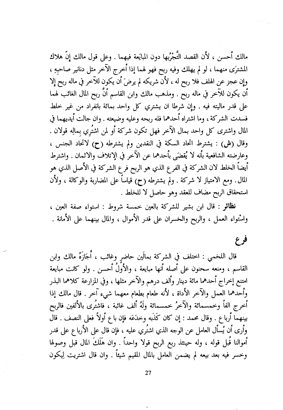 ُ فَرْعُ الشَّرِكَةِ فِي الْأَصْلِ الَّذِي هُوَ الْمَالُ وَمَعَ الِامْتِيَازِ لَا شَرِكَةَ وَلَمْ يَشْتَرِطْهُ (ح) قِيَاسًا عَلَى الْمُضَارَبَةِ وَالْوَكَالَةِ وَلِأَنَّ اسْتِحْقَاقَ الرِّبْحِ مُضَافٌ لِلْعَقْدِ وَهُوَ حَاصِلٌ لَا لِلْخَلْطِ نَظَائِرٌ: قَالَ ابْنُ بَشِيرٍ لِلشَّرِكَةِ بِالْعَيْنِ خَمْسَةُ شُرُوطٍ: اشتواء صِفَةِ الْعَيْنِ وَاسْتِوَاءُ الْعَمَلِ وَالرِّبْحِ وَالْخُسْرَانِ عَلَى قَدْرِ الْأَمْوَالِ وَالْمَالُ بَيْنَهُمَا عَلَى الْأَمَانَةِ