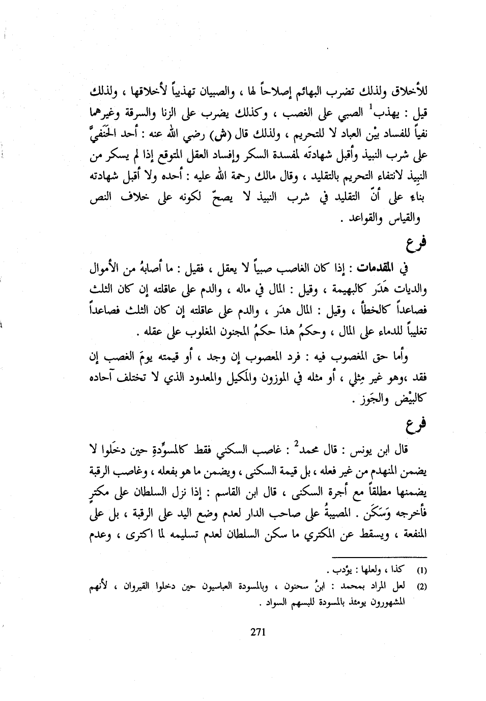 فِي الْمُقَدِّمَاتِ: إِذَا كَانَ الْغَاصِبُ صَبِيًّا لَا يَعْقِلُ فَقِيلَ: مَا أَصَابَهُ مِنَ الْأَمْوَالِ وَالدِّيَاتِ هَدْرٌ كَالْبَهِيمَةِ وَقِيلَ: الْمَالُ فِي مَالِهِ وَالدَّمُ عَلَى عَاقِلَتِهِ إِنْ كَانَ الثُّلُثَ فَصَاعِدًا كَالْخَطَأِ وَقِيلَ: الْمَالُ هَدْرٌ وَالدَّمُ عَلَى عَاقِلَتِهِ إِنْ كَانَ الثُّلُثَ فَصَاعِدًا تَغْلِيبًا لِلدِّمَاءِ عَلَى الْمَالِ وَحُكْمُ هَذَا حُكْمُ الْمَجْنُونِ الْمَغْلُوبِ عَلَى عقله وَأما حق الْمَغْصُوب فِيهِ: فَرد المعصوب إِنْ وُجِدَ أَوْ قِيمَتِهِ يَوْمَ الْغَصْبِ إِنْ فُقِدَ وَهُوَ غَيْرُ مِثْلِيٍّ أَوْ مِثْلِهِ فِي الْمَوْزُونِ وَالْمَكِيلِ وَالْمَعْدُودِ الَّذِي لَا تَخْتَلِفُ آحَادُهُ كَالْبَيْضِ وَالْجَوْزِ