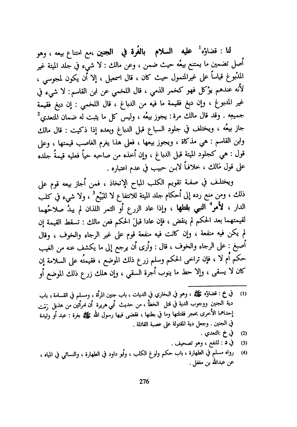 لَنَا قَضَاؤُهُ عَلَيْهِ السَّلَامُ بِالْغُرَّةِ فِي الْجَنِينِ مَعَ امْتِنَاعِ بَيْعِهِ وَهُوَ أَصْلُ تَضْمِينِ مَا يَمْتَنِعُ بَيْعُهُ حَيْثُ ضُمِنَ وَعَنْ مَالِكٍ لَا شَيْءَ فِي جِلْدِ الْمَيْتَةِ غَيْرِ الْمَدْبُوغِ قِيَاسًا عَلَى غَيْرِ الْمُتَمَوَّلِ حَيْثُ كَانَ قَالَ إِسْمَاعِيلُ إِلَّا أَنْ يَكُونَ لِمَجُوسِيٍّ لِأَنَّهُ عِنْدَهُمْ يُؤْكَلُ فَهُوَ كَخَمْرِ الذِّمِّيِّ قَالَ اللَّخْمِيُّ عَنِ ابْنِ الْقَاسِمِ لَا شَيْءَ فِي غَيْرِ الْمَدْبُوغِ وَإِنْ دُبِغَ فَقِيمَةُ مَا فِيهِ مِنَ الدِّبَاغِ قَالَ اللَّخْمِيُّ: إِنْ دُبِغَ فَقِيمَةُ جَمِيعِهِ وَقَدْ قَالَ مَالِكٌ مَرَّةً: يَجُوزُ بَيْعُهُ وَلَيْسَ كُلُّ مَا يَثْبُتُ لَهُ ضَمَانُ الْمُتَعَدِّي جَازَ بَيْعُهُ وَيُخْتَلَفُ فِي جُلُودِ السِّبَاعِ قَبْلَ الدِّبَاغِ وَبَعْدَهُ إِذَا ذُكِّيَتْ: قَالَ مَالِكٌ وَابْنُ الْقَاسِمِ: هِيَ مُذَكَّاةٌ وَيَجُوزُ بَيْعُهَا فَعَلَى هَذَا يَغْرَمُ الْغَاصِبُ قِيمَتَهَا وَعَلَى قَوْلٍ: هِيَ كَجُلُودِ الْمَيْتَةِ قَبْلَ الدِّبَاغِ وَإِنْ أَخَذَهُ مِنْ صَاحِبِهِ حَيًّا فَعَلَيْهِ قِيمَةُ جِلْدِهِ عَلَى قَوْلِ مَالِكٍ خِلَافًا لِابْنِ حَبِيبٍ فِي عَدَمِ اعْتِبَارِهِ وَيُخْتَلَفُ فِي صِفَةِ تَقْوِيمِ الْكَلْبِ الْمُبَاحِ الِاتِّخَاذِ فَمَنْ أَجَازَ بَيْعَهُ قَوَّمَ عَلَى ذَلِكَ وَمَنْ مَنَعَ رَدَّهُ إِلَى أَحْكَامِ جلد الْميتَة للِانْتِفَاع لَا للْبيع وَلَا شَيْءَ فِي كَلْبِ الدَّارِ لِأَمْرِ النَّبِيِّ بِقَتْلِهَا وَإِذَا عَادَ الزَّرْعُ أَوِ الثَّمَرُ اللَّذَانِ لَمْ يَبْدُ صَلَاحُهُمَا لِقِيمَتِهِمَا بَعْدَ الْحُكْمِ لَمْ ينْقض فَإِن عَاد قَبْلَ الْحُكْمِ فَعَنْ مَالِكٍ: تَسْقُطُ الْقِيمَةُ إِنْ لَمْ يَكُنْ فِيهِ مَنْفَعَةٌ وَإِنْ كَانَتْ فِيهِ مَنْفَعَةُ قَوْمٍ عَلَى غَيْرِ الرَّجَاءِ وَالْخَوْفِ وَقَالَ أَصْبَغُ: عَلَى الرَّجَاءِ وَالْخَوْفِ قَالَ: وَأَرَى أَنْ يُرْجَعَ إِلَى مَا يُكْشَفُ عَنْهُ مِنَ الْغَيْبِ حُكِمَ أَمْ لَا فَإِنْ تَرَاخَى الْحُكْمُ وَسَلَّمَ زَرْعَ ذَلِكَ الْمَوْضِعِ فَقِيمَتُهُ عَلَى السَّلَامَةِ إِنْ كَانَ لَا يُسْقَى وَإِلَّا حَطَّ مَا يَنُوبُ أُجْرَةَ السَّقْيِ وَإِنْ هَلَكَ زَرْعُ ذَلِكَ الْمَوْضِعِ أَو