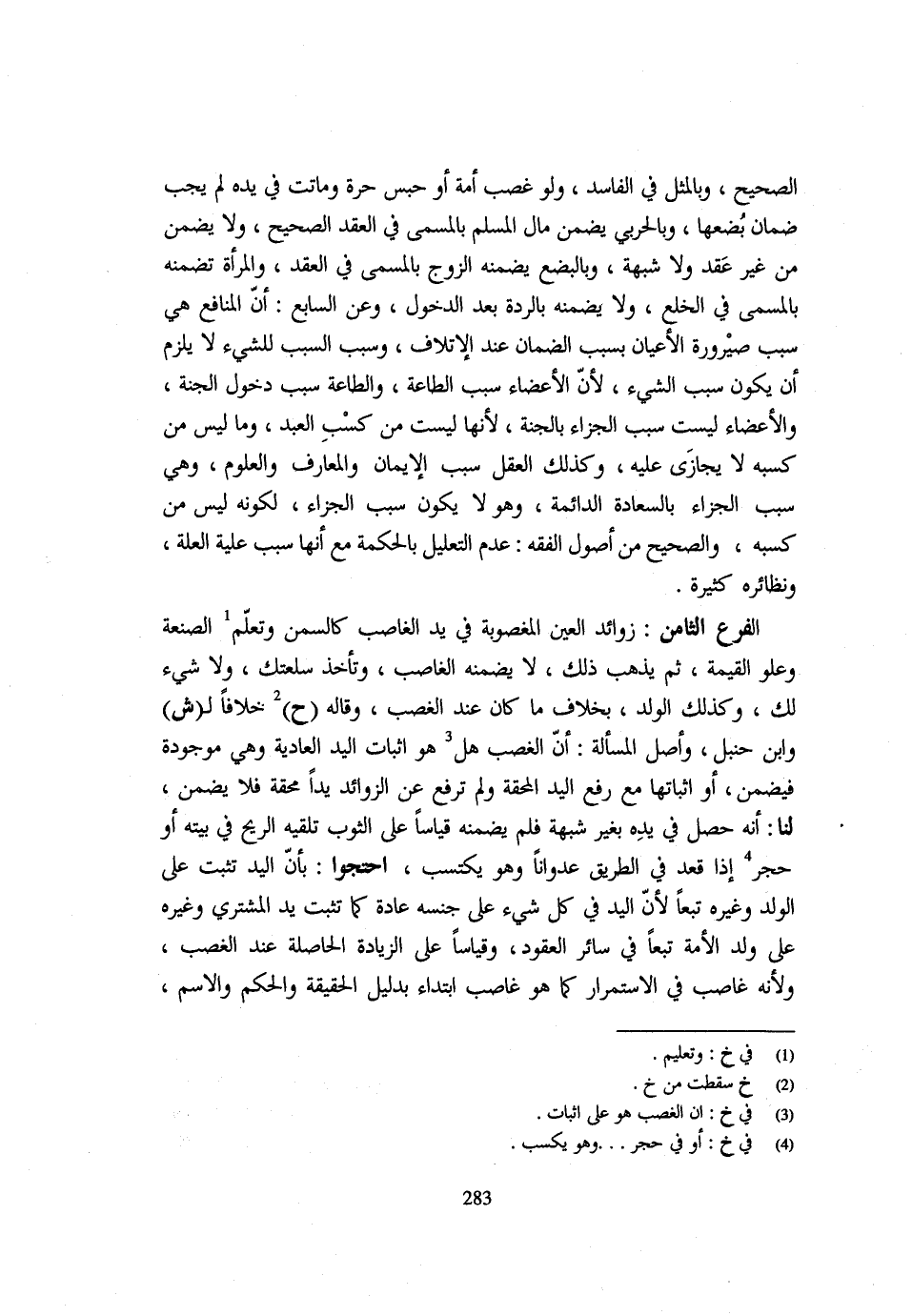 الصَّحِيحِ وَبِالْمِثْلِ فِي الْفَاسِدِ وَلَوْ غَصَبَ أَمَةً أَوْ حَبَسَ حُرَّةً وَمَاتَتْ فِي يَدِهِ لَمْ يَجِبْ ضَمَانُ بُضْعِهَا وَبِالْحَرْبِيِّ يُضْمَنُ مَالُ الْمُسْلِمِ الْمُسَمَّى فِي الْعَقْدِ الصَّحِيحِ وَلَا يُضْمَنُ مِنْ غَيْرِ عَقْدٍ وَلَا شُبْهَةٍ وَبِالْبُضْعِ يَضْمَنُهُ الزَّوْجُ بِالْمُسَمَّى فِي الْعَقْدِ وَالْمَرْأَةُ تَضْمَنُهُ بِالْمُسَمَّى فِي الْخُلْعِ وَلَا يَضْمَنُهُ بِالرِّدَّةِ بَعْدَ الدُّخُولِ وَعَنِ السَّابِعِ: أَنَّ الْمَنَافِعَ هِيَ سَبَبُ صَيْرُورَةِ الْأَعْيَانِ بِسَبَبِ الضَّمَانِ عِنْدَ الْإِتْلَافِ وَسَبَبُ السَّبَبِ لِلشَّيْءِ لَا يَلْزَمُ أَنْ يَكُونَ سَبَبَ الشَّيْءِ لِأَنَّ الْأَعْضَاءَ سَبَبُ الطَّاعَةِ وَالطَّاعَةُ سَبَبُ دُخُولِ الْجَنَّةِ وَالْأَعْضَاءُ لَيْسَتْ سَبَبَ الْجَزَاءِ بِالْجَنَّةِ لِأَنَّهَا لَيْسَتْ مِنْ كَسْبِ الْعَبْدِ وَمَا لَيْسَ مِنْ كَسْبِهِ لَا يُجَازَى عَلَيْهِ وَكَذَلِكَ الْعَقْلُ سَبَبُ الْإِيمَانِ وَالْمَعَارِفِ وَالْعُلُومِ وَهِيَ سَبَبُ الْجَزَاءِ بِالسَّعَادَةِ الدَّائِمَةِ وَهُوَ لَا يَكُونُ سَبَبَ الْجَزَاءِ لِكَوْنِهِ لَيْسَ مِنْ كَسْبِهِ وَالصَّحِيحُ مِنْ أَصُولِ الْفِقْهِ: عَدَمُ التَّعْلِيلِ بِالْحِكْمَةِ مَعَ أَنَّهَا سَبَبُ عِلِّيَّةِ الْعِلَّةِ وَنَظَائِرُهُ كَثِيرَةٌ الْفَرْعُ الثَّامِنُ: زَوَائِدُ الْعَيْنِ الْمَغْصُوبَةِ فِي يَدِ الْغَاصِبِ كَالسَّمْنِ وَتَعَلُّمِ الصَّنْعَةِ وَعُلُوِّ الْقِيمَةِ ثُمَّ يَذْهَبُ ذَلِكَ لَا يَضْمَنُهُ الْغَاصِبُ وَتَأْخُذُ سِلْعَتَكَ وَلَا شَيْءَ لَكَ وَكَذَلِكَ الْوَلَدُ بِخِلَافِ مَا كَانَ عِنْدَ الْغَصْبِ وَقَالَ (ح) خِلَافًا لِ (ش) وَابْنِ حَنْبَلٍ وَأَصْلُ الْمَسْأَلَةِ أَنَّ الْغَصْبَ هَلْ هُوَ إِثْبَاتُ الْيَدِ الْعَادِيَّةِ وَهِيَ مَوْجُودَةٌ فَيُضْمَنُ أَوْ إِثْبَاتُهَا مَعَ رَفْعِ الْيَدِ الْمُحِقَّةِ وَلَمْ تَرْفَعْ عَنِ الزَّوَائِدِ يَدًا مُحِقَّةً فَلَا يُضْمَنُ لَنَا: أَنَّهُ حَصَلَ فِي يَدِهِ بِغَيْرِ شُبْهَةٍ فَلَمْ يَضْمَنْهُ قِيَاسًا عَلَى الثَّوْب تلقيه الرّيح فِي بَيته أَو حجر إِذَا قَعَدَ فِي الطَّرِيقِ عُدْوَانًا وَهُوَ يَكْتَسِبُ احْتَجُّوا: بِأَنَّ الْيَدَ تَثْبُتُ عَلَى الْوَلَدِ وَغَيْرِهِ تبعا لَان الْيَد فِي كل شَيْء عَلَى جِنْسِهِ عَادَةً كَمَا تَثْبُتُ يَدُ الْمُشْتَرِي وَغَيْرِهِ عَلَى وَلَدِ الْأَمَةِ تَبَعًا فِي سَائِرِ الْعُقُودِ وَقِيَاسًا عَلَى الزِّيَادَةِ الْحَاصِلَةِ عِنْدَ الْغَصْبِ وَلِأَنَّهُ غَاصِبٌ فِي الِاسْتِمْرَارِ كَمَا هُوَ غَاصِبٌ ابْتِدَاءً بِدَلِيلِ الْحَقِيقَةِ وَالْحُكْمِ وَالِاسْمِ