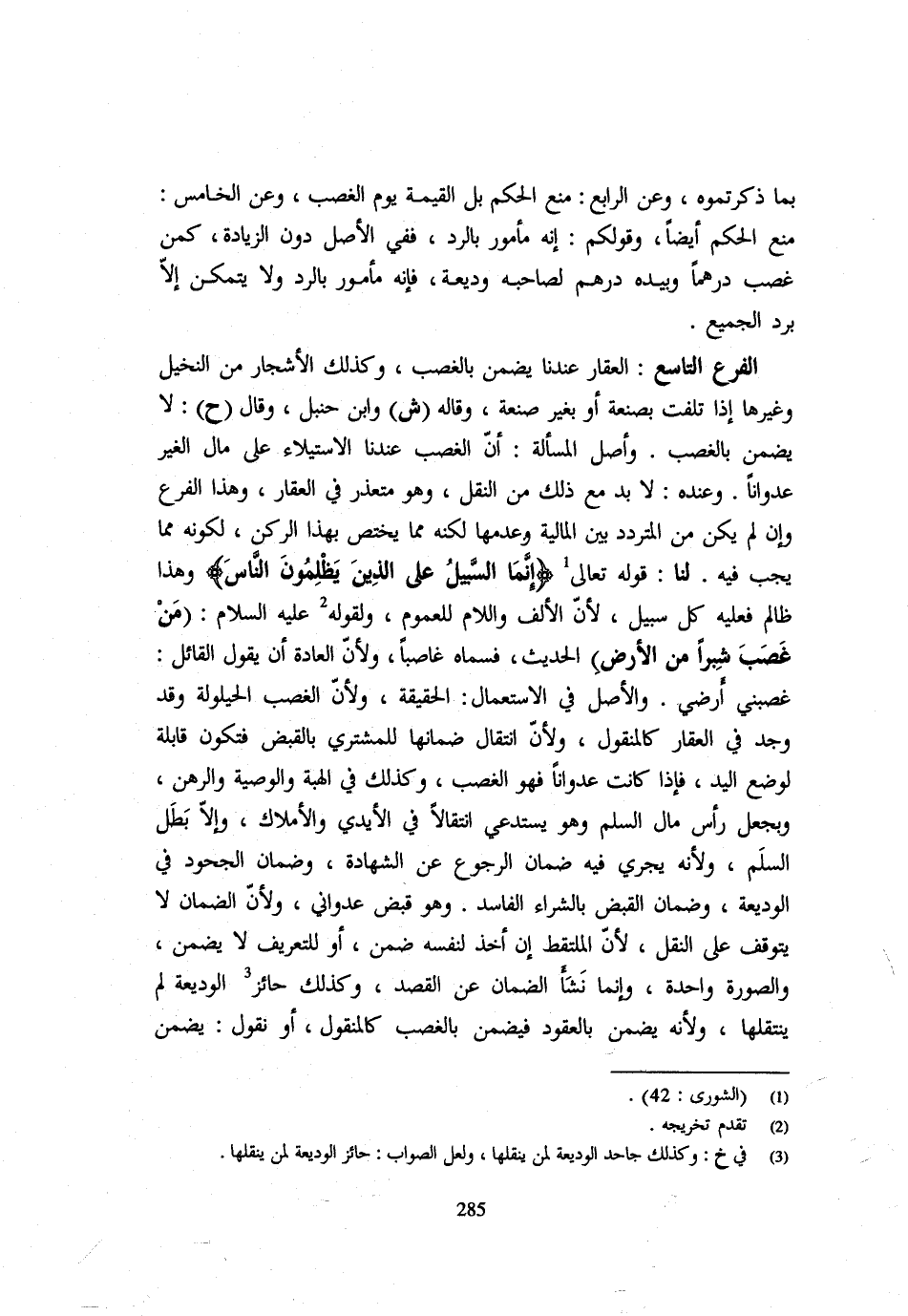 بِمَا ذَكَرْتُمُوهُ وَعَنِ الرَّابِعِ: مَنْعُ الْحُكْمِ بَلِ الْقِيمَةُ يَوْمَ الْغَصْبِ وَعَنِ الْخَامِسِ: مَنْعُ الْحُكْمِ أَيْضًا وَقَوْلُكُمْ: إِنَّهُ مَأْمُورٌ بِالرَّدِّ فَفِي الْأَصْلِ دون الزِّيَادَة كمن غصب درهما وَبِيَدِهِ دِرْهَم لِصَاحِبِهِ وَدِيعَةٌ فَإِنَّهُ مَأْمُورٌ بِالرَّدِّ وَلَا يَتَمَكَّنُ إِلَّا بِرَدِّ الْجَمِيعِ الْفَرْعُ التَّاسِعُ: الْعَقَارُ عِنْدَنَا يُضْمَنُ بِالْغَصْبِ وَكَذَلِكَ الْأَشْجَارُ مِنَ النَّخِيلِ وَغَيْرِهَا إِذَا تَلِفَتْ بِصَنْعَةٍ أَوْ بِغَيْرِ صَنْعَةٍ وَقَالَهُ (ش) وَابْن حَنْبَل وَقَالَهُ (ح) : لَا يُضْمَنُ بِالْغَصْبِ وَأَصْلُ الْمَسْأَلَةِ: أَنَّ الْغَصْبَ عِنْدَنَا الِاسْتِيلَاءُ عَلَى مَالِ الْغَيْرِ عُدْوَانًا وَعِنْدَهُ: لَا بُدَّ مَعَ ذَلِكَ مِنَ النَّقْلِ وَهُوَ مُتَعَذَّرٌ فِي الْعَقَارِ وَهَذَا الْفَرْعُ وَإِنْ لَمْ يَكُنْ مِنَ الْمُتَرَدِّدِ بَيْنَ الْمَالِيَّةِ وَعَدَمِهَا لَكِنَّهُ مِمَّا يَخْتَصُّ بِهَذَا الرُّكْنِ لِكَوْنِهِ مِمَّا يَجِبُ فِيهِ لَنَا قَوْله تَعَالَى: {إِنَّمَا السَّبِيلُ عَلَى الَّذِينَ يَظْلِمُونَ النَّاس} وَهَذَا ظَالِمٌ فَعَلَيْهِ كُلُّ سَبِيلٍ لِأَنَّ الْأَلِفَ وَاللَّامَ لِلْعُمُومِ وَلِقَوْلِهِ عَلَيْهِ السَّلَامُ: (مَنْ غَصَبَ شِبْرًا مِنَ الْأَرْضِ) الْحَدِيثَ فَسَمَّاهُ غَاصِبًا وَلِأَنَّ الْعَادَةَ أَنْ يَقُولَ الْقَائِلُ: غَصَبَنِي أَرْضِي وَالْأَصْلُ فِي الِاسْتِعْمَالِ الْحَقِيقَةُ وَلِأَنَّ الْغَصْبَ الْحَيْلُولَةُ وَقَدْ وجد فِي الْعَقَارِ كَالْمَنْقُولِ وَلِأَنَّ انْتِقَالَ ضَمَانِهَا لِلْمُشْتَرِي بِالْقَبْضِ فَتَكُونُ قَابِلَةً لِوَضْعِ الْيَدِ فَإِذَا كَانَتْ عُدْوَانًا فَهُوَ الْغَصْبُ وَكَذَلِكَ فِي الْهِبَةِ وَالْوَصِيَّةِ وَالرَّهْنِ وَبِجَعْلِ رَأْسِ مَالِ السَّلَمِ وَهُوَ يَسْتَدْعِي انْتِقَالًا فِي الْأَيْدِي وَالْأَمْلَاكِ وَإِلَّا بَطَلَ السَّلَمُ وَلِأَنَّهُ يَجْرِي فِيهِ ضَمَانُ الرُّجُوعِ عَنِ الشَّهَادَةِ وَضَمَانُ الْجَحُودِ فِي الْوَدِيعَةِ وَضَمَانُ الْقَبْضِ بِالشِّرَاءِ الْفَاسِدِ وَهُوَ قَبْضٌ عُدْوَانِيٌّ وَلِأَنَّ الضَّمَانَ لَا يَتَوَقَّفُ عَلَى النَّقْلِ لِأَنَّ الْمُلْتَقِطَ إِنْ أَخَذَ لِنَفَسِهِ ضَمِنَ أَوْ لِلتَّعْرِيفِ لَا يَضْمَنُ وَالصُّورَةُ وَاحِدَةٌ وَإِنَّمَا نَشَأَ الضَّمَانُ عَنِ الْقَصْدِ وَكَذَلِكَ حَائِزُ الْوَدِيعَةِ لَمْ يَنْتَقِلْهَا وَلِأَنَّهُ يُضْمَنُ بِالْعُقُودِ فَيُضْمَنُ بِالْغَصْبِ كَالْمَنْقُولِ أَوْ نَقُولُ: يُضْمَنُ