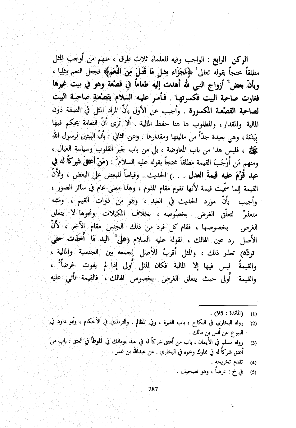 الرُّكْن الرَّابِع: الْوَاجِب وَفِيهِ لِلْعُلَمَاءِ ثَلَاثُ طُرُقٍ مِنْهُمْ مَنْ أَوْجَبَ الْمِثْلَ مُطْلَقًا مُحْتَجًّا بِقَوْلِهِ تَعَالَى: {فَجَزَاءٌ مِثْلُ مَا قَتَلَ مِنَ النَّعَمِ} فَجَعَلَ النَّعَمَ مِثْلِيًّا وَبِأَنَّ بَعْضَ أَزْوَاجِ النَّبِيِّ لله أَهَدَتْ إِلَيْهِ طَعَامًا فِي قَصْعَةٍ وَهُوَ فِي بَيْتِ غَيْرِهَا فَغَارَتْ صَاحِبَةُ الْبَيْتِ فَكَسَرَتْهَا فَأَمَرَ عَلَيْهِ السَّلَام بقصعة صَاحِبَة الْبَيْت لصاحبة الْقِصَّة الْمَكْسُورَةِ وَأُجِيبَ عَنِ الْأَوَّلِ بِأَنَّ الْمُرَادَ الْمِثْلُ فِي الصّفة دون الْمَالِيَّة والمقدار وَالْمَطْلُوب هَا هُنَا حِفْظُ الْمَالِيَّةِ أَلَا تَرَى أَنَّ النَّعَامَةَ يُحْكَمُ فِيهَا ببدنة وَهِي بعيدَة جدا من مَالِيَّتِهَا وَمِقْدَارِهَا وَعَنِ الثَّانِي: بِأَنَّ الْبَيْتَيْنِ لِرَسُولِ اللَّهِ صَلَّى اللَّهُ عَلَيْهِ وَسَلَّمَ فَلَيْسَ هَذَا مِنْ بَابِ الْمُعَاوَضَةِ بَلْ مِنْ بَابِ جَبْرِ الْقُلُوبِ وَسِيَاسَةِ الْعِيَالِ وَمِنْهُمْ مَنْ أَوْجَبَ الْقِيمَةَ مُطلقًا مُحْتَاجا بِقَوْلِهِ عَلَيْهِ السَّلَامُ: (مَنْ أَعْتَقَ شِرْكًا لَهُ فِي عَبْدٍ قُوِّمَ عَلَيْهِ قِيمَةَ الْعَدْلِ) الْحَدِيثَ وَقِيَاسًا لِلْبَعْضِ عَلَى الْبَعْضِ وَلِأَنَّ الْقِيمَةَ إِنَّمَا سُمِّيَتْ قِيمَةً لِأَنَّهَا تَقُومُ مَقَامَ الْمُقَوَّمِ وَهَذَا مَعْنًى عَامٌّ فِي سَائِرِ الصُّوَرِ وَأُجِيبَ بِأَنَّ مَوْرِدَ الْحَدِيثِ فِي الْعَبْدِ وَهُوَ مِنْ ذَوَاتِ الْقِيَمِ وَمِثْلُهُ مُتَعَذَّرٌ لِتَعَلُقِّ الْغَرَضِ بِخُصُوصِهِ بِخِلَافِ الْمَكِيلَاتِ وَنَحْوِهَا لَا يَتَعَلَّقُ الْغَرَضُ بِخُصُوصِهَا فَقَامَ كُلُّ فَرْدٍ مِنْ ذَلِكَ الْجِنْسِ مَقَامَ الْآخَرِ لِأَنَّ الْأَصْلَ رَدُّ عَيْنِ الْهَالِكِ لِقَوْلِهِ عَلَيْهِ السَّلَامُ (عَلَى الْيَدِ مَا أَخَذَتْ حَتَّى تَرُدَّهُ) تَعَذَّرَ ذَلِكَ وَالْمِثْلُ أَقْرَبُ لِلْأَصْلِ لِجَمْعِهِ بَيْنَ الْجِنْسِيَّةِ وَالْمَالِيَّةِ وَالْقِيمَةُ لَيْسَ فِيهَا إِلَّا الْمَالِيَّةُ فَكَانَ الْمِثْلُ أَوْلَى إِذَا لَمْ يُفَوِّتْ غَرَضًا وَالْقِيمَةُ أَوْلَى حَيْثُ يَتَعَلَّقُ الْغَرَضُ بِخُصُوصِ الْهَالِكِ فَالْقِيمَةُ تَأْتِي عَلَيْهِ