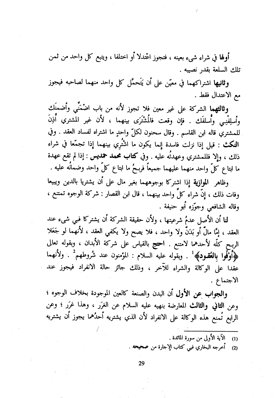 أَوَّلُهَا فِي شِرَاءِ شَيْءٍ بِعَيْنِهِ فَتَجُوزُ اعْتَدَلَا أَوِ اخْتَلَفَا وَيَتْبَعُ كُلُّ وَاحِدٍ مِنْ ثَمَنِ تِلْكَ السِّلْعَةِ بِقَدْرِ نَصِيبِهِ وَثَانِيهَا: اشْتِرَاكُهُمَا فِي مُعَيَّنٍ عَلَى أَنْ يَتَحمَّل كُلُّ وَاحِدٍ مِنْهُمَا لصَاحبه فَيجوز مَعَ الِاعْتِدَال فَقَط وثالثهما الشَّرِكَةُ عَلَى غَيْرِ مُعَيَّنٍ فَلَا تَجُوزُ لِأَنَّهُ مِنْ بَابِ اضْمَنِّي وَأَضْمَنُكَ وَأَسْلِفْنِي وَأُسْلِّفُكَ فَإِنْ وَقَعَتْ فَالْمُشْتَرَى بَيْنَهُمَا لِأَنَّ غَيْرَ الْمُشْتَرِي أَذِنَ لِلْمُشْتَرِي قَالَهُ ابْنُ الْقَاسِمِ. وَقَالَ سَحْنُونٌ لِكُلِّ وَاحِد مَا اشْتَرَاهُ لفساد العقد وَفِي النكث: قِيلَ إِذَا نَزَلَتْ فَاسِدَةً إِنَّمَا يَكُونُ مَا اشْتُرِيَ بَيْنَهُمَا إِذَا تَجَمَّعَا فِي شِرَاءِ ذَلِكَ وَإِلَّا فَلِلْمُشْتَرِي وَعُهْدَتُهُ عَلَيْهِ وَفِي كِتَابِ مُحَمَّدٍ حمديس: إِذا لم تعقع عُهْدَةُ مَا ابْتَاعَ كُلُّ وَاحِدٍ مِنْهُمَا عَلَيْهِمَا جَمِيعًا فَرِبْحُ مَا ابْتَاعَ كُلُّ وَاحِدٍ وَضَمَانُهُ عَلَيْهِ. وَظَاهِرُ الْمُوَازِيَةِ إِذَا اشْتَرَكَا بِوُجُوهِهِمَا بِغَيْرِ مَالٍ عَلَى أَنْ يَشْتَرِيَا بِالدَّيْنِ وَيَبِيعَا وَفَاتَ ذَلِكَ أَنَّ شِرَاءَ كُلِّ وَاحِدٍ بَيْنَهُمَا قَالَ ابْنُ الْقَصَّارِ: شَرِكَةُ الْوُجُوهِ تَمْتَنِعُ وَقَالَهُ الشَّافِعِيُّ وَجَوَّزَهُ أَبُو حَنِيفَةَ. لَنَا أَنَّ الْأَصْلَ عَدَمُ شرعيتها وَلِأَن حَقِيقَة الشّركَة أَن يشتركا فَبِي شَيْءٍ عِنْدَ الْعَقْدِ إِمَّا مَالٍ أَوْ بَدَنٍ وَلَا وَاحِدَ فَلَا يَصِحُّ وَلَا يَكْفِي الْعَقْدُ لِأَنَّهُمَا لَوْ جَعَلَا الرِّبْحَ كُلَّهُ لِأَحَدِهِمَا لَامْتَنَعَ احْتج بِالْقِيَاسِ على شركَة الْأَبدَان وَبِقَوْلِهِ تَعَالَى {أَوْفوا بِالْعُقُودِ} وَبِقَوْلِهِ - صَلَّى اللَّهُ عَلَيْهِ وَسَلَّم َ -: الْمُؤْمِنُونَ عِنْدَ شُرُوطِهِمْ وَلِأَنَّهُمَا عَقَدَا عَلَى الْوَكَالَةِ وَالشِّرَاءِ لِلْآخَرِ وَذَلِكَ جَائِزٌ حَالَةَ الِانْفِرَادِ فَيَجُوزُ عِنْد الِاجْتِمَاعِ وَالْجَوَابُ عَنِ الْأَوَّلِ أَنَّ الْبَدَنَ وَالصَّنْعَةَ كَالْعَيْنِ الْمَوْجُودَةِ بِخِلَافِ الْوُجُوهِ وَعَنِ الثَّانِي وَالثَّالِثِ الْمُعَارضَة بنهيه - صَلَّى اللَّهُ عَلَيْهِ وَسَلَّم َ - عَن الْغرَر وَهَذَا غرر وَعَن الرَّابِع تمنع هَذِه الْوكَالَة على الِانْفِرَاد لِأَن الَّذِي يَشْتَرِيهِ أَحَدُهُمَا يَجُوزُ أَنْ يَشْتَرِيَهُ