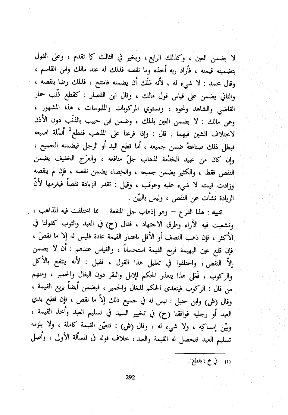 لَا يَضْمَنُ الْعَيْنَ وَكَذَلِكَ الرَّابِعُ وَيُخَيَّرُ فِي الثَّالِثِ كَمَا تَقَدَّمَ وَعَلَى الْقَوْلِ بِتَضْمِينِهِ قِيمَتَهُ فَأَرَادَ رَبُّهُ أَخْذَهُ وَمَا نَقَصَهُ فَذَلِكَ لَهُ عِنْدَ مَالِكٍ وَابْنِ الْقَاسِمِ وَقَالَ مُحَمَّدٌ: لَا شَيْءَ لَهُ لِأَنَّهُ مَلَكَ أَنْ يَضْمَنَهُ فَامْتَنَعَ فَذَلِكَ رِضًا بِنَقْصِهِ وَالثَّانِي يَضْمَنُ عَلَى قِيَاسِ قَوْلِ مَالِكٍ وَقَالَ ابْنُ الْقَصَّارِ: كَقَطْعِ ذَنَبِ حِمَارِ الْقَاضِي وَالشَّاهِدِ وَنَحْوِهِ وَتَسْتَوِي الْمَرْكُوبَاتُ وَالْمَلْبُوسَاتُ هَذَا الْمَشْهُورُ وَعَنْ مَالِكٍ: لَا يَضْمَنُ الْعَيْنَ بِذَلِكَ وَضَمَّنَ ابْنُ حَبِيبٍ بِالذَّنَبِ دُونَ الْأُذُنِ لِاخْتِلَافِ الشَّيْنِ فِيهِمَا قَالَ: وَإِذَا فَرَّعْنَا عَلَى الْمَذْهَبِ فَقَطْعُ أُنْمُلَةِ إُصْبُعِهِ فَبَطَّلَ ذَلِكَ صِنَاعَتَهُ ضَمِنَ جَمِيعَهُ أَمَّا قَطْعُ الْيَدِ أَوِ الرِّجْلِ فَيُضَمِّنُهُ الْجَمِيعُ وَإِنْ كَانَ مِنْ عَبِيدِ الْخِدْمَةِ لِذَهَابِ جُلِّ مَنَافِعِهِ وَالْعَرَجُ الْخَفِيفُ يَضْمَنُ النَّقْصَ فَقَطْ وَالْكَثِيرُ يَضْمَنُ جَمِيعَهُ وَالْخِصَاءُ يَضْمَنُ نَقْصَهُ فَإِن لم ينقصهُ وزادت قِيمَته لاشيء عَلَيْهِ وَعُوقِبَ وَقِيلَ: تُقَدَّرُ الزِّيَادَةُ نَقْصًا فَيَغَرَمُهَا لِأَنَّ الزِّيَادَةَ نَشَأَتْ عَنِ النَّقْصِ وَلَيْسَ بِالْبَيْنِ تَنْبِيهٌ: هَذَا الْفَرْعُ - وَهُوَ إِذْهَابُ جُلِّ الْمَنْفَعَةِ - مِمَّا اخْتَلَفَتْ فِيهِ الْمَذَاهِبُ وَتَشَعَّبَتْ فِيهِ الْآرَاءُ وَطُرُقُ الِاجْتِهَادِ فَقَالَ (ح) فِي الْعَبْدِ وَالثَّوْبِ كَقَوْلِنَا فِي الْأَكْثَرِ فَإِنْ ذَهَبَ النِّصْفُ أَوِ الْأَقَلُّ بِاعْتِبَارِ الْقِيمَةِ عَادَةً فَلَيْسَ لَهُ إِلَّا مَا نَقَصَ فَإِنْ قَلَعَ عَيْنَ الْبَهِيمَةِ فَرُبُعُ الْقِيمَةِ اسْتِحْسَانًا وَالْقِيَاسُ عِنْدَهُمْ: أَنْ لَا يَضْمَنَ إِلَّا النَّقْصَ وَاخْتَلَفُوا فِي تَعْلِيلِ هَذَا الْقَوْلِ فَقِيلَ: لِأَنَّهُ يَنْتَفِعُ بِالْأَكْلِ وَالرُّكُوبِ فَعَلَى هَذَا يَتَعَذَّرُ الْحُكْمُ لِلْإِبِلِ وَالْبَقَرِ دُونَ الْبِغَالِ وَالْحَمِيرِ وَمِنْهُمْ مَنْ قَالَ: الرُّكُوبُ فَيَتَعَدَّى الْحُكْمُ لِلْبِغَالِ وَالْحَمِيرِ فَيَضْمَنُ أَيْضًا بِرُبُعِ الْقِيمَةِ وَقَالَ (ش) وَابْنُ حَنْبَلٍ: لَيْسَ لَهُ فِي جَمِيعِ ذَلِكَ إِلَّا مَا نَقَصَ فَإِنْ قَطَعَ يَدَيِ الْعَبْدِ أَوْ رِجْلَيْهِ فَوَافَقَنَا (ح) فِي تَخْيِيرِ السَّيِّدِ فِي تَسْلِيمِ الْعَبْدِ وَأَخْذِ الْقِيمَةِ وَبَيْنَ إِمْسَاكِهِ وَلَا شَيْءَ لَهُ وَقَالَ (ش) : تَتَعَيَّنُ الْقِيمَةُ كَامِلَةً وَلَا يَلْزَمُهُ تَسْلِيمُ الْعَبْدِ فَتَحْصُلُ لَهُ الْقِيمَةُ وَالْعَبْدُ خِلَافُ قَوْلِهِ فِي الْمَسْأَلَةِ الْأُولَى وَالْأَصْل