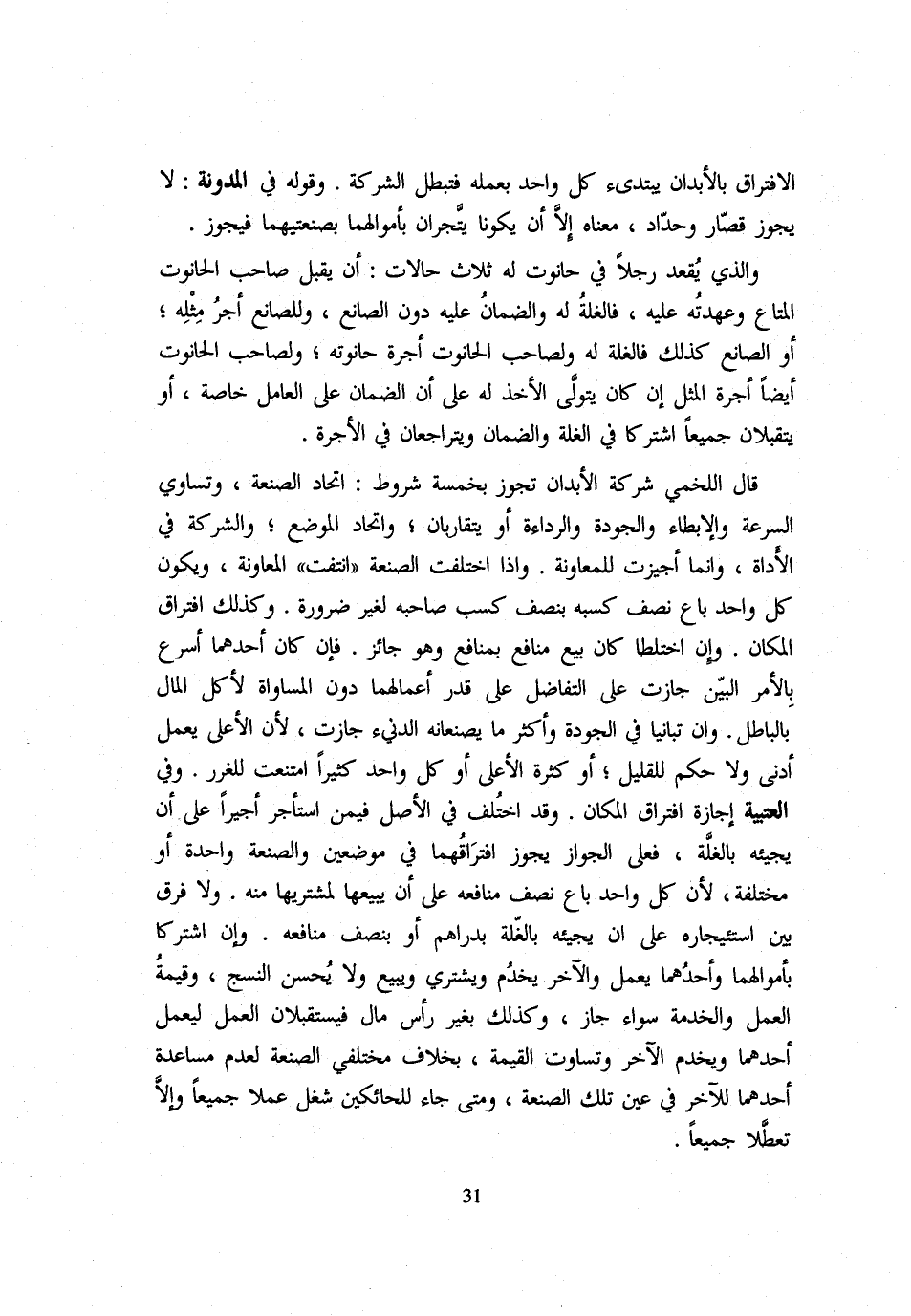 الِافْتِرَاقِ بِالْأَبْدَانِ يَبْتَدِئُ كُلُّ وَاحِدٍ بِعَمَلِهِ فَتَبْطُلُ الشَّرِكَةُ وَقَوْلُهُ فِي الْمُدَوَّنَةِ: لَا يَجُوزُ قَصَّارٌ وَحَدَّادٌ مَعْنَاهُ إِلَّا أَنْ يَكُونَا يَتَّجِرَانِ بِأَمْوَالِهِمَا بضعتيهما فَيجوز وَالَّذِي يُعقد رَجُلًا فِي حَانُوتٍ لَهُ ثَلَاثُ حَالَاتٍ: أَنْ يَقْبَلَ صَاحِبُ الْحَانُوتِ الْمَتَاعَ وعهدتُه عَلَيْهِ فَالْغَلَّةُ لَهُ وَالضَّمَانُ عَلَيْهِ دُونَ الصَّانِعِ وَلِلصَّانِعِ أجرُ مِثله أَوِ الصَّانِعُ كَذَلِكَ فَالْغَلَّةُ لَهُ وَلِصَاحِبِ الْحَانُوتِ أُجْرَةُ حَانُوتِهِ وَلِصَاحِبِ الْحَانُوتِ أَيْضًا أُجْرَةُ الْمِثْلِ إِنْ كَانَ يتولَّى الْأَخْذَ لَهُ عَلَى أَنَّ الضَّمَانَ عَلَى الْعَامِلِ خَاصَّةً أَوْ يَتَقَبَّلَانِ جَمِيعًا اشْتَرَكَا فِي الْغَلَّةِ وَالضَّمَانِ وَيَتَرَاجَعَانِ فِي الْأُجْرَةِ قَالَ اللَّخْمِيُّ: شَرِكَةُ الْأَبْدَانِ تَجُوزُ بِخَمْسَةِ شُرُوطٍ: اتِّحَادِ الصَّنْعَةِ وَتَسَاوِي السُّرْعَةِ وَالْإِبْطَاءِ وَالْجَوْدَةِ الرداءة أَو يتقاربان واتحاد الْموضع وَالشَّرِكَة فِي الأداة وَإِنَّمَا أُجِيزَتْ لِلْمُعَاوَنَةِ وَإِذَا اخْتَلَفَتِ الصَّنْعَةُ " انْتَفَتِ " المعاونة وَيكون كل وَاحِد بَاعَ نصف كَسبه بِنِصْفِ كَسْبِ صَاحِبِهِ لِغَيْرِ ضَرُورَةٍ وَكَذَلِكَ افْتِرَاقُ الْمَكَانِ وَإِنِ اخْتَلَطَا كَانَ بَيْعَ مَنَافِعَ بِمَنَافِعَ وَهُوَ جَائِزٌ فَإِنْ كَانَ أَحَدُهُمَا أَسْرَعَ بِالْأَمْرِ الْبَيِّنِ جَازَتْ عَلَى التَّفَاضُلِ عَلَى قَدْرِ أَعْمَالِهِمَا دُونَ الْمُسَاوَاةِ لِأَكْلِ الْمَالِ بِالْبَاطِلِ وَإِنْ تَبَايَنَا فِي الْجَوْدَةِ وَأَكْثَرُ مَا يَصْنَعَانِهِ الدَّنِيءُ جَازَتْ لِأَنَّ الْأَعْلَى يَعْمَلُ أَدْنَى وَلَا حُكْمَ لِلْقَلِيلِ أَو كَثْرَة الْأَعْلَى أَو كل وَاحِد كثيرا امْتنعت للغرر وَفِي العتيبة إجَازَة افْتِرَاق الْمَكَان وَقد اختُلف فِي الأَصْل فِيمَن اسْتَأْجَرَ أَجِيرًا عَلَى أَنْ يَجِيئَهُ بِالْغَلَّةِ فَعَلَى الْجَوَازِ يَجُوزُ افتراقُهما فِي مَوْضِعَيْنِ وَالصَّنْعَةُ وَاحِدَةٌ أَوْ مُخْتَلِفَةٌ لِأَنَّ كُلَّ وَاحِدٍ بَاعَ نِصْفَ مَنَافِعه على أَن يَبِيعهَا لمشتريها من وَلَا فَرْقَ بَيْنَ اسْتِئْجَارِهِ عَلَى أَنْ يَجِيئَهُ بالغّلة بِدَرَاهِم أَو بِنصْف مَنَافِعه وَإِن اشْتَركَا بِأَمْوَالِهِمَا وأحدُهما يَعْمَلُ وَالْآخِرُ يخدُم وَيَشْتَرِي وَيَبِيعُ وَلَا يُحسن النسج وَقِيمَته الْعَمَلِ وَالْخِدْمَةِ سَوَاءٌ جَازَ وَكَذَلِكَ بِغَيْرِ رَأْسِ مَالٍ فَيَسْتَقْبِلَانِ الْعَمَلَ لِيَعْمَلَ أَحَدُهُمَا وَيَخْدِمَ الْآخَرُ وَتَسَاوَتِ الْقِيمَةُ بِخِلَافِ مُخْتَلِفَيِ الصَّنْعَةِ لِعَدَمِ مُسَاعَدَةِ أَحَدِهِمَا لِلْآخَرِ فِي عَيْنِ تِلْكَ الصَّنْعَةِ وَمَتَى جَاءَ لِلْحَائِكَيْنِ شُغُلٌ عَمِلَا جَمِيعًا وَإِلَّا تعطَّلا جَمِيعًا