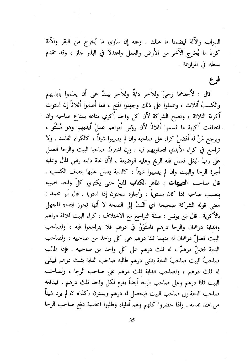 قَالَ: لِأَحَدِهِمَا رحَّى وَلِلْآخَرِ دابةٌ وَللْآخر بيتٌ على أَن يعلمُوا بِأَيْدِيهِمْ والكسبُ أَثْلَاثٌ وَعَمِلُوا عَلَى ذَلِكَ وَجَهِلُوا الْمَنْعَ فَمَا أَصَابُوا أَثْلَاثًا إِنِ اسْتَوَتْ أَكْرِيَةُ الثَّلَاثَةِ وَتَصِحُّ الشَّرِكَةُ لِأَنَّ كُلَّ وَاحِدٍ أَكْرَى مَتَاعه بمتاع صَاحبه وَإِن اخْتلفت أكريه مَا قسموا أَثلَاثًا لِأَن رُؤْس أَمْوَالِهِمْ عَمَلُ أَيْدِيهِمْ وَهُوَ مُستو وَيَرْجِعُ مَنْ لَهُ أفضل كِرَاءٍ عَلَى صَاحِبِهِ وَإِنْ لَمْ يُصِيبُوا شَيْئًا كَالْكِرَاءِ الْفَاسِدِ وَلَا تَرَاجُعَ فِي كِرَاءِ الْأَيْدِي لتساويهم فِيهِ وَإِن اشْترط صاحبا الْبَيْت والرحا الْعَمَلَ عَلَى رَبِّ الْبَغْلِ فَعَمِلَ فَلَهُ الرِّبْحُ وَعَلَيْهِ الْوَضِيعَةُ لِأَنَّ غَلَّةَ دَابَّتِهِ رَأْسُ الْمَالِ وَعَلِيهِ أُجْرَة الرحا وَالْبَيْتِ وَإِنْ لَمْ يُصِيبُوا شَيْئًا كَالدَّابَّةِ يَعْمَلُ عَلَيْهَا بِنِصْفِ الْكَسْبِ قَالَ صَاحِبُ التَّنْبِيهَاتِ: ظَاهِرُ الْكِتَابِ الْمَنْعُ حَتَّى يَكْتَرِيَ كُلُّ وَاحِدٍ نَصِيبَهُ بِنَصِيب صَاحِبِهِ إِذَا كَانَ مُسْتَوِيًا وَأَجَازَهُ سَحْنُونٌ إِذَا اسْتَوَيَا قَالَ أَبُو مُحَمَّدٍ: مَعْنَى قَوْلِهِ الشَّرِكَةُ صَحِيحَةٌ أَيْ آلَتْ إِلَى الصِّحَّةِ لَا أَنَّهَا تَجُوزُ ابْتِدَاءً لِلْجَهْلِ بِالْأَكْرِيَةِ قَالَ ابْنُ يُونُسَ: صِفَةُ التَّرَاجُعِ مَعَ الِاخْتِلَافِ: كِرَاءُ الْبَيْتِ ثَلَاثَةُ دَرَاهِم وَالدَّابَّة دِرْهَمَانِ والرحا دِرْهَمٌ فَاسْتَوَوْا فِي دِرْهَمٍ فَلَا يَتَرَاجَعُوا فِيهِ وَلِصَاحِبِ الْبَيْتِ فضلٌ دِرْهَمَانِ لَهُ مِنْهُمَا ثُلُثَا دِرْهَمٍ عَلَى كُلِّ وَاحِدٍ مِنْ صَاحِبَيْهِ وَلِصَاحِبِ الدَّابَّةِ فضلٌ دِرْهَمٍ لَهُ ثُلُثُ دِرْهَمٍ عَلَى كل وَاحِد من صَاحِبيهِ فَإِذا فَإِذَا طَالَبَ صَاحِبُ الْبَيْتِ صَاحِبَ الدَّابَّةِ بِثُلُثَيْ دِرْهَمٍ طَالَبَهُ صَاحِبُ الدَّابَّةِ بِثُلُثِ دِرْهَمٍ فَيَبْقَى لَهُ ثلث دجرهم وَلِصَاحِب الدَّابَّة ثلث دِرْهَم وعَلى صَاحب الرحا وَلِصَاحِب الْبَيْت ثلثا دِرْهَم وعَلى صَاحب الرحا أَيْضًا يُغَرَّمُ لِكُلِّ وَاحِدٍ ثُلُثَ دِرْهَمٍ فَيَدْفَعُهُ صَاحِبُ الدَّابَّةِ إِلَى صَاحِبِ الْبَيْتِ فَيَحْصُلُ لَهُ دِرْهَم ويستزن " كَذَا " إِنْ لَمْ يَزِدْ شَيْئًا مِنْ عِنْدِ نَفْسِهِ وَإِذَا حَضَرُوا كُلُّهُمْ وَهُمْ أَمْلِيَاءُ وَطَلَبُوا الْمُحَاسَبَةَ دفع صَاحب الرحا