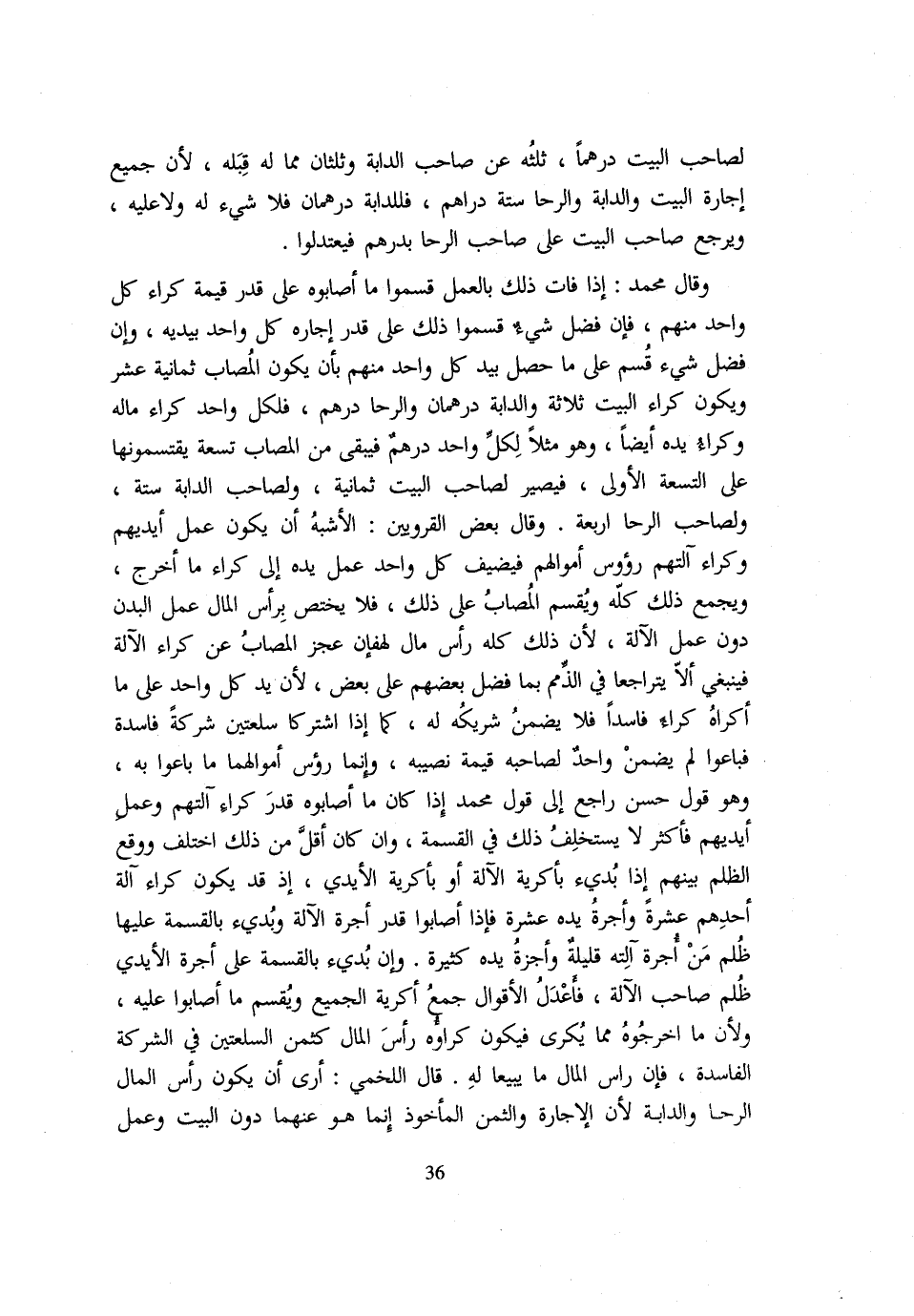 لِصَاحِبِ الْبَيْتِ دِرْهَمًا ثُلُثُهُ عَنْ صَاحِبِ الدَّابَّةِ وَثُلُثَانِ مِمَّا لَهُ قَبْلَهُ لِأَنَّ جَمِيعَ إِجَارَةِ الْبَيْت وَالدَّابَّة والرحا سِتَّةُ دَرَاهِمَ فَلِلدَّابَّةِ دِرْهَمَانِ فَلَا شَيْءَ لَهُ وَلَا عَلَيْهِ وَيَرْجِعُ صَاحِبُ الْبَيْتِ عَلَى صَاحِبِ الرحا بدرهم فيعتدلوا وَقَالُوا مُحَمَّدٌ: إِذَا فَاتَ ذَلِكَ بِالْعَمَلِ قَسَّمُوا مَا أَصَابُوا عَلَى قَدْرِ قِيمَةِ كِرَاءِ كُلِّ وَاحِدٍ مِنْهُمْ فَإِنْ فَضَلَ شَيْءٌ قَسَّمُوا ذَلِكَ عَلَى قَدْرِ إِجَارَةِ كُلِّ وَاحِدٍ بِيَدَيْهِ وَإِنْ فَضَلَ شَيْءٌ قُسم عَلَى مَا حَصَلَ بِيَدِ كُلِّ وَاحِدٍ مِنْهُمْ بِأَنْ يَكُونَ المُصاب ثَمَانِيَةَ عَشَرَ وَيَكُونُ كِرَاء الْبَيْت ثَلَاثَة وَالدَّابَّة دِرْهَمَانِ والرحا دِرْهَمٌ فَلِكُلِّ وَاحِدٍ كِرَاءُ مَالِهِ وَكِرَاءُ يَدِهِ أَيْضا وَهُوَ مِثْلًا لِكُلِّ وَاحِدٍ دِرْهَمٌ فَيَبْقَى مِنَ الْمُصَابِ تِسْعَةٌ يَقْتَسِمُونَهَا عَلَى التِّسْعَةِ الْأُولَى فَيَصِيرُ لِصَاحِبِ الْبَيْتِ ثَمَانِيَةٌ وَلِصَاحِبِ الدَّابَّةِ سِتَّةٌ وَلِصَاحِبِ الرحا أَرْبَعَةٌ وَقَالَ بَعْضُ الْقَرَوِيِّينَ: الْأَشْبَهُ أَنْ يَكُونَ عمل أَيْديهم وكراء آلتهم رُؤُوس أَمْوَالِهِمْ فَيُضِيفُ كُلُّ وَاحِدٍ عَمَلَ يَدِهِ إِلَى كِرَاءِ مَا أَخْرَجَ وَيُجْمَعُ ذَلِكَ كُلُّهُ ويُقسم المُصاب عَلَى ذَلِكَ فَلَا يَخْتَصُّ بِرَأْسِ الْمَالِ عَمَلُ الْبَدَنِ دُونَ عَمَلِ الْآلَةِ لِأَنَّ ذَلِكَ كُله رَأس مَال لَهُ فَإِنْ عَجَزَ الْمُصَابُ عَنْ كِرَاءِ الْآلَةِ فَيَنْبَغِي أَلَّا يَتَرَاجَعَا فِي الذِّمم بِمَا فَضَلَ بَعْضُهُمْ عَلَى بَعْضٍ لِأَنَّ يَدَ كُلِّ وَاحِدٍ عَلَى مَا أَكْرَاهُ كِرَاءً فَاسِدًا فَلَا يَضْمَنُ شَرِيكُهُ لَهُ كَمَا إِذَا اشْتَرَكَا سِلْعَتَيْنِ شَرِكَةً فَاسِدَةً فَبَاعُوا لَمْ يَضْمَنْ واحدٌ لِصَاحِبِهِ قِيمَةَ نَصِيبِهِ وَإِنَّمَا رُؤْس أَمْوَالِهِمَا مَا بَاعُوا بِهِ وَهُوَ قَوْلٌ حَسَنٌ رَاجِعٌ إِلَى قَوْلِ مُحَمَّدٍ إِذَا كَانَ مَا أَصَابُوهُ قَدْرَ كِرَاءِ آلَتِهِمْ وَعَمَلِ أَيْدِيهِمْ فَأَكْثَرَ لَا يستخلِفُ ذَلِكَ فِي الْقِسْمَةِ وَإِنْ كَانَ أَقَلَّ مِنْ ذَلِكَ اخْتُلِفَ وَوَقَعَ الظُّلْمُ بَيْنَهُمْ إِذَا بُدئ بِأَكْرِيَةِ الْآلَةِ أَوْ بِأَكْرِيَةِ الْأَيْدِي إِذا قَدْ يَكُونُ كِرَاءُ آلَةِ أَحَدِهِمْ عَشَرَةً وَأُجْرَةُ يَدِهِ عَشَرَةً فَإِذَا أَصَابُوا قَدْرَ أُجْرَةِ الْآلَةِ وبُدىء بِالْقِسْمَةِ عَلَيْهَا ظُلم مَنْ أُجرة آلَتِهِ قَلِيلَةٌ وَأُجْرَةُ يَدِهِ كَثِيرَةٌ وَإِنْ بُدئ بِالْقِسْمَةِ عَلَى أُجْرَةِ الْأَيْدِي ظُلِمَ صَاحِبُ الْآلَةِ فأعدَلُ الْأَقْوَالِ جمعُ أَكْرِيَةِ الْجَمِيعِ ويُقسم مَا أَصَابُوا عَلَيْهِ وَلِأَنَّ مَا أَخْرَجُوا مِمَّا يُكرى فَيَكُونُ كِرَاؤُهُ رَأْسَ الْمَالِ كَثَمَنِ السِّلْعَتَيْنِ فِي الشَّرِكَةِ الْفَاسِدَةِ فَإِن رَأس المَال مَا يبيعا لَهُ قَالَ اللَّخْمِيُّ: أَرَى أَنْ يَكُونَ رَأْسُ الْمَالِ الرحا وَالدَّابَّة لِأَن الْإِجَارَة وَالثمن الْمَأْخُوذ إِنَّمَا هُوَ عَنْهُمَا دُونَ الْبَيْتِ وَعَمَلِ