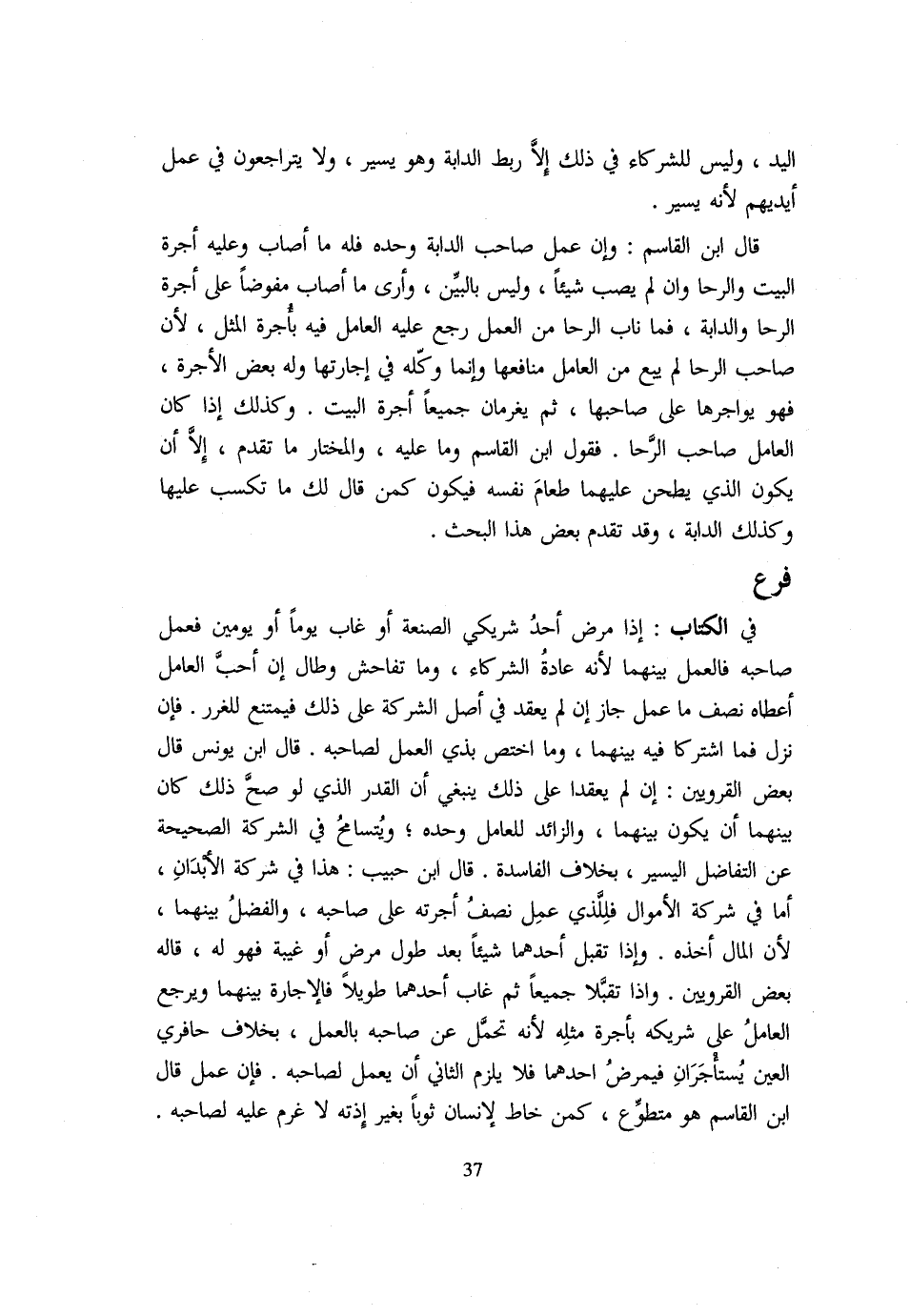 فِي الْكِتَابِ: إِذَا مَرِضَ أحدُ شَرِيكَيِ الصَّنْعَةِ أَوْ غَابَ يَوْمًا أَوْ يَوْمَيْنِ فَعَمِلَ صَاحِبُهُ فَالْعَمَلُ بَيْنَهُمَا لِأَنَّهُ عادةُ الشُّرَكَاءِ وَمَا تَفَاحَشَ وَطَالَ إِنْ أَحَبَّ الْعَامِلُ أَعْطَاهُ نِصْفَ مَا عَمِلَ جَازَ إِنْ لَمْ يَعْقِدْ فِي أَصْلِ الشَّرِكَةِ عَلَى ذَلِكَ فَيَمْتَنِعُ لِلْغَرَرِ فَإِنْ نَزَلَ فَمَا اشْتَرَكَا فِيهِ بَيْنَهُمَا وَمَا اخْتَصَّ بِذِي الْعَمَلِ لِصَاحِبِهِ قَالَ ابْنُ يُونُس قَالَ قَالَ بَعْضُ الْقَرَوِيِّينَ: إِنْ لَمْ يَعْقِدَا عَلَى ذَلِكَ يَنْبَغِي أَنَّ الْقَدْرَ الَّذِي لَوْ صحَّ ذَلِكَ كَانَ بَيْنَهُمَا أَنْ يَكُونَ بَيْنَهُمَا وَالزَّائِدُ لِلْعَامِلِ وَحْدَهُ ويُتسامح فِي الشَّرِكَةِ الصَّحِيحَةِ عَنِ التَّفَاضُلِ الْيَسِيرِ بِخِلَافِ الْفَاسِدَةِ قَالَ ابْنُ حَبِيبٍ: هَذَا فِي شَرِكَةِ الْأَبْدَانِ أَمَّا فِي شَرِكَةِ الْأَمْوَالِ فَلِلَّذِي عَمِلَ نِصْفُ أُجْرَتِهِ عَلَى صَاحِبِهِ وَالْفَضْلُ بَيْنَهُمَا لِأَنَّ الْمَالَ أَخَذَهُ وَإِذَا تَقَبَّلَ أَحَدُهُمَا شَيْئًا بَعْدَ طُولِ مَرَضٍ أَوْ غَيْبَةٍ فَهُوَ لَهُ قَالَه بعض الْقرَوِيين إِذا تقبًّلا جَمِيعًا ثمَّ غَابَ أَحدهَا طَوِيلًا فَالْإِجَارَةُ بَيْنَهُمَا وَيَرْجِعُ الْعَامِلُ عَلَى شَرِيكِهِ بِأُجْرَةِ مِثْلِهِ لِأَنَّهُ تحمَّل عَنْ صَاحِبِهِ بِالْعَمَلِ بِخِلَافِ حَافِرَيِ الْعَيْنِ يُستأجران فَيَمْرَضُ أَحَدُهُمَا فَلَا يلْزم الثَّانِي أَن يعْمل لصَاحبه فَإِنْ عَمِلَ قَالَ ابْنُ الْقَاسِمِ هُوَ متطِّوع كَمَنْ خَاطَ لِإِنْسَانٍ ثَوْبًا بِغَيْرِ إِذْنِهِ لَا غُرْمَ عَلَيْهِ لِصَاحِبِهِ
