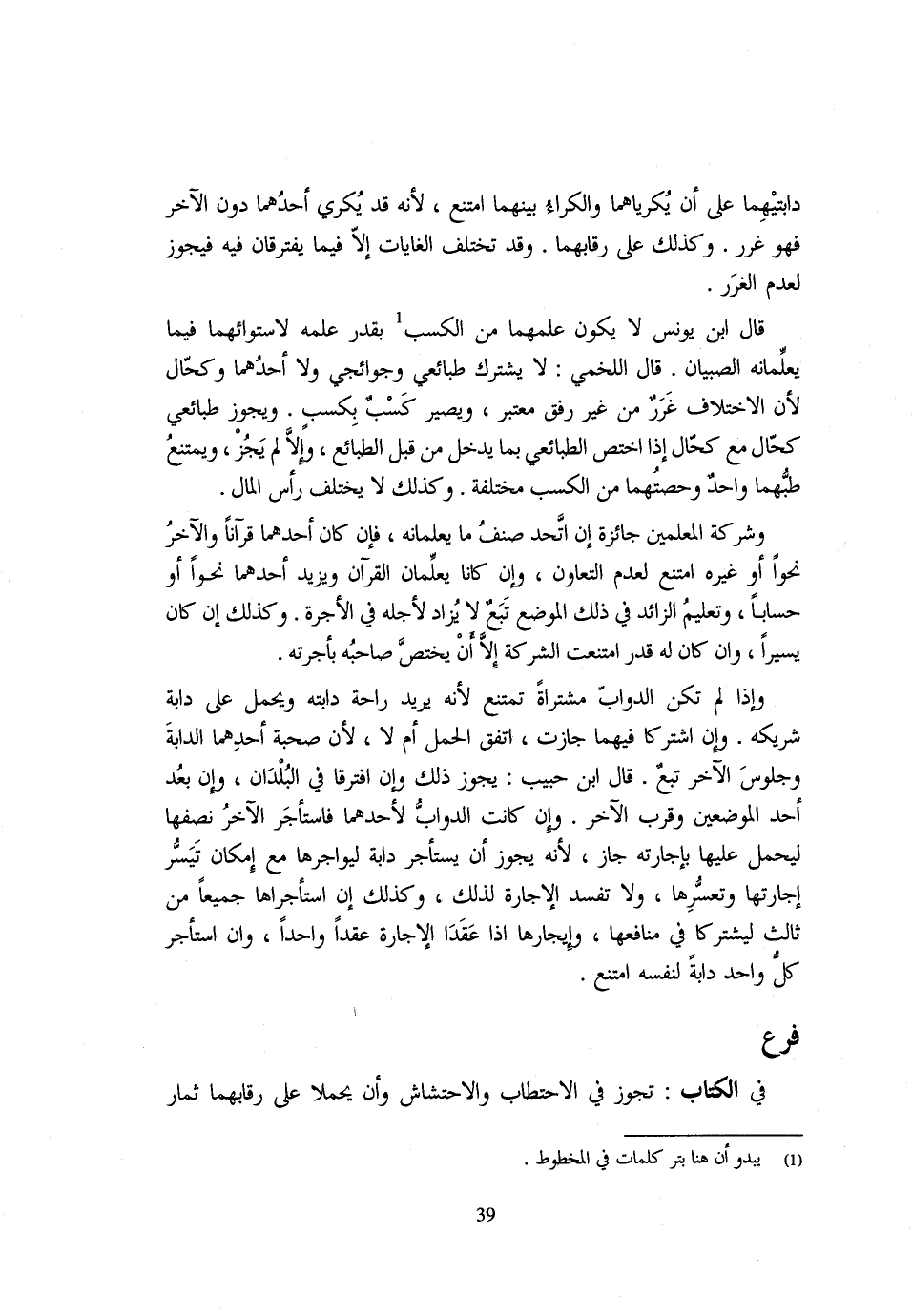 دَابَّتَيْهِمَا عَلَى أَنْ يُكرياهما وَالْكِرَاءُ بَيْنَهُمَا امْتَنَعَ لِأَنَّهُ قَدْ يُكري أحدُهما دُونَ الْآخَرِ فَهُوَ غَرَرٌ وَكَذَلِكَ عَلَى رِقَابِهِمَا وَقَدْ تَخْتَلِفُ الْغَايَاتُ إِلَّا فِيمَا يَفْتَرِقَانِ فِيهِ فَيَجُوزُ لِعَدَمِ الْغَرَرِ قَالَ ابْنُ يُونُس لايكون علمهما مِنَ الْكَسْبِ بِقَدْرِ عِلْمِهِ لِاسْتِوَائِهِمَا فِيمَا يعلِّمانه الصِّبْيَانَ قَالَ اللَّخْمِيُّ: لَا يَشْتَرِكُ طَبَائِعِيٌّ وَجَوَائِجِيٌّ وَلَا أَحَدُهُمَا وَكَحَّالٌ لِأَنَّ الِاخْتِلَافَ غَرَرٌ مِنْ غير رفق مُعْتَبر وَيصير كسبٌ بِكَسْبٍ وَيَجُوزُ طَبَائِعِيٌ كَحَّالٌ مَعَ كَحَّالٍ إِذَا اخْتَصَّ الطَّبَائِعِيُّ بِمَا يَدْخُلُ مِنْ قِبَلِ الطَّبَائِعِ وَإِلَّا لَمْ يَجُز وَيَمْتَنِعُ طبُّهما واحدٌ وَحِصَّتُهُمَا مِنَ الْكَسْبِ مُخْتَلِفَةٌ وَكَذَلِكَ لَا يَخْتَلِفُ رَأْسُ الْمَالِ وَشَرِكَةُ الْمُعَلِّمِينَ جَائِزَةٌ إِنِ اتَّحد صِنْفُ مَا يُعَلِّمَانِهِ فَإِنْ كَانَ أَحَدُهُمَا قُرْآنًا وَالْآخَرُ نَحْوًا أَوْ غَيْرَهُ امْتَنَعَ لِعَدَمِ التَّعَاوُنِ وَإِنْ كَانَا يعلِّمان الْقُرْآنَ وَيَزِيدُ أَحَدُهُمَا نَحْوًا أَوْ حِسَابًا وَتَعْلِيمُ الزَّائِدِ فِي ذَلِكَ الْمَوْضِعِ تبعٌ لَا يُزاد لأَجله فِي الْأُجْرَة وَكَذَلِكَ إِنْ كَانَ يَسِيرًا وَإِنْ كَانَ لَهُ قَدْرٌ امْتَنَعَتِ الشَّرِكَةُ إِلَّا أَنْ يَخْتَصَّ صَاحِبُهُ بِأُجْرَتِهِ وَإِذَا لَمْ تَكُنِ الدَّوَابُّ مُشْتَرَاةً تَمْتَنِعُ لِأَنَّهُ يُرِيدُ رَاحَةَ دَابَّتِهِ وَيَحْمِلُ عَلَى دَابَّةِ شَرِيكِهِ وَإِنِ اشْتَرَكَا فِيهِمَا جَازَتِ اتَّفَقَ الْحَمْلُ أَمْ لَا لِأَنَّ صُحْبَةَ أَحَدِهِمَا الدَّابَّةَ وَجُلُوسَ الْآخَرِ تبعٌ قَالَ ابْنُ حَبِيبٍ: يَجُوزُ ذَلِكَ وَإِنِ افْتَرَقَا فِي البُلدان وَإِنْ بعُد أَحَدُ الْمَوْضِعَيْنِ وَقَرُبَ الْآخَرُ وَإِنْ كَانَتِ الدَّوَابُّ لِأَحَدِهِمَا فَاسْتَأْجَرَ الْآخَرُ نِصْفَهَا لِيَحْمِلَ عَلَيْهَا بِإِجَارَتِهِ جَازَ لِأَنَّهُ يجوز أَن يسْتَأْجر دَابَّة ليواجرها مَعَ إِمْكَانِ تَيَسُّرِ إِجَارَتِهَا وَتَعَسُّرِهَا وَلَا تَفْسُدُ الْإِجَارَةُ لِذَلِكَ وَكَذَلِكَ إِنِ اسْتَأْجَرَاهَا جَمِيعًا مِنْ ثَالِثٍ لِيَشْتَرِكَا فِي مَنَافِعِهَا وَإِيجَارِهَا إِذَا عَقَدَا الْإِجَارَةَ عَقْدًا وَاحِدًا وَإِنِ اسْتَأْجَرَ كُلُّ وَاحِدٍ دَابَّةً لِنَفْسِهِ امْتَنَعَ