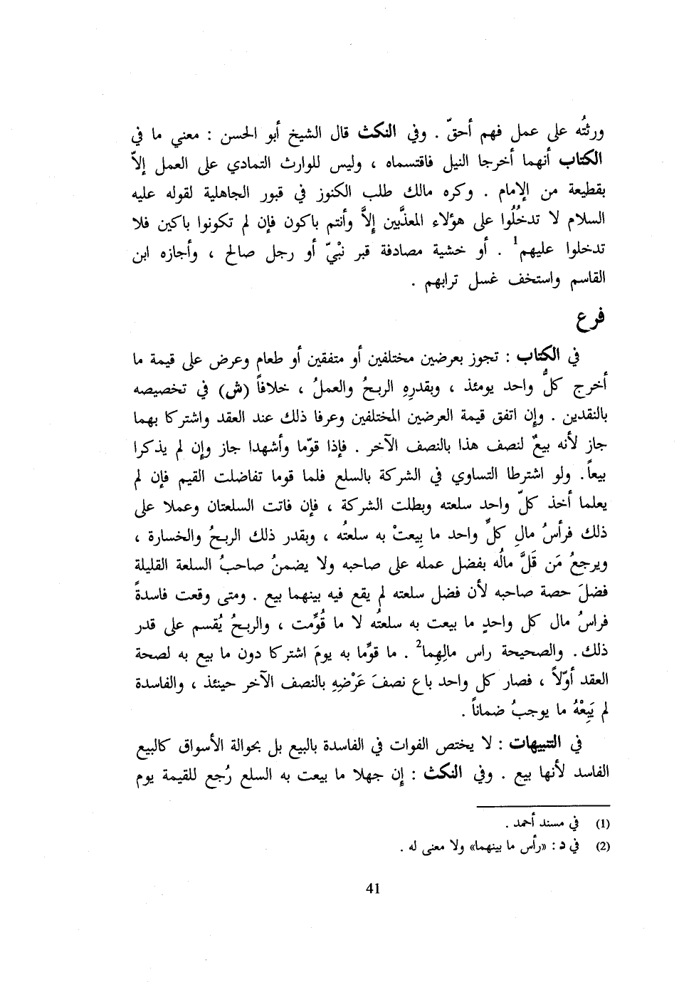 ورثته على عمل فهم أَحَق وَفِي النكث قَالَ الشَّيْخُ أَبُو الْحَسَنِ: مَعْنَى مَا فِي الْكِتَابِ أَنَّهُمَا أَخْرَجَا النَّيْلَ فَاقْتَسَمَاهُ وَلَيْسَ لِلْوَارِثِ التَّمَادِي عَلَى الْعَمَلِ إِلَّا بِقَطِيعَةٍ مِنَ الْإِمَامِ وَكَرِهَ مَالِكٌ طَلَبَ الْكُنُوزِ فِي قُبُورِ الْجَاهِلِيَّةِ لِقَوْلِهِ عَلَيْهِ السَّلَامُ لَا تَدْخُلُوا عَلَى هَؤُلَاءِ المعذَّبين إِلَّا وَأَنْتُمْ بَاكُونَ فَإِنْ لَمْ تَكُونُوا بَاكِينَ فَلَا تَدْخُلُوا عَلَيْهِمْ أَوْ خَشْيَةَ مُصَادَفَةِ قَبْرِ نَبِيٍّ أَوْ رَجُلٍ صَالِحٍ وَأَجَازَهُ ابْنُ الْقَاسِمِ وَاسْتَخَفَّ غَسْلَ تُرَابِهِمْ