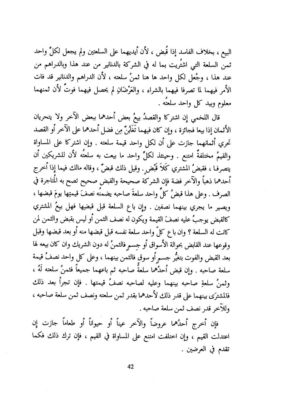الْبَيْعِ بِخِلَافِ الْفَاسِدِ إِذَا قُبض لِأَنَّ أَيْدِيَهُمَا عَلَى السِّلْعَتَيْنِ وَلَمْ يُجْعَلْ لِكُلِّ وَاحِدٍ ثَمَنُ السِّلْعَةِ الَّتِي اشتُريت بِمَا لَهُ فِي الشَّرِكَةِ بِالدَّنَانِيرِ مِنْ عِنْدِ هَذَا وَبِالدَّرَاهِمِ مِنْ عِنْدِ هَذَا وجُعل لكل وَاحِد هَا هُنَا ثَمَنُ سِلْعَتِهِ لِأَنَّ الدَّرَاهِمَ وَالدَّنَانِيرَ قَدْ فَاتَ الْأَمْرُ فِيهِمَا لَمَّا تَصَرَّفَا فِيهِمَا بِالشِّرَاءِ وَالْعَرْضَانِ لَمْ يَحْصُلْ فِيهِمَا فَوْتٌ لِأَنَّ ثَمَنَهُمَا مَعْلُومٌ وبيد كل وَاحِد سلْعَته قَالَ اللَّخْمِيّ: إِذا اشْتَرَكَا وَالْقَصْدُ بَيْعُ بَعْضِ أَحَدِهِمَا بِبَعْضِ الْآخَرِ وَلَا يَتَحَرَّيَانِ الْأَثْمَانَ إِذَا بِيعَا فَجَائِزَةٌ وَإِنْ كَانَ فِيهِمَا تغابُنٌ مِنْ فَضْلِ أَحَدِهِمَا عَلَى الآخر أَو الْقَصْد تَحَرِّي أَثْمَانِهِمَا جَازَتْ عَلَى أَنَّ لِكُلِّ وَاحِدٍ قِيمَةَ سِلْعَتِهِ وَإِنِ اشْتَرَكَا عَلَى الْمُسَاوَاةِ وَالْقِيَمُ مُخْتَلِفَةٌ امْتَنَعَ