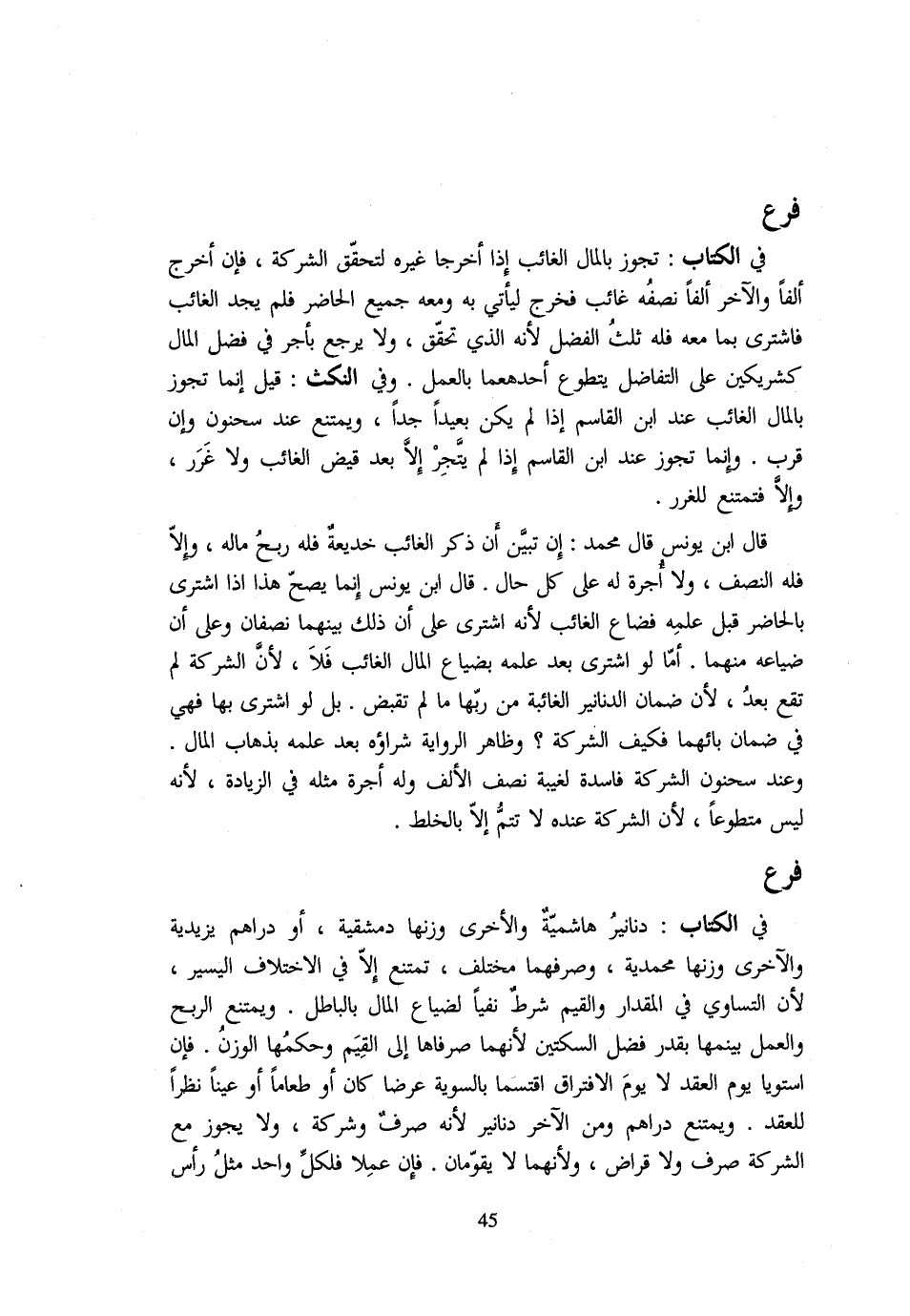 فِي الْكِتَابِ: دَنَانِيرُ هَاشِمِيَّةٌ وَالْأُخْرَى وَزْنُهَا دِمَشْقِيَّةٌ أَوْ دَرَاهِمُ يَزِيدِيَّةٌ وَالْأُخْرَى وَزْنُهَا مُحَمَّدِيَّةٌ وَصَرْفُهَمَا مُخْتَلِفٌ تَمْتَنِعُ إِلَّا فِي الِاخْتِلَافِ الْيَسِيرِ لِأَنَّ التَّسَاوِيَ فِي الْمِقْدَارِ والقيم شَرط نقياً لضياع المَال بِالْبَاطِلِ وَيمْتَنع الرِّبْح وَالْعَمَل بَيْنَهُمَا بِقَدْرِ فَضْلِ السُّكَّتَيْنِ لِأَنَّهُمَا صَرَفَاهَا إِلَى الْقِيَمِ وحكمُهما الْوَزْنُ فَإِنِ اسْتَوَيَا يَوْمَ الْعَقْدِ لَا يَوْمَ الِافْتِرَاقِ اقْتَسَمَا بِالسَّوِيَّةِ عَرْضًا كَانَ أَو طَعَاما أَو عينا نظرا للْعقد وَيمْتَنع دَرَاهِمُ وَمِنَ الْآخَرِ دَنَانِيرُ لِأَنَّهُ صرفٌ وَشَرِكَةٌ وَلَا يَجُوزُ مَعَ الشَّرِكَةِ صَرْفٌ وَلَا قِرَاضٌ وَلِأَنَّهُمَا لَا يَقُومَانِ فَإِنْ عَمِلَا فَلِكُلِّ وَاحِدٍ مثل رَأس