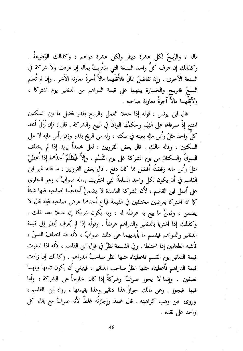 مَالِهِ وَالرِّبْحُ لِكُلِّ عَشَرَةٍ دِينَارٌ وَلِكُلِّ عَشَرَةٍ دَرَاهِمُ وَكَذَلِكَ الوَضيعة وَكَذَلِكَ إِنْ عَرَفَ كُلُّ وَاحِدٍ السِّلْعَةَ الَّتِي اشتُريت بِمَالِهِ إِنْ عُرِفَتْ وَلَا شَرِكَةَ فِي السِّلْعَةِ الْأُخْرَى وَإِنْ تَفَاضَلَ الْمَالُ فلأقلِّهما مَالًا أُجْرَةُ مُعَاوَنَةِ الْآخَرِ وَإِنْ لَمْ تُعلم السِّلَعُ فَالرِّبْحُ وَالْخَسَارَةُ بَيْنَهُمَا عَلَى قِيمَةِ الدَّرَاهِمِ مِنَ الدَّنَانِيرِ يَوْمَ اشْتَرَكَا وَلِأَقَلِّهِمَا مَالًا أُجْرَةُ مُعَاوَنَةِ صَاحِبِهِ قَالَ ابْنُ يُونُسَ: قَوْلُهُ إِذَا جَعَلَا الْعَمَلَ وَالرِّبْحَ بِقَدْرِ فَضْلِ مَا بَين السكتين امْتنع إِذا صرفاها على الْقِيَمِ وحكمُها الْوَزْنُ فِي الْبَيْعِ وَالشَّرِكَةِ قَالَ: فَإِنْ نَزَلَ أَخَذَ كُلُّ وَاحِدٍ مِثْلَ رَأْسِ مَالِهِ بِعَيْنِهِ فِي سِكَّتِهِ وَلَهُ مِنَ الرِّبْحِ بِقَدْرِ وَزْنِ رَأْسِ مَالِهِ لَا عَلَى السِّكَّتَيْنِ وَقَالَهُ مَالِكٌ قَالَ بَعْضُ الْقَرَوِيِّينَ: لَعَلَّ مُحَمَّدًا يُرِيدُ إِذَا لَمْ يَخْتَلِفِ السُّوقُ وَالسِّكَّتَانِ مِنْ يَوْم الشّركَة غلى يَوْمِ القَسم وَإِلَّا فيُظلم أَحَدُهُمَا إِذَا أُعطي مِثْلَ رَأْسِ مَالِهِ وفضتُه أَفْضَلُ مِمَّا كَانَ دَفَعَ قَالَ بَعْضُ الْقَرَوِيِّينَ: مَا قَالَهُ غَيْرُ ابْنُ الْقَاسِمِ فِي أَنْ يَكُونَ لِكُلِّ وَاحِدٍ السِّلْعَةُ الَّتِي اشتُريت بِمَالِهِ صَوَابٌ وَهُوَ الْجَارِي عَلَى أَصْلِ ابْنِ الْقَاسِمِ لِأَنَّ الشَّرِكَةَ الْفَاسِدَةَ لَا يضمنُ أَحَدُهُمَا لِصَاحِبِهِ فِيهَا شَيْئًا كَمَا إِذَا اشْتَرَكَا بِعَرْضَيْنِ مُخْتَلِفَيْنِ فِي الْقِيمَةِ فَبَاعَ أَحَدُهُمَا عَرْضَ صَاحِبِهِ فَإِنَّهُ قَالَ لَا يَضْمَنُ وَثَمَنُ مَا بِيعَ بِهِ عَرْضُهُ لَهُ وَبِهِ يَكُونُ شَرِيكًا إِنْ عَمِلَا بَعْدَ ذَلِكَ وَكَذَلِكَ إِذا اشتريا بِالدَّنَانِيرِ وَالدَّرَاهِم عَرْضًا وَقَوْلُهُ إِذَا لَمْ يُعرف يُنظر إِلَى قِيمَةِ الدَّنَانِيرِ وَالدَّرَاهِمِ فَيُقَسِّمُ مَا بِأَيْدِيهِمَا عَلَى ذَلِكَ صَوَابٌ لِأَنَّهُ قَدِ اخْتَلَفَ الثَّمَنُ فَأَشْبَهَ الطَّعَامَيْنِ إِذَا اخْتَلَطَا وَفِي الْقِسْمَةِ نظرٌ فِي قَوْلِ ابْنِ الْقَاسِمِ لِأَنَّهُ إِذَا اسْتَوَتْ قِيمَةُ الدَّنَانِير يَوْم الْقسم فاعطيناه مثلهَا انْظُر صَاحِبُ الدَّرَاهِمِ وَكَذَلِكَ إِنْ زَادَتْ قِيمَةُ الدَّرَاهِمِ فأعطيناه مثلهَا انْظُر صَاحِبُ الدَّنَانِيرِ فَيَنْبَغِي أَنْ يَكُونَ ثَمَنُهَا بَيْنَهُمَا نِصْفَيْنِ وَإِنَّمَا لَا يَجُوزُ صرفٌ وَشَرِكَةٌ إِذَا كَانَ خَارِجًا عَنِ الشَّرِكَةِ وَأَمَّا فِيهَا فَيَجُوزُ وَعَنْ مَالِكٍ جَوَازُ هَذَا دَنَانِيرَ وَهَذَا بِقِيمَتِهَا رَوَاهُ ابْنُ الْقَاسِمِ وَرَوَى ابْنُ وَهْبٍ كَرَاهِيَتَهُ قَالَ مُحَمَّدٌ وإجازتُه غلطٌ لِأَنَّهُ صرفٌ مَعَ بَقَاءِ كُلِّ وَاحِدٍ عَلَى نَقْدِهِ