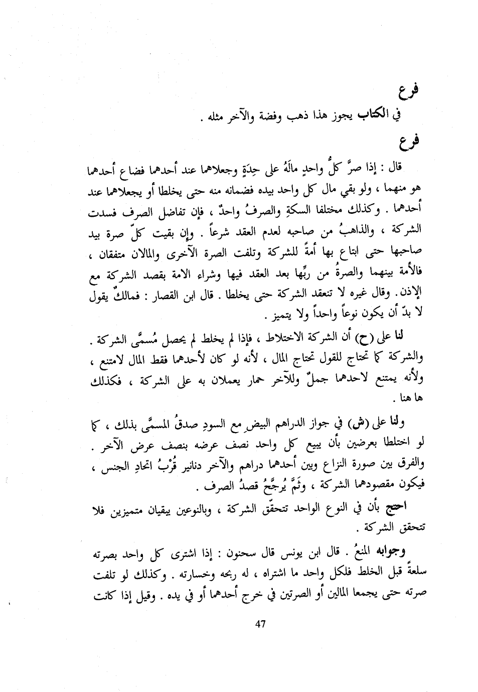 قَالَ: إِذَا صرَّ كُلُّ واحدٍ مَالَهُ عَلَى حِدَةٍ وَجَعَلَاهُمَا عِنْدَ أَحَدِهِمَا فَضَاعَ أَحَدُهُمَا هُوَ مِنْهُمَا وَلَوْ بَقِيَ مَالُ كُلِّ وَاحِدٍ بِيَدِهِ فَضَمَانُهُ مِنْهُ حَتَّى يَخْلِطَا أَو يجعلاهما عِنْد الشّركَة وَالذَّهَب مِنْ صَاحِبِهِ لِعَدَمِ الْعَقْدِ شَرْعًا وَإِنْ بَقِيَتْ كُلُّ صُرَّةٍ بِيَدِ صَاحِبِهَا حَتَّى ابْتَاعَ بِهَا أمة للشَّرِكَة وَتَلفت الصرة الْأُخْرَى المالان مُتَّفِقَانِ فَالْأَمَةُ بَيْنَهُمَا وَالصُّرَّةُ مِنْ ربِّها بَعْدَ الْعَقْدِ فِيهَا وَشِرَاءُ الْأَمَةِ بِقَصْدِ الشَّرِكَةِ مَعَ الْإِذْنِ وَقَالَ غَيْرُهُ لَا تَنْعَقِدُ الشَّرِكَةُ حَتَّى يخلطا قَالَ ابْن الْقصار: فمالكٌ يَقُول لابد أَن يكون نوعا وَاحِدًا وَلَا يَتَمَيَّزُ لَنَا عَلَى (ح) أَنَّ الشَّرِكَةَ الِاخْتِلَاطُ فَإِذا لم يخلط لَمْ يَحْصُلْ مُسمَّى الشَّرِكَةِ وَالشَّرِكَةُ كَمَا تَحْتَاجُ لِلْقَوْلِ وتحتاج المَال لِأَنَّهُ لَوْ كَانَ لِأَحَدِهِمَا فَقَطِ الْمَالُ لَامْتَنَعَ وَلِأَنَّهُ يَمْتَنِعُ لِأَحَدِهِمَا جملٌ وَلِلْآخَرِ حِمَارٌ يَعْمَلَانِ بِهِ عَلَى الشَّرِكَةِ فَكَذَلِكَ هَاهُنَا وَلَنَا عَلَى (ش) فِي جَوَازِ الدَّرَاهِمِ الْبِيضِ مَعَ السُّودِ صِدْقُ الْمُسَمَّى بِذَلِكَ كَمَا لَوِ اخْتَلَطَا بِعَرْضَيْنِ بِأَنْ يَبِيعَ كُلُّ وَاحِدٍ نِصْفَ عَرْضِهِ بِنِصْفِ عَرْضِ الْآخَرِ وَالْفَرْقُ بَيْنَ صُورَةِ النِّزَاعِ وَبَيْنَ أَحَدِهِمَا دَرَاهِمٌ وَالْآخِرُ دَنَانِيرُ قُرْبُ اتِّحَادِ الْجِنْسِ فَيَكُونُ مَقْصُودُهُمَا الشَّرِكَةَ وَثَمَّ يُرجح قَصْدُ الصَّرْفِ احْتَجَّ بِأَنَّ فِي النَّوْعِ الْوَاحِدِ تَتَحَقَّقُ الشَّرِكَةُ وَبِالنَّوْعَيْنِ يَبْقَيَانِ مُتَمَيِّزَيْنَ فَلَا تَتَحَقَّقُ الشَّرِكَةُ وَجَوَابُهُ الْمَنْعُ قَالَ ابْنُ يُونُسَ قَالَ سَحْنُونٌ: إِذَا اشْتَرَى كُلُّ وَاحِدٍ بِصُرَّتِهِ سِلْعَةً قَبْلَ الْخَلْطِ فَلِكُل وَاحِد مَا اشْتَرَاهُ لَهُ ربحه وخسارته وَكَذَلِكَ لَوْ تَلِفَتْ صُرَّتُهُ حَتَّى يَجْمَعَا الْمَالَيْنِ أَوِ الصُّرَّتَيْنِ فِي خُرْجِ أَحَدِهِمَا أَوْ فِي يَدِهِ وَقِيلَ إِذَا كَانَتْ