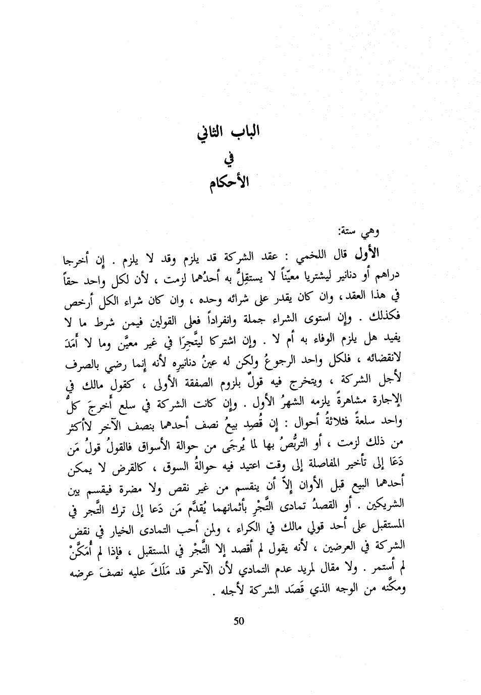 وَهِيَ سِتَّةٌ: الْأَوَّلُ قَالَ اللَّخْمِيُّ: عَقْدُ الشَّرِكَةِ قَدْ يَلْزَمُ وَقَدْ لَا يَلْزَمُ إِنْ أَخْرَجَا دَرَاهِمَ أَوْ دَنَانِيرَ لِيَشْتَرِيَا مُعَيَّنًا لَا يَسْتَقِلُّ بِهِ أَحَدُهُمَا لَزِمَتْ لِأَنَّ لِكُلِّ وَاحِدٍ حَقًّا فِي هَذَا الْعَقْدِ وَإِنْ كَانَ يَقْدِرُ عَلَى شِرَائِهِ وَحْدَهُ وَإِنْ كَانَ شِرَاءُ الْكُلِّ أَرْخَصَ فَكَذَلِكَ وَإِنِ اسْتَوَى الشِّرَاءُ جُمْلَةً وَانْفِرَادًا فَعَلَى الْقَوْلَيْنِ فَيمَنْ شَرَطَ مَا لَا يُفِيدُ هَلْ يَلْزَمُ الْوَفَاءُ بِهِ أَمْ لَا وَإِنِ اشْتَرَكَا لِيَتَّجِرَا فِي غَيْرِ مُعَيَّنٍ وَمَا لَا أَمَدَ لِانْقِضَائِهِ فَلِكُلِّ وَاحِدٍ الرُّجُوعُ وَلَكِنَّ لَهُ عَيْنَ دَنَانِيرِهِ لِأَنَّهُ إِنَّمَا رَضِيَ بِالصَّرْفِ لِأَجْلِ الشَّرِكَةِ وَيَتَخَرَّجُ فِيهِ قَوْلٌ بِلُزُومِ الصَّفْقَةِ الْأُولَى كَقَوْلِ مَالِكٍ فِي الْإِجَارَةِ مُشَاهَرَةً يَلْزَمُهُ الشَّهْرُ الْأَوَّلُ وَإِنْ كَانَتِ الشَّرِكَةُ فِي سِلَعٍ أَخْرَجَ كُلُّ وَاحِدٍ سِلْعَةً فَثَلَاثَةُ أَحْوَالٍ: إِنْ قُصد بَيْعُ نِصْفِ أَحَدِهِمَا بِنِصْفِ الآخر لَا أَكثر من ذَلِك لَزِمت أوالتربص بِهَا لِمَا يُرجى مِنْ حَوَالَةِ الْأَسْوَاقِ فَالْقَوْلُ قَوْلُ مَنْ دَعَا إِلَى تَأْخِيرِ الْمُفَاصَلَةِ إِلَى وَقْتٍ اعْتِيدَ فِيهِ حَوَالَةُ السُّوقِ كَالْقَرْضِ لَا يُمْكِنُ أَحَدُهُمَا الْبَيْعَ قَبْلَ الْأَوَانِ إِلَّا أَنْ يَنْقَسِمَ مِنْ غَيْرِ نَقْصٍ وَلَا مَضَرَّةٍ فَيُقَسَّمُ بَيْنَ الشَّرِيكَيْنِ أَوِ الْقَصْدُ تَمَادِي التَّجْرِ بِأَثْمَانِهِمَا يُقدَّم من دَعَا إِلَى ترك التَّدجر فِي الْمُسْتَقْبَلِ عَلَى أَحَدِ قَوْلَيْ مَالِكٍ فِي الْكِرَاءِ وَلِمَنْ أَحَبَّ التَّمَادِيَ الْخِيَارُ فِي نَقْضِ الشَّرِكَةِ فِي الْعَرْضَيْنِ لِأَنَّهُ يَقُولُ لَمْ أَقْصِدْ إِلَّا التَّجر فِي الْمُسْتَقْبَلِ فَإِذَا لَمْ أُمكن لَمْ أَسْتَمِرَّ وَلَا مَقَالَ لِمُرِيدِ عَدَمِ التَّمَادِي لِأَنَّ الْآخَرَ قَدْ مَلَكَ عَلَيْهِ نِصْفَ عَرْضِهِ ومكَّنه مِنَ الْوَجْهِ الَّذِي قَصَدَ الشَّرِكَةَ لِأَجْلِهِ