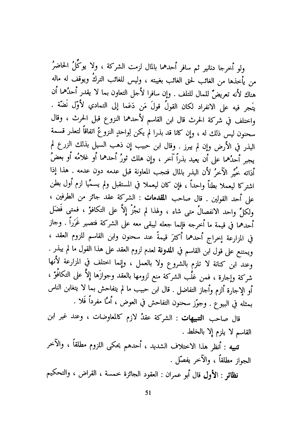 وَلَو اخرجنا دَنَانِيرَ ثُمَّ سَافَرَ أَحَدُهُمَا بِالْمَالِ لَزِمَتِ الشَّرِكَةُ وَلَا يوكِّل الْحَاضِرُ مَنْ يَأْخُذُهَا مِنَ الْغَائِبِ لِحَقِّ الْغَائِبِ بِغَيْبَتِهِ وَلَيْسَ لِلْغَائِبِ التَّرْكُ وَيُوقَفُ لَهُ مَالُهُ هُنَاكَ لِأَنَّهُ تعريضٌ لِلْمَالِ لِلتَّلَفِ وَإِن سافرا لِأَجْلِ التَّعَاوُنِ بِمَا لَا يَقْدِرُ أَحَدُهُمَا أَنْ يَتَّجِرَ فِيهِ عَلَى الِانْفِرَادِ لَكَانَ الْقَوْلُ قَوْلَ من دعما إِلَى التَّمَادِي لِأَوَّلِ نَضّة وَاخْتُلِفَ فِي شَرِكَةِ الْحَرْثِ قَالَ ابْنُ الْقَاسِمِ لِأَحَدِهِمَا النُّزُوعُ قَبْلَ الْحَرْثِ وَقَالَ سَحْنُونٌ لَيْسَ ذَلِكَ لَهُ وَإِنْ كَانَا قَدْ بَذَرَا لَمْ يَكُنْ لِوَاحِدٍ النُّزُوعُ اتِّفَاقًا لِتَعَذُّرِ قِسْمَةِ الْبَذْرِ فِي الْأَرْضِ وَإِنْ لم يبرز وَقَالَ ابْنُ حَبِيبٍ: إِنْ ذَهَبَ السَّيْلُ بِذَلِكَ الزَّرْعِ لَمْ يُجْبَرْ أَحَدُهُمَا عَلَى أَنْ يُعِيدَ بَذْرًا آخَرَ وَإِنْ هَلَكَ ثَوْرُ أَحَدِهِمَا أَوْ غُلَامُهُ أَوْ بَعْضُ أَدَاتِهِ خُيِّر الْآخَرُ لِأَنَّ الْبَذْرَ بِالْمَالِ فَتَجِبُ الْمُعَاوَنَةُ قَبْلَ عَدَمِهِ دُونَ عَدَمِهِ هَذَا إِذَا اشْتَرَكَا لِيَعْمَلَا بَطْنًا وَاحِدًا فَإِنْ كَانَ لِيَعْمَلَا فِي الْمُسْتَقْبَلِ وَلَمْ يُسميا لَزِمَ أَوَّلُ بَطْنٍ عَلَى أَحَدِ الْقَوْلَيْنِ قَالَ صَاحِبُ الْمُقَدِّمَاتِ: الشَّرِكَةُ عَقْدٌ جَائِزٌ مِنَ الطَّرَفَيْنِ وَلِكُلِّ وَاحِدٍ الِانْفِصَالُ مَتَى شَاءَ وَلِهَذَا لَمْ تجُز إِلَّا عَلَى التَّكَافُؤِ فَمَتَى فَضَلَ أَحَدُهُمَا فِي قِيمَةِ مَا أَخْرَجَهُ فَإِنَّمَا جَعَلَهُ لِيَبْقَى مَعَهُ عَلَى الشَّرِكَةِ فَتَصِيرُ غَرَرًا وَجَازَ فِي الْمُزَارِعَةِ إِخْرَاجُ أَحَدِهِمَا أَكْثَرَ قِيمَةً عِنْدَ سَحْنُونٍ وَابْنُ الْقَاسِمِ لِلُزُومِ الْعَقْدِ وَيَمْتَنِعُ عَلَى قَوْلِ ابْنِ الْقَاسِم فِي الْمُدَوَّنَة لعدم لُزُوم العقد عل هَذَا الْقَوْلِ مَا لَمْ يَبْذُرْ وَعِنْدَ ابْنِ كِنَانَةَ لَا تَلْزَمُ بِالشُّرُوعِ وَلَا بِالْعَمَلِ وَإِنَّمَا اخْتلف فِي الْمُزَارعَة لِأَنَّهَا شركَة وَإِجَارَة أَلْزَمَ وَأَجَازَ التَّفَاضُلَ قَالَ ابْنُ حَبِيبٍ: مَا لَمْ يَتَفَاحَشْ بِمَا لَا يَتَغَابَنُ النَّاسُ بِمِثْلِهِ فِي الْبُيُوعِ وَجَوَّزَ سَحْنُونٌ التَّفَاحُشَ فِي الْعِوَضِ أَمَّا مُفْرَدًا فَلَا قَالَ صَاحِبُ التَّنْبِيهَاتِ: الشَّرِكَةُ عَقْدٌ لَازِمٌ كَالْمُعَاوَضَاتِ وَعِنْدَ غَيْرِ ابْنِ الْقَاسِمِ لَا يَلْزَمُ إِلَّا بِالْخَلْطِ تَنْبِيهٌ: انْظُرْ هَذَا الِاخْتِلَافَ الشَّدِيدَ أَحَدُهُمْ يَحْكِي اللُّزُومَ مُطْلَقًا وَالْآخِرُ الْجَوَازَ مُطْلَقًا وَالْآخَرُ يُفَصِّلُ نَظَائِرٌ: الْأَوَّلُ قَالَ أَبُو عِمْرَانَ: الْعُقُودُ الْجَائِزَةُ خَمْسَةٌ الْقِرَاضُ وَالتَّحْكِيمُ