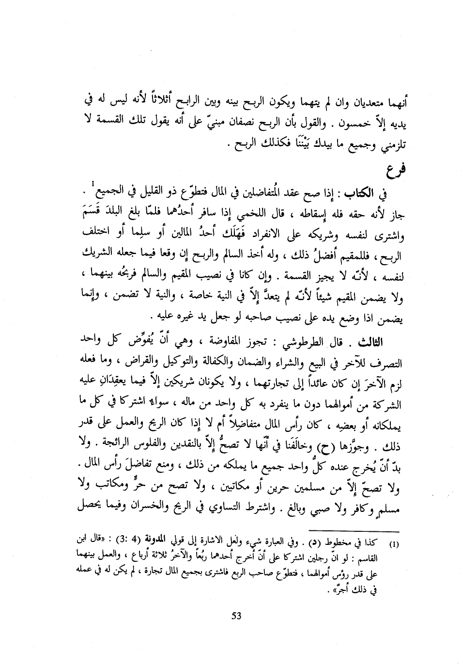 فِي الْكِتَابِ إِذَا صَحَّ عَقْدُ الْمُتَفَاضِلَيْنَ فِي الْمَالِ فَتَطَوَّعَ ذُو الْقَلِيلِ فِي الْجَمِيعِ جَازَ لِأَنَّهُ حَقُّهُ فَلَهُ إِسْقَاطُهُ قَالَ اللَّخْمِيُّ: إِذَا سَافَرَ أَحَدُهُمَا فَلَمَّا بَلَغَ الْبَلَدَ قَسَّمَ وَاشْتَرَى لِنَفْسِهِ وَشَرِيكِهِ عَلَى الِانْفِرَادِ فَهَلَكَ أَحَدُ الْمَالَيْنِ أَوْ سَلَّمَا أَوِ اخْتَلَفَ الرِّبْحُ فَلِلْمُقِيمِ أَفْضَلُ ذَلِكَ وَلَهُ أَخْذُ السَّالِمِ وَالرِّبْحُ إِنْ وَقَعَا فِيمَا جَعَلَهُ الشَّرِيكُ لِنَفْسِهِ لِأَنَّهُ لَا يُجِيزُ الْقِسْمَةَ وَإِنْ كَانَا فِي نَصِيبِ الْمُقِيمِ وَالسَّالِمِ فربحُه بَيْنَهُمَا وَلَا يَضْمَنُ الْمُقِيمُ شَيْئًا لِأَنَّهُ لَمْ يتعدَّ إِلَّا فِي النِّيَّةِ خَاصَّةً وَالنِّيَّةُ لَا تُضْمَنُ وَإِنَّمَا يَضْمَنُ إِذَا وَضَعَ يَدَهُ عَلَى نَصِيبِ صَاحِبِهِ لَوْ جَعَلَ يَد غَيره عَلَيْهِ الثَّالِثُ: قَالَ الطَّرْطُوشِيُّ: تَجُوزُ الْمُفَاوَضَةُ وَهِيَ أَنْ يُفوِّض كل وَاحِد التَّصَرُّف فِي الْبَيْعِ وَالشِّرَاءِ وَالضَّمَانِ وَالْكَفَالَةِ وَالتَّوْكِيلِ وَالْقِرَاضِ وَمَا فَعَلَهُ لَزِمَ الْآخَرَ إِنْ كَانَ عَائِدًا إِلَى تِجَارَتِهِمَا وَلَا يَكُونَانِ شَرِيكَيْنِ إِلَّا فِيمَا يَعْقِدَانِ عَلَيْهِ الشَّرِكَةَ مِنْ أَمْوَالِهِمَا دُونَ مَا يَنْفَرِدُ بِهِ كُلُّ وَاحِدٍ مِنْ مَالِهِ سواءٌ اشْتَرَكَا فِي كُلِّ مَا يَمْلِكَانِهِ أَوْ بَعْضِهِ كَانَ رَأْسُ الْمَالِ مُتَفَاضِلًا أَمْ لَا إِذَا كَانَ الرِّبْحُ وَالْعَمَلُ عَلَى قَدْرِ ذَلِكَ وجوَّزها (ح) وخالَفَنا فِي أَنَّهَا لَا تَصِحُّ إِلَّا بالنقدين والفلوس الرائجة ولابد أَنْ يُخرج عِنْدَهُ كُلُّ وَاحِدٍ جَمِيعَ مَا يَمْلِكُهُ مِنْ ذَلِكَ وَمَنَعَ تُفَاضُلَ رَأْسِ الْمَالِ وَلَا تَصِحُّ إِلَّا مِنْ مُسْلِمَيْنِ حُرَّيْنِ أَوْ مُكَاتَبَيْنِ وَلَا تَصِحُّ مِنْ حرٍّ وَمَكَاتَبٍ وَلَا مسلمٍ وَكَافِرٍ وَلَا صَبِيٍّ وَبَالِغٍ وَاشْتُرِطَ التَّسَاوِي فِي الرِّبْحِ وَالْخُسْرَانِ وَفِيمَا يَحْصُلُ