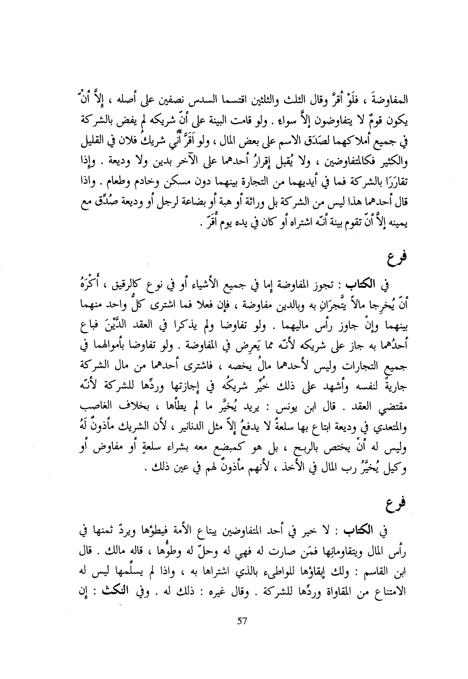 فِي الْكِتَابِ: تَجُوزُ الْمُفَاوَضَةُ إِمَّا فِي جَمِيعِ الْأَشْيَاءِ أَوْ فِي نَوْعٍ كَالرَّقِيقِ أكرَهُ أَنْ يُخرِجا مَالًا يَتَّجِرَانِ بِهِ وَبِالدَّيْنِ مُفَاوَضَةً فَإِنْ فَعَلَا فَمَا اشْتَرَى كُلُّ وَاحِدٍ مِنْهُمَا بَيْنَهُمَا وَإِنْ جَاوَزَ رَأْسَ مَالَيْهِمَا وَلَوْ تَفَاوَضَا وَلَمْ يَذْكُرَا فِي الْعَقْدِ الدَّين فَبَاعَ أحدُهما بِهِ جَازَ عَلَى شَرِيكِهِ لِأَنَّهُ مِمَّا يَعْرِضُ فِي الْمُفَاوَضَةِ وَلَوْ تَفَاوَضَا بِأَمْوَالِهِمَا فِي جَمِيعِ التِّجَارَاتِ وَلَيْسَ لِأَحَدِهِمَا مَالٌ يَخُصُّهُ فَاشْتَرَى أَحَدَهُمَا مِنْ مَالِ الشَّرِكَةِ جَارِيَةً لِنَفْسِهِ وَأَشْهَدَ عَلَى ذَلِكَ خُيِّر شَرِيكُهُ فِي إِجَازَتِهَا وردِّها لِلشَّرِكَةِ لِأَنَّهُ مُقْتَضَى الْعَقْدِ قَالَ ابْنُ يُونُسَ: يُرِيدُ يُخَّير مَا لَمْ يَطَأْهَا بِخِلَافِ الْغَاصِبِ والمتعدي فِي وَدِيعَةٍ ابْتَاعَ بِهَا سِلْعَةً لَا يدفعُ إِلَّا مِثْلَ الدَّنَانِيرِ لِأَنَّ الشَّرِيكَ مأذونٌ لَهُ وَلَيْسَ لَهُ أَنْ يَخْتَصَّ بِالرِّبْحِ بَلْ هُوَ كَمِبْضَعٍ مَعَهُ بِشِرَاءِ سلعةٍ أَوْ مُفَاوِضٍ أَوْ وَكِيلٍ يُخِّير رَبُّ الْمَالِ فِي الْأَخْذِ لِأَنَّهُمْ مَأْذُونٌ لَهُمْ فِي عَيْنِ ذَلِكَ