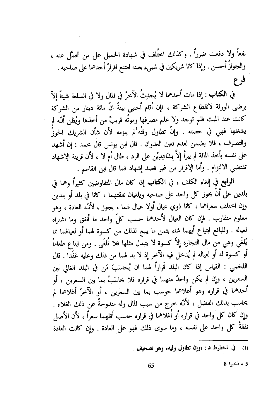 فِي الْكِتَابِ: إِذَا مَاتَ أَحَدُهُمَا لَا يُحدث الْآخَرُ فِي الْمَالِ وَلَا فِي السِّلْعَةِ شَيْئًا إِلَّا برضى الْوَرَثَةِ لِانْقِطَاعِ الشَّرِكَةِ فَإِنْ أَقَامَ أَجْنَبِيٌّ بَيِّنَةً أَنَّ مِائَةَ دِينَارٍ مِنَ الشَّرِكَةِ كَانَتْ عِنْدَ الْمَيِّتِ فَلَمْ تُوجَدْ وَلَا عَلِمَ مَصْرِفَهَا وَمَوْتُهُ قَرِيبٌ مِنْ أَخْذِهَا ويُظن أَنَّهُ لَمْ يَشْغَلْهَا فَهِيَ فِي حِصَّتِهِ وَإِنْ تَطَاوُلَ وَقْتُهُ لَمْ يَلْزَمْهُ لِأَنَّ شَأْنَ الشَّرِيكِ الْحَوْزُ وَالتَّصَرُّفُ فَلَا يَضْمَنُ لِعَدَمِ تَعَيُّنِ الْعُدْوَانِ قَالَ ابْنُ يُونُسَ قَالَ مُحَمَّدٌ: إِنْ أَشْهَدَ عَلَى نَفْسِهِ بِأَخْذِ الْمِائَةِ لَمْ يَبْرَأْ إِلَّا بِشَاهِدَيْنِ عَلَى الرَّدِّ طَالَ أَمْ لَا لِأَنَّ قَرِينَةَ الْإِشْهَادِ تَقْتَضِي الِالْتِزَامَ وَأَمَّا الْإِقْرَارُ مِنْ غَيْرِ قَصْدِ إِشْهَادٍ فَمَا قَالَ ابْنُ الْقَاسِمِ الرَّابِعُ فِي إِلْغَاءِ الْكَلَفِ فِي الْكِتَابِ إِذَا كَانَ مَالُ الْمُتَفَاوِضَيْنِ كثيرا وهما فِي بلدين على أَن يجوز كل وَاحِد على صَاحبه ويلغيان نَفَقَتَهُمَا كَانَا فِي بَلَدٍ أَوْ بَلَدَيْنٍ وَإِنِ اخْتلف سعراهما كَانَا ذَوي عِيَال أَولا عِيَالَ لَهُمَا يَجُوزُ لِأَنَّهُ الْعَادَةُ وَهُوَ مَعْلُومٌ مُتَقَارَبٌ فَإِنْ كَانَ الْعِيَالُ لِأَحَدِهِمَا حَسَبَ كُلُّ وَاحِدٍ مَا أَنْفَقَ وَمَا اشْتَرَاهُ لِعِيَالِهِ وَلِلْبَائِعِ ابْتِيَاعُ أَيِّهِمَا شَاءَ بِثَمَنِ مَا يَبِيعُ لِذَلِكَ مِنْ كُسْوَةٍ لَهُمَا أَوْ لِعِيَالِهِمَا مِمَّا يُلْغَى وَهِيَ مِنْ مَالِ التِّجَارَةِ إِلَّا كُسْوَةً لَا يَتَبَدَّلُ مِثْلُهَا فَلَا تُلْغَى وَمَنِ ابْتَاعَ طَعَامًا أَوْ كُسْوَةً لَهُ أَوْ لِعِيَالِهِ لَمْ يَدْخُلْ فِيهِ الْآخَرُ إِذْ لَا بُدَّ لَهُمَا مِنْ ذَلِكَ وَعَلَيْهِ عَقَدَا قَالَ اللَّخْمِيُّ: الْقِيَاسُ إِذَا كَانَ الْبَلَدُ قَرَارًا لَهُمَا أَنْ يُحَاسَبَ مَنْ فِي الْبَلَد الغالي بَيْنَ السِّعْرَيْنِ وَإِنْ لَمْ يَكُنْ وَاحِدٌ مِنْهُمَا فِي قَرَارِهِ فَلَا يُحَاسَبُ بِمَا بَيْنَ السِّعْرَيْنِ أَوْ أَحَدُهُمَا فِي قَرَارِهِ وَهُوَ أَغْلَاهُمَا حُوسِبَ بِمَا بَيْنَ السِّعْرَيْنِ أَوِ الْآخَرُ أَغْلَاهُمَا لَمْ يُحَاسَبْ بِذَلِكَ الْفَضْلِ لِأَنَّهُ خَرَجَ مِنْ سَبَبِ الْمَالِ وَلَهُ مَنْدُوحَةٌ عَنْ ذَلِكَ الْغَلَاءِ وَإِنْ كَانَ كُلُّ وَاحِدٍ فِي قَرَارِهِ أَوْ أَغْلَاهُمَا فِي قَرَارِهِ حَاسَبَ أَقَلَّهُمَا سِعْرًا لِأَنَّ الْأَصْلَ نَفَقَةُ كُلِّ وَاحِدٍ عَلَى نَفْسِهِ وَمَا سِوَى ذَلِكَ فَهُوَ عَلَى الْعَادَةِ وَإِنْ كَانَتِ الْعَادَةُ