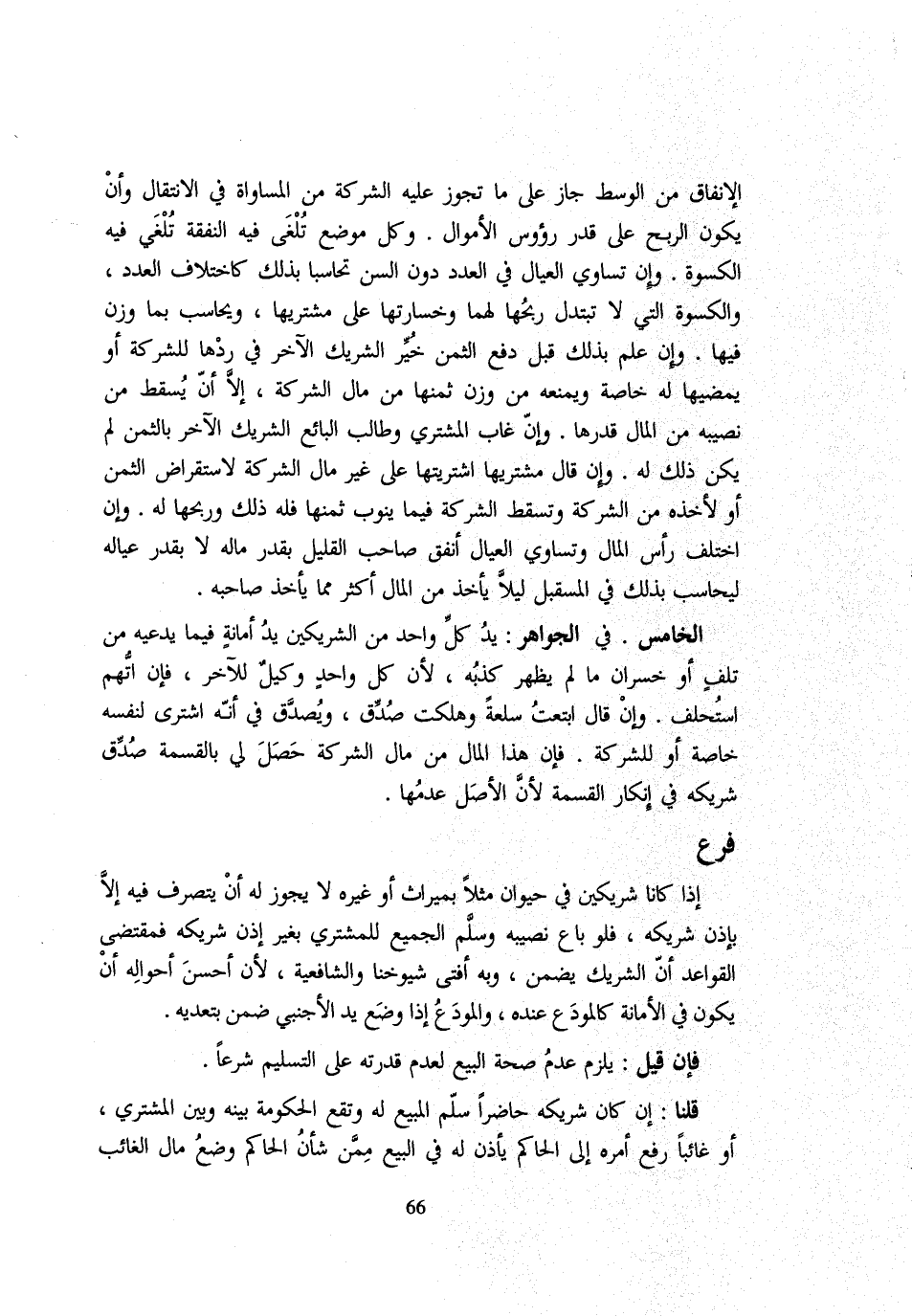 الْإِنْفَاقَ مِنَ الْوَسَطِ جَازَ عَلَى مَا تَجُوزُ عَلَيْهِ الشَّرِكَةُ مِنَ الْمُسَاوَاةِ فِي الِانْتِقَالِ وَأَنْ يكون الرِّبْح على قدر رُؤُوس الْأَمْوَالِ وَكُلُّ مَوْضِعٍ تُلْغَى فِيهِ النَّفَقَةُ تُلْغَى فِيهِ الْكُسْوَةُ وَإِنْ تَسَاوَى الْعِيَالُ فِي الْعَدَدِ دُونَ السِّنِّ تَحَاسَبَا بِذَلِكَ كَاخْتِلَافِ الْعَدَدِ وَالْكُسْوَةُ الَّتِي لَا تبتدل رِبْحُهَا لَهُمَا وَخَسَارَتُهَا عَلَى مُشْتَرِيهَا وَيُحَاسَبُ بِمَا وَزَنَ فِيهَا وَإِنْ عَلِمَ بِذَلِكَ قَبْلَ دَفْعِ الثَّمَنِ خُيِّرَ الشَّرِيكُ الْآخَرُ فِي رَدِّهَا لِلشَّرِكَةِ أَوْ يُمْضِيهَا لَهُ خَاصَّةً وَيَمْنَعُهُ مِنْ وَزْنِ ثَمَنِهَا مِنْ مَالِ الشَّرِكَةِ إِلَّا أَنْ يُسْقِطَ مِنْ نَصِيبِهِ مِنَ الْمَالِ قَدْرَهَا وَإِنْ غَابَ الْمُشْتَرِي وَطَالَبَ الْبَائِعُ الشَّرِيكَ الْآخَرَ بِالثَّمَنِ لَمْ يَكُنْ ذَلِكَ لَهُ وَإِنْ قَالَ مُشْتَرِيهَا اشْتَرَيْتُهَا عَلَى غَيْرِ مَالِ الشَّرِكَةِ لِاسْتِقْرَاضِ الثَّمَنِ أَوْ لِأَخْذِهِ مِنَ الشَّرِكَةِ وَتَسْقُطُ الشَّرِكَةُ فِيمَا يَنُوبُ ثَمَنُهَا فَلَهُ ذَلِكَ وَرِبْحُهَا لَهُ وَإِنِ اخْتَلَفَ رَأْسُ الْمَالِ وَتَسَاوَى الْعِيَالُ أَنْفَقَ صَاحِبَ الْقَلِيلِ بِقَدْرِ مَالِهِ لَا بِقَدْرِ عِيَالِهِ لِيُحَاسَبَ بِذَلِكَ فِي الْمُسْتَقْبل لَيْلًا يَأْخُذَ مِنَ الْمَالِ أَكْثَرَ مِمَّا يَأْخُذُ صَاحِبَهُ الْخَامِسُ فِي الْجَوَاهِرِ: يَدُ كُلِّ وَاحِدٍ مِنَ الشَّرِيكَيْنِ يَدُ أَمَانَةٍ فِيمَا يَدَّعِيهِ مِنْ تَلَفٍ أَوْ خُسْرَانٍ مَا لَمْ يَظْهَرْ كَذِبُهُ لِأَنَّ كُلَّ وَاحِدٍ وَكِيلٌ لِلْآخَرِ فَإِنِ اتُّهِمَ اسْتُحْلِفَ وَإِنْ قَالَ ابْتَعْتُ سِلْعَةً وَهَلَكَتْ صُدِّقَ وَيُصَدَّقُ فِي أَنَّهُ اشْتَرَى لِنَفْسِهِ خَاصَّةً أَوْ لِلشَّرِكَةِ فَإِن هَذَا الْمَالُ مِنْ مَالِ الشَّرِكَةِ حَصَلَ لِي بِالْقِسْمَةِ صُدِّقَ شَرِيكُهُ فِي إِنْكَارِ الْقِسْمَةِ لِأَنَّ الْأَصْلَ عَدَمُهَا