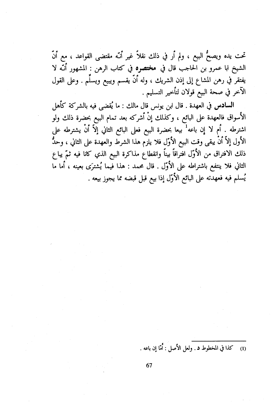 تَحْتَ يَدِهِ وَيَصِحُّ الْبَيْعُ وَلَمْ أَرَ فِي ذَلِكَ نَقْلًا غَيْرَ أَنَّهُ مُقْتَضَى الْقَوَاعِدِ مَعَ أَنَّ الشَّيْخَ أَبَا عَمْرِو بْنِ الْحَاجِبِ قَالَ فِي مُخْتَصَرِهِ فِي كِتَابِ الرَّهْنَ الْمَشْهُورُ أَنَّهُ لَا يَفْتَقِرُ فِي رَهْنِ الْمُشَاعِ إِلَى إِذْنِ الشَّرِيكِ وَلَهُ أَنْ يُقَسِّمَ وَيَبِيعَ وَيُسَلِّمَ وَعَلَى الْقَوْلِ الْآخَرِ فِي صِحَّةِ الْبَيْعِ قَوْلَانِ لِتَأْخِيرِ التَّسْلِيم السَّادِسُ فِي الْعُهْدَةِ قَالَ ابْنُ يُونُسَ قَالَ مَالِكٌ: مَا يُقْضَى فِيهِ بِالشَّرِكَةِ كَأَهْلِ الْأَسْوَاقِ فَالْعُهْدَةُ عَلَى الْبَائِعِ وَكَذَلِكَ إِنْ أَشْرَكَهُ بَعْدَ تَمَامِ الْبَيْعِ بِحَضْرَةِ ذَلِكَ وَلَوِ اشْتَرَطَهُ أَمْ لَا إِنْ بَاعَهُ بَيْعًا بِحَضْرَةِ الْبَيْعِ فَعَلَى الْبَائِعِ الثَّانِي إِلَّا أَنْ يَشْتَرِطَهُ عَلَى الْأَوَّلِ إِلَّا أَنْ يَبْقَى وَقْتُ الْبَيْعِ الْأَوَّلِ فَلَا يَلْزَمُ هَذَا الشَّرْطُ وَالْعُهْدَةُ عَلَى الثَّانِي وَحَدُّ ذَلِكَ الِافْتِرَاقُ مِنَ الْأَوَّلِ افْتِرَاقًا بَيِّنًا وَانْقِطَاعُ مُذَاكَرَةِ الْبَيْعِ الَّذِي كَانَا فِيهِ ثُمَّ يُبَاعُ الثَّانِي فَلَا يُنْتَفَعُ بِاشْتِرَاطِهِ عَلَى الْأَوَّلِ قَالَ مُحَمَّدٌ: هَذَا فِيمَا يُشْتَرَى بِعَيْنِهِ أَمَّا مَا يُسَلَّمُ فِيهِ فَعُهَدَتُهُ عَلَى الْبَائِعِ الْأَوَّلِ إِذَا بِيعَ قَبْلَ قَبْضِهِ مِمَّا يَجُوزُ بَيْعُهُ