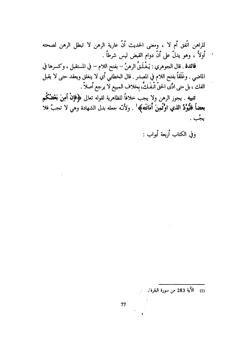 لِلرَّاهِنِ اتَّفَقَ أَمْ لَا وَمَعْنَى الْحَدِيثِ أَنَّ عَارِيَةَ الرَّهْنِ لَا تُبْطِلُ الرَّهْنَ لِصِحَّتِهِ أَوْلًا وَهُوَ يَدُلُّ عَلَى أَنَّ دَوَامَ الْقَبْضِ لَيْسَ شَرْطًا فَائِدَةٌ قَالَ الْجَوْهَرِيُّ: يَغْلَقُ الرَّهْنُ - بِفَتْحِ اللَّامِ - فِي الْمُسْتَقْبَلِ وَكَسْرِهَا فِي الْمَاضِي وَغَلَقًا بِفَتْحِ اللَّامِ فِي الْمَصْدَرِ قَالَ الْخَطَابِيُّ أَيْ لَا يَنْغَلِقُ وَيَعْقِدُ حَتَّى لَا يَقْبَلَ الْفَكَّ بَلْ مَتَى أَدَّى الْحَقَّ انْفَكَّ بِخِلَافِ الْمَبِيعِ لَا يَرْجِعُ أَصْلًا تَنْبِيهٌ يَجُوزُ الرَّهْنُ وَلَا يَجِبُ خِلَافًا لِلظَّاهِرِيَّةِ لِقَوْلِهِ تَعَالَى {فَإِنْ أَمِنَ بَعْضُكُمْ بَعْضًا فَلْيُؤَدِّ الَّذِي اؤْتُمِنَ أَمَانَته} وَلِأَنَّهُ جَعَلَهُ بَدَلَ الشَّهَادَةِ وَهِيَ لَا تَجِبُ فَلَا يَجِبُ وَفِي الْكِتَابِ أَرْبَعَةُ أَبْوَابٍ