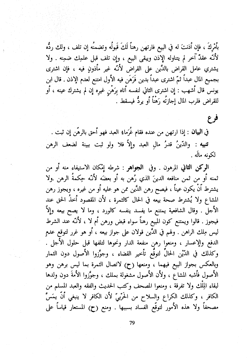فِي الْبَيَان: إِذا ارْتهن من عِنْده فَقَامَ غُرماء الْعَبْدِ فَهُوَ أَحَقُّ بِالرَّهْنِ إِنْ ثَبَتَ تَنْبِيهٌ: وَالدَّيْنُ قدرُ مَالِ الْعَبْدِ وَإِلَّا فَلَا وَلَوْ ثَبَتَ بِبَيِّنَةٍ لَضَعُفَ الرَّهْنُ لِكَوْنِهِ مَالَهُ الرُّكْنُ الثَّانِي الْمَرْهُونُ: وَفِي الْجَوَاهِرِ: شَرْطُهُ إِمْكَانُ الِاسْتِيفَاءِ مِنْهُ أَوْ مِنْ ثَمَنِهِ أَوْ مِنْ ثَمَنِ مَنَافِعِهِ الدَّيْنَ الَّذِي رُهِنَ بِهِ أَوْ بَعْضِهِ لِأَنَّهُ حِكْمَةُ الرَّهْنِ وَلَا يُشْتَرَطُ أَنْ يَكُونَ عَيْنًا فَيَصِحُّ رَهْنُ الدَّيْنِ مِمَّنْ هُوَ عَلَيْهِ أَوْ مِنْ غَيْرِهِ وَيَجُوزُ رَهْنُ الْمَشَاعِ وَلَا يُشْتَرَطُ صِحَّةُ بَيْعِهِ فِي الْحَالِ كَالثَّمَرَةِ لِأَنَّ الْمَقْصُودَ أَخْذُ الْحَقِّ عِنْدَ الْأَجَلِ وَقَالَ الشَّافِعِيَّةُ يَمْتَنِعُ مَا يَفْسُدُ بِنَفْسِهِ كَالْوَرْدِ وَمَا لَا يَصح بَيْعه وَإِلَّا فيحوز قَالُوا وَيَمْتَنِعُ كَوْنُ الْمَبِيعِ رَهْنًا سَوَاءٌ قُبِضَ وَرُهِنَ أَمْ لَا لِأَنَّهُ عِنْدَ الشَّرْطِ لَيْسَ ملك الرَّاهِن وَلَهُم فِي الدَّين قَوْلَانِ عَلَى جَوَازِ بَيْعِهِ أَوْ هُوَ غَرَرٌ لِتَوَقُّعِ عَدَمِ الدَّفْعِ وَالْإِعْسَارِ وَمَنَعُوا رَهْنَ مَنْفَعَةِ الدَّارِ وَنَحْوِهَا لِتَلَفِهَا قَبْلَ حُلُولِ الْأَجَلِ وَكَذَلِكَ فِي الدّين الْحَال لتوقع تَأْخِير الْقَضَاءِ وجوَّزوا الْأُصُولَ دُونَ الثِّمَارِ وَبِالْعَكْسِ بِجَوَازِ الْبَيْعِ فِيهِمَا وَمَنَعَهَا (ح) لِاتِّصَالِ الثَّمَرَةِ بِمَا لَيْسَ بِرَهْنٍ وَهُوَ الْأُصُولُ فَأَشْبَهَ الْمُشَاعَ وَلِأَنَّ الْأُصُولَ مَشْغُولَةٌ بِمِلْكٍ وَجَوَّزُوا الْأَمَةَ دُونَ وَلَدِهَا لِبَقَاءِ الْمِلْكِ وَلَا تَفْرِقَةَ وَمَنَعُوا الْمُصْحَفَ وَكُتُبَ الحَدِيث وَالْفِقْه وَالْعَبْد الْمُسلم من الْكَافِر وَكَذَلِكَ الْكُرَاعُ وَالسِّلَاحُ مِنَ الْحَرْبِيِّ لِأَنَّ الْكَافِرَ لَا يَنْبَغِي أَنْ يَمَسَّ مُصْحَفًا وَلَا هَذِهِ الْأُمُورُ لِتَوَقُّعِ الْفَسَادِ بِسَبَبِهَا وَمَنَعَ (ح) الْمُسْتَعَارَ قِيَاسًا على