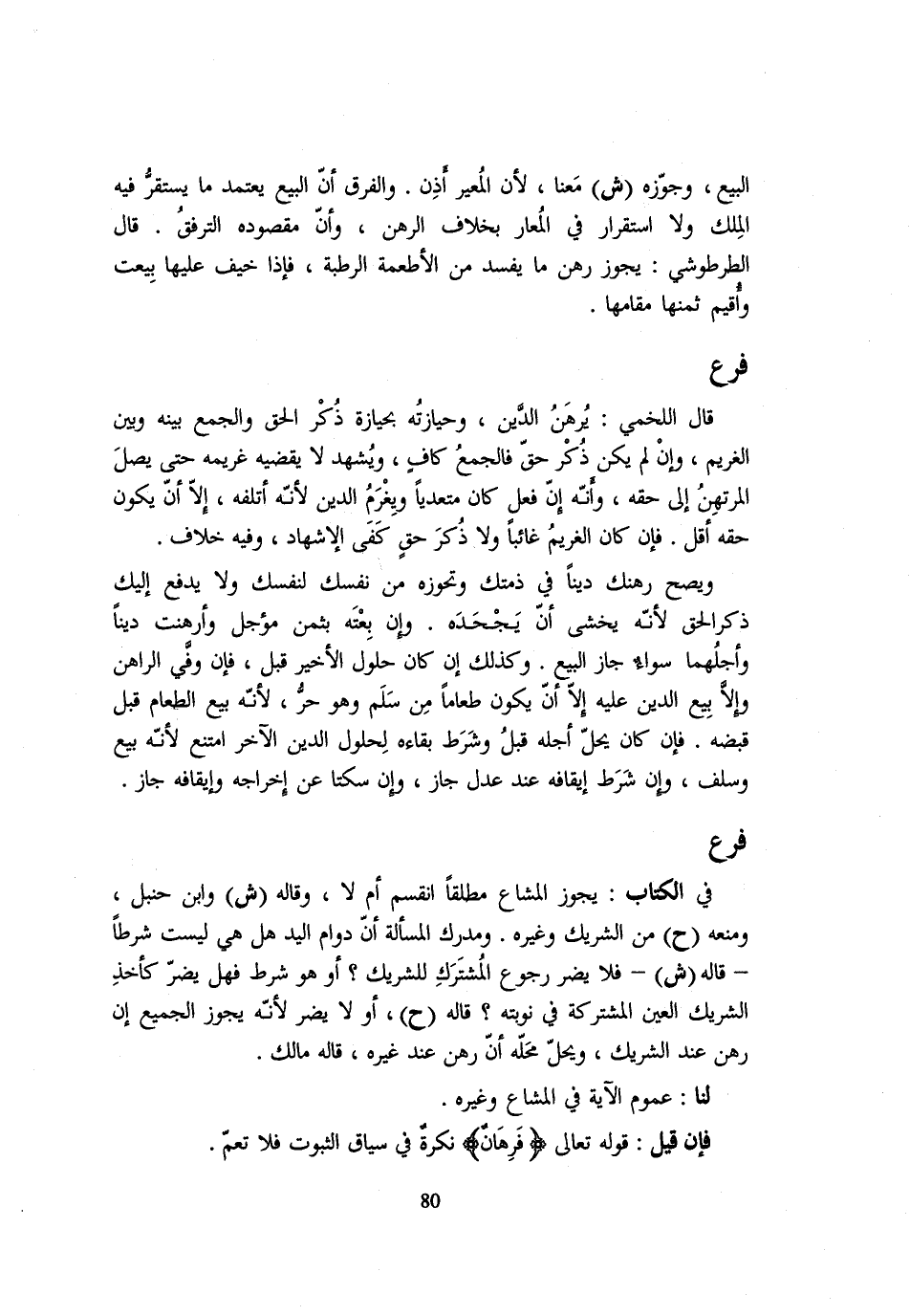 فِي الْكِتَابِ: يَجُوزُ الْمُشَاعُ مُطْلَقًا انْقَسَمَ أَمْ لَا وَقَالَهُ (ش) وَابْنُ حَنْبَلٍ وَمَنَعَهُ (ح) مِنَ الشَّرِيكِ وَغَيْرِهِ وَمُدْرَكُ الْمَسْأَلَةِ أَنَّ دَوَامَ الْيَدِ هَلْ هِيَ لَيْسَتْ شَرْطًا - قَالَهُ (ش) - فَلَا يَضُرُّ رُجُوعُ الْمُشْتَرِكِ لِلشَّرِيكِ أَوْ هُوَ شَرْطٌ فَهَلْ يَضُرُّ كَأَخْذِ الشَّرِيكِ الْعَيْنَ الْمُشْتَرَكَةَ فِي نَوْبَتِهِ قَالَهُ (ح) أَوْ لَا يَضُرُّ لِأَنَّهُ يَجُوزُ الْجَمِيعُ إِنْ رَهَنَ عِنْدَ الشَّرِيكِ وَيَحِلُّ مَحَلَّهُ إِنْ رَهَنَ عِنْدَ غَيْرِهِ قَالَهُ مَالِكٌ لَنَا: عُمُومُ الْآيَةِ فِي الْمُشَاعِ وَغَيْرِهِ فَإِنْ قيل: قَوْله تَعَالَى {فرهان} نَكِرَةٌ فِي سِيَاقِ الثُّبُوتِ فَلَا تَعُمُّ