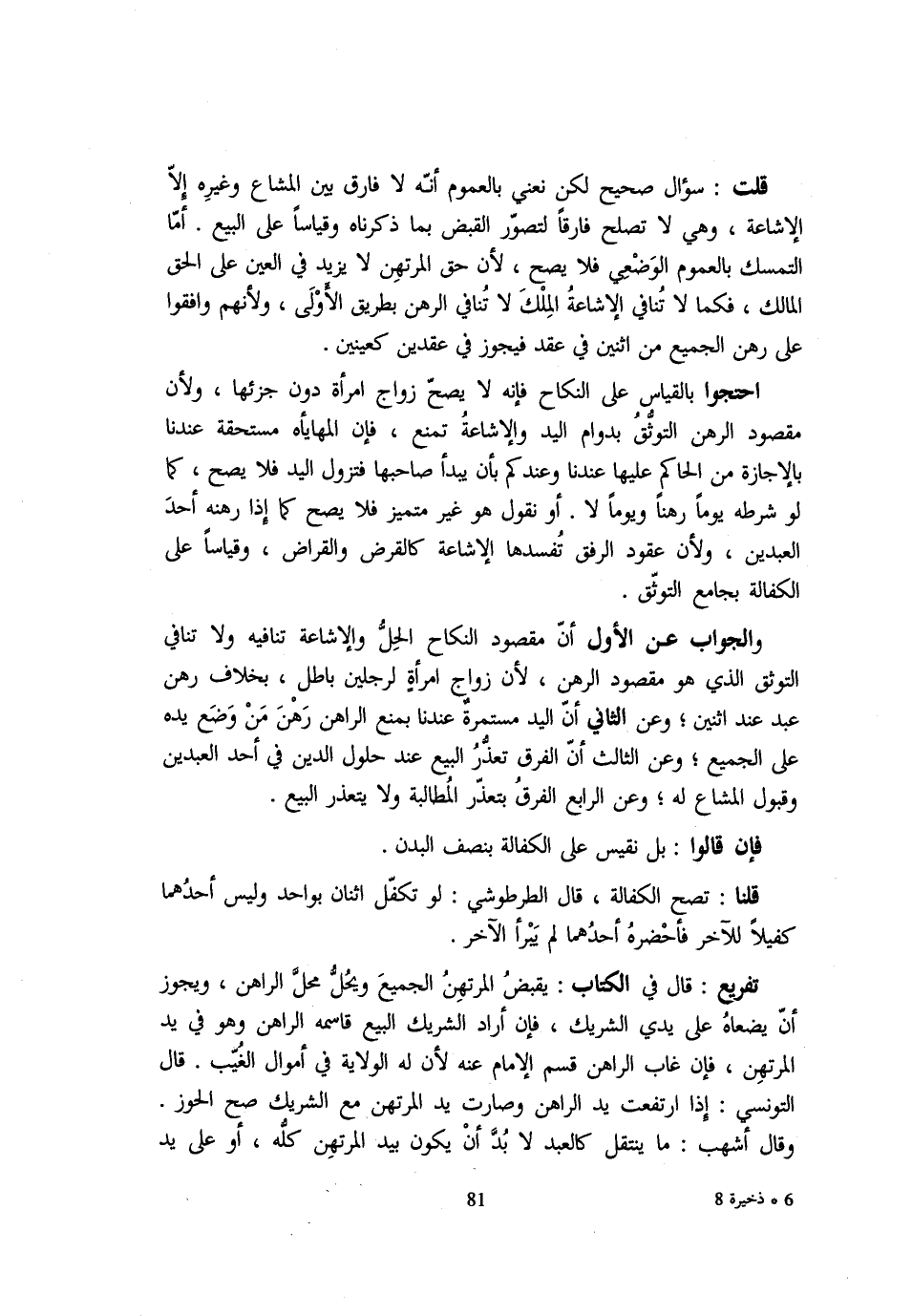 قلت: سُؤال صَحِيح لَكِن نَعْنِي بِالْعُمُومِ أَنَّهُ لَا فَارِقَ بَيْنَ الْمُشَاعِ وَغَيره إِلَّا الإشاعة وَهِيَ لَا تَصْلُحُ فَارِقًا لِتَصَوُّرِ الْقَبْضِ بِمَا ذَكَرْنَاهُ وَقِيَاسًا عَلَى الْبَيْعِ أَمَّا التَّمَسُّكُ بِالْعُمُومِ الْوَضْعِيِّ فَلَا يَصِحُّ لِأَنَّ حَقَّ الْمُرْتَهِنِ لَا يزِيد فِي الْعين على الْحق الْمَالِكِ فَكَمَا لَا تُنَافِي الْإِشَاعَةُ الْمِلْكَ لَا تُنَافِي الرَّهْنَ بِطَرِيقِ الْأَوْلَى وَلِأَنَّهُمْ وَافَقُوا عَلَى رَهْنِ الْجَمِيعِ مِنِ اثْنَيْنِ فِي عَقْدٍ فَيَجُوزُ فِي عَقْدَيْنِ كَعَيْنَيْنِ احْتَجُّوا بِالْقِيَاسِ عَلَى النِّكَاحِ فَإِنَّهُ لَا يَصِحُّ زَوَاجُ امْرَأَةٍ دُونَ جُزْئِهَا وَلِأَنَّ مَقْصُودَ الرَّهْنِ التَّوَثُّقُ بِدَوَامِ الْيَدِ وَالْإِشَاعَةُ تَمْنَعُ فَإِنَّ الْمُهَايَأَةَ مُسْتَحَقَّةٌ عِنْدَنَا بِالْإِجَازَةِ مِنَ الْحَاكِمِ عَلَيْهَا عِنْدَنَا وَعِنْدَكُمْ بِأَنْ يَبْدَأَ صَاحِبُهَا فنزول الْيَدُ فَلَا يَصِحُّ كَمَا لَوْ شَرَطَهُ يَوْمًا رَهْنًا وَيَوْمًا لَا أَوْ نَقُولُ هُوَ غَيْرُ مُتَمَيِّزٍ فَلَا يَصِحُّ كَمَا إِذَا رَهَنَهُ أَحَدَ الْعَبْدَيْنِ وَلِأَنَّ عُقُودَ الرِّفْقِ تُفْسِدُهَا الْإِشَاعَةُ كَالْقَرْضِ وَالْقِرَاضِ وَقِيَاسًا عَلَى الْكَفَالَةِ بِجَامِعِ التَّوَثُّقِ وَالْجَوَابُ عَنِ الْأَوَّلِ أَنَّ مَقْصُودَ النِّكَاحِ الْحِلُّ وَالْإِشَاعَةُ تُنَافِيهِ وَلَا تُنَافِي التَّوَثُّقَ الَّذِي هُوَ مَقْصُودُ الرَّهْنِ لِأَنَّ زَوَاجَ امْرَأَةٍ لِرَجُلَيْنِ بَاطِلٌ بِخِلَافِ رَهْنِ عَبْدٍ عِنْدَ اثْنَيْنِ وَعَنِ الثَّانِي أَنَّ الْيَدَ مُسْتَمِرَّةٌ عِنْدَنَا بِمَنْعِ الرَّاهِنِ رَهْنَ مَنْ وَضَعَ يَدَهُ عَلَى الْجَمِيعِ وَعَنِ الثَّالِثِ أَنَّ الْفَرْقَ تَعَذُّرُ الْبَيْعِ عِنْدَ حُلُولِ الدَّيْنِ فِي أَحَدِ الْعَبْدَيْنِ وَقَبُولُ الْمُشَاعِ لَهُ وَعَنِ الرَّابِعِ الْفرق يتَعَذَّر الْمُطَالَبَةِ وَلَا يَتَعَذَّرُ الْبَيْعُ فَإِنْ قَالُوا بَلْ نَقِيسُ عَلَى الْكَفَالَةِ بِنِصْفِ الْبَدَنِ قُلْنَا: تَصِحُّ الْكَفَالَةُ قَالَ الطَّرْطُوشِيُّ لَوْ تَكَفَّلَ اثْنَانِ بِوَاحِدٍ وَلَيْسَ أَحَدُهُمَا كَفِيلًا لِلْآخَرِ فَأَحْضَرَهُ أَحَدُهُمَا لَمْ يَبْرَأِ الْآخَرُ تَفْرِيعٌ: قَالَ فِي الْكِتَابِ: يَقْبِضُ الْمُرْتَهِنُ الْجَمِيعَ وَيَحِلُّ مَحَلَّ الرَّاهِنِ وَيَجُوزُ أَنْ يَضَعَاهُ عَلَى يَدَيِ الشَّرِيكِ فَإِنْ أَرَادَ الشَّرِيكُ الْبَيْعَ قَاسَمَهُ الرَّاهِنُ وَهُوَ فِي يَدِ الْمُرْتَهِنُ فَإِنْ غَابَ الرَّاهِنُ قَسَّمَ الْإِمَامُ عَنْهُ لِأَنَّ لَهُ الْوِلَايَةَ فِي أَمْوَالِ الْغَيْبِ قَالَ التُّونِسِيُّ: إِذَا ارْتَفَعَتْ يَدُ الرَّاهِنِ وَصَارَتْ يَدُ الْمُرْتَهِنِ مَعَ الشَّرِيكِ صَحَّ الْحَوْزُ وَقَالَ أَشْهَبُ: مَا يَنْتَقِلُ كَالْعَبْدِ لَا بُدَّ أَنْ يَكُونَ بِيَدِ الْمُرْتَهِنِ كُلِّهِ أَوْ عَلَى يَدِ