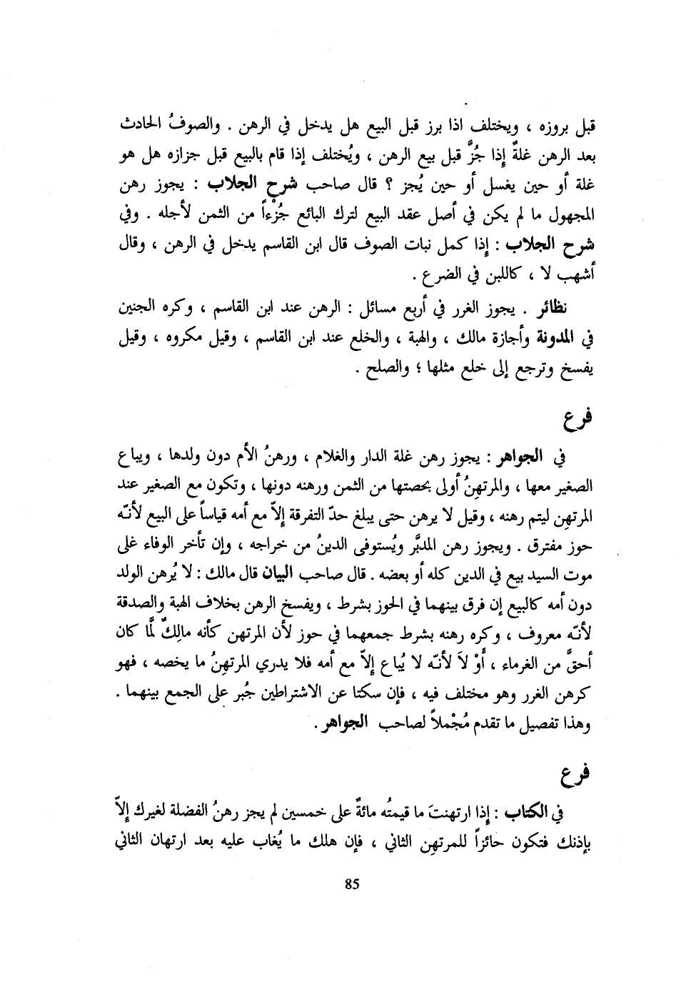 فِي الْجَوَاهِرِ: يَجُوزُ رَهْنُ غَلَّةِ الدَّارِ وَالْغُلَامِ وَرَهْنُ الْأُمِّ دُونَ وَلَدِهَا وَيُبَاعُ الصَّغِيرُ مَعَهَا والمرتهِن أَوْلَى بِحِصَّتِهَا مِنَ الثَّمَنِ وَرَهْنُهُ دُونَهَا وَتَكُونُ مَعَ الصَّغِيرِ عِنْدَ المرتهِن لِيُتْمَّ رَهْنَهُ وَقِيلَ لَا يُرْهَنُ حَتَّى يَبْلُغَ حَدَّ التَّفْرِقَةِ إِلَّا مَعَ أُمِّهِ قِيَاسًا عَلَى الْبَيْعِ لِأَنَّهُ حَوْزٌ مُفْتَرَقٌ وَيَجُوزُ رَهْنُ المدَّبر ويُستوفي الدّين من خراجه وَإِن تَأَخّر الْوَفَاء على مَوْتِ السَّيِّدِ بِيعَ فِي الدَّيْنِ كُلِّهِ أَوْ بَعْضِهِ قَالَ صَاحِبُ الْبَيَانِ قَالَ مَالِكٌ: لَا يُرهن الْوَلَدُ دُونَ أُمِّهِ كَالْبَيْعِ إِنْ فَرَّقَ بَيْنَهُمَا فِي الْحَوْزِ بِشَرْطٍ وَيُفْسَخُ الرَّهْنُ بِخِلَافِ الْهِبَةِ وَالصَّدَقَةِ لِأَنَّهُ مَعْرُوفٌ وَكُرِهَ رَهْنُهُ بِشَرْطِ جَمْعِهِمَا فِي حَوْزٍ لِأَنَّ الْمُرْتَهِنَ كَأَنَّهُ مَالِكٌ لما كَانَ أحقَّ من الْغُرَمَاء أَو لَا لِأَنَّهُ لَا يُباع إِلَّا مَعَ أُمِّهِ فَلَا يَدْرِي الْمُرْتَهِنُ مَا يَخُصُّهُ فَهُوَ كَرَهَنِ الْغَرَرِ وَهُوَ مُخْتَلف فِيهِ فَإِن سكتا عَنِ الِاشْتِرَاطَيْنِ جُبر عَلَى الْجَمْعِ بَيْنَهُمَا وَهَذَا تَفْصِيلُ مَا تَقَدَّمَ مُجملاً لِصَاحِبِ الْجَوَاهِرِ