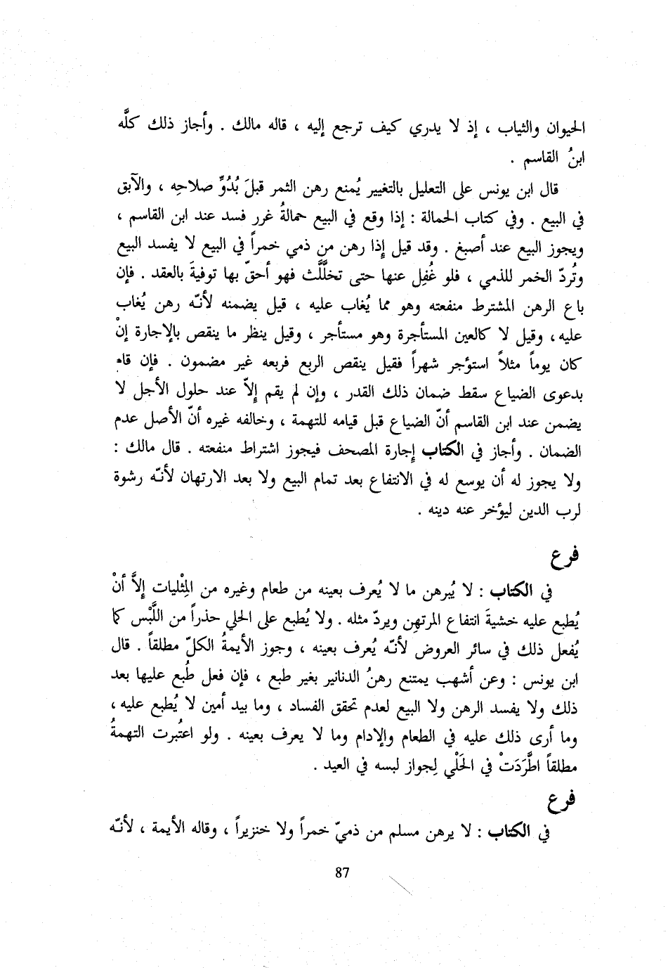 الْحَيَوَانِ وَالثِّيَابِ إِذْ لَا يَدْرِي كَيْفَ تَرْجِعُ إِلَيْهِ قَالَهُ مَالِكٌ وَأَجَازَ ذَلِكَ كُلَّهُ ابْنُ الْقَاسِمِ قَالَ ابْنُ يُونُسَ عَلَى التَّعْلِيلِ بِالتَّغْيِيرِ يُمْنَعُ رَهْنُ الثَّمَرِ قَبْلَ بُدُوِّ صَلَاحِهِ وَالْآبِقُ فِي البيع وَفِي كتاب الْحمالَة: إِذْ وَقَعَ فِي الْبَيْعِ حَمَالَةُ غَرَرٍ فَسَدَ عِنْدَ ابْنِ الْقَاسِمِ وَيَجُوزُ الْبَيْعُ عِنْدَ أَصْبَغَ وَقَدْ قِيلَ إِذَا رَهَنَ مِنْ ذِمِّيٍّ خَمْرًا فِي الْبَيْعِ لَا يَفْسُدُ الْبَيْعُ وَتُرَدُّ الْخَمْرُ لِلذِّمِّيِّ فَلَوْ غُفِلَ عَنْهَا حَتَّى تَخَلَّلَتْ فَهُوَ أَحَقُّ بِهَا تَوْفِيَةً بِالْعَقْدِ فَإِنْ بَاعَ الرَّهْنَ الْمُشْتَرَطَ منفعَته وَهُوَ مِمَّا يُغَاب عَلَيْهِ قبل يضمنهُ لِأَنَّهُ رهن يُغَاب عَلَيْهِ وَقبل لَا كَالْعَيْنِ الْمُسْتَأْجَرَةِ وَهُوَ مُسْتَأْجَرٌ وَقِيلَ يَنْظُرُ مَا يَنْقُصُ بِالْإِجَارَةِ إِنْ كَانَ يَوْمًا مَثَلًا اسْتُؤْجِرَ شَهْرًا فَقِيلَ يُنْقَصُ الرُّبُعُ فَرُبُعُهُ غَيْرُ مَضْمُونٍ فَإِنْ قَامَ بِدَعْوَى الضَّيَاعِ سَقَطَ ضَمَانُ ذَلِكَ الْقَدْرِ وَإِنْ لَمْ يَقُمْ إِلَّا عِنْدَ حُلُولِ الْأَجَلِ لَا يَضْمَنُ عِنْدَ ابْنِ الْقَاسِمِ أَنَّ الضَّيَاعَ قَبْلَ قِيَامِهِ لِلتُّهْمَةِ وَخَالَفَهُ غَيْرُهُ أَنَّ الْأَصْلَ عَدَمُ الضَّمَانِ وَأَجَازَ فِي الْكِتَابِ إِجَارَةَ الْمُصْحَفِ فَيَجُوزُ اشْتِرَاطُ مَنْفَعَتِهِ قَالَ مَالِكٌ: وَلَا يَجُوزُ لَهُ أَنْ يُوَسِّعَ لَهُ فِي الِانْتِفَاعِ بَعْدَ تَمَامِ الْبَيْعِ وَلَا بَعْدَ الِارْتِهَانِ لِأَنَّهُ رِشْوَةٌ لِرَبِّ الدَّيْنِ لِيُؤَخِّرَ عَنْهُ دَيْنَهُ