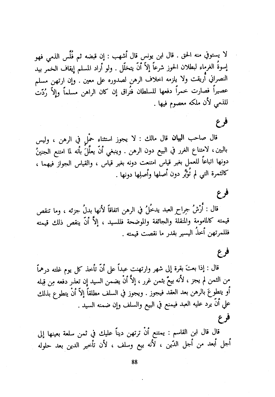 3 - (88 قَالَ قَالَ ابْنُ الْقَاسِمِ: يَمْتَنِعُ أَنْ تَرْتَهِنَ)