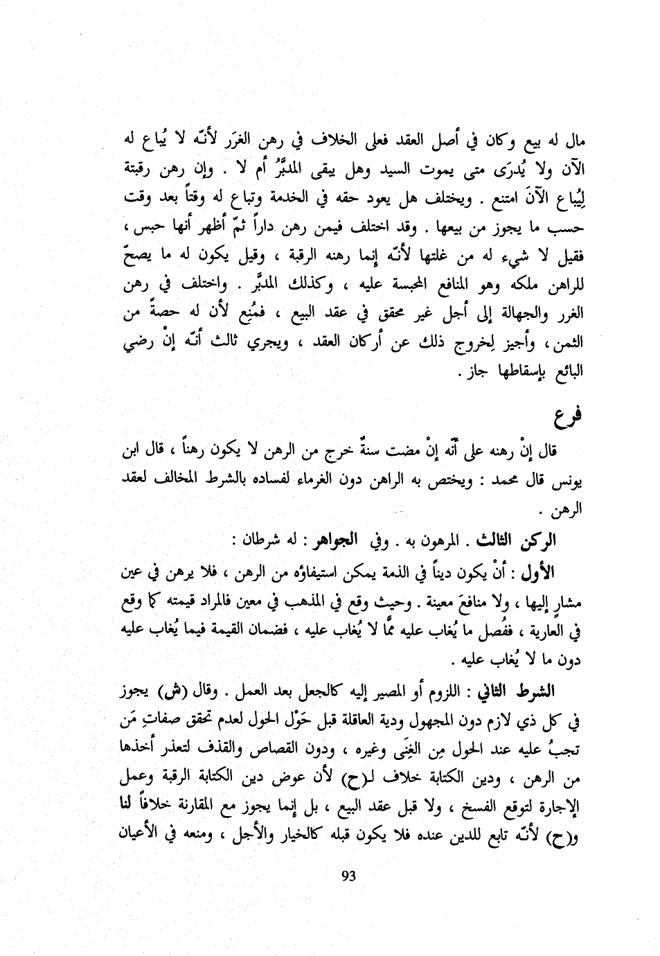 قَالَ إِنْ رَهَنَهُ عَلَى أَنَّهُ إِنْ مَضَتْ سَنَةٌ خَرَجَ مِنَ الرَّهْنِ لَا يَكُونُ رَهْنًا قَالَ ابْنُ يُونُسَ قَالَ مُحَمَّدٌ: وَيخْتَص بِهِ الرَّاهِنُ دُونَ الْغُرَمَاءِ لِفَسَادِهِ بِالشَّرْطِ الْمُخَالِفِ لِعَقْدِ الرَّهْنِ الرُّكْنُ الثَّالِثُ الْمَرْهُونُ بِهِ وَفِي الْجَوَاهِرِ: لَهُ شَرْطَانٌ: الْأَوَّلُ: أَنْ يَكُونَ دَيْنًا فِي الذِّمَّةِ يُمْكِنُ اسْتِيفَاؤُهُ مِنَ الرَّهْنِ فَلَا يُرْهَنُ فِي عَيْنٍ مُشَارٍ إِلَيْهَا وَلَا مَنَافِعَ مُعَيَّنَةٍ وَحَيْثُ وَقَعَ فِي الْمَذْهَبِ فِي مُعَيَّنٍ فَالْمُرَادُ قِيمَتُهُ كَمَا وَقَعَ فِي الْعَارِيَةِ فَفَصَلَ مَا يُغَابُ عَلَيْهِ مِمَّا لَا يُغَابُ عَلَيْهِ فَضَمَانُ الْقِيمَةِ فِيمَا يُغَابُ عَلَيْهِ دُونَ مَا لَا يُغَابُ عَلَيْهِ الشَّرْطُ الثَّانِي: اللُّزُومُ أَوِ الْمَصِيرُ إِلَيْهِ كَالْجُعْلِ بَعْدَ الْعَمَلِ وَقَالَ (ش) يَجُوزُ فِي كُلِّ ذِي لَازِمٍ دُونَ الْمَجْهُولِ ودية الْعَاقِلَة قبل حول الْحَوْلِ لِعَدَمِ تَحَقُّقِ صِفَاتِ مَنْ تَجِبُ عَلَيْهِ عِنْد الْحول مِنَ الْغِنَى وَغَيْرِهِ وَدُونَ الْقِصَاصِ وَالْقَذْفِ لِتَعَذُّرِ أَخذهَا من الرَّهْن وَدين الْكِتَابَة خلاف لِ (ح) لِأَنَّ عِوَضَ دَيْنِ الْكِتَابَةِ الرَّقَبَةُ وَعَمَلُ الْإِجَارَةِ لِتَوَقُّعِ الْفَسْخِ وَلَا قَبْلَ عَقْدِ الْبَيْعِ بَلْ إِنَّمَا يَجُوزُ مَعَ الْمُقَارَنَةِ خِلَافًا لَنَا وَ (ح) لِأَنَّهُ تَابِعٌ لِلدَّيْنِ عِنْدَهُ فَلَا يَكُونُ قَبْلَهُ كَالْخِيَارِ وَالْأَجَلِ وَمَنَعُهُ فِي الْأَعْيَان