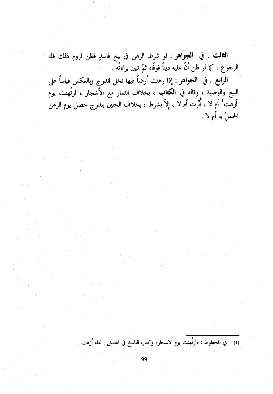 الثَّالِثُ فِي الْجَوَاهِرِ لَوْ شَرَطَ الرَّهْنَ فِي بَيْعٍ فَاسِدٍ فَظَنَّ لُزُومَ ذَلِكَ فَلَهُ الرُّجُوعُ كَمَا لَوْ ظَنَّ أَنَّ عَلَيْهِ دَيْنًا فَوَفَّاهُ ثُمَّ تَبَيَّنَ بَرَاءَتُهُ الرَّابِعُ فِي الْجَوَاهِرِ: إِذَا رَهَنْتَ أَرْضًا فِيهَا نَخْلٌ انْدَرَجَ وَبِالْعَكْسِ قِيَاسًا عَلَى الْبَيْعِ وَالْوَصِيَّةِ وَقَالَهُ فِي الْكِتَابِ بِخِلَافِ الثِّمَارِ مَعَ الْأَشْجَارِ ارْتُهِنَتْ يَوْمَ أَزْهَتْ أَمْ لَا أُبِّرَتْ أَمْ لَا إِلَّا بِشَرْطٍ بِخِلَافِ الْجَنِينِ يَنْدَرِجُ حَصَلَ يَوْمَ الرَّهْنِ الْحَمْلُ بِهِ أم لَا