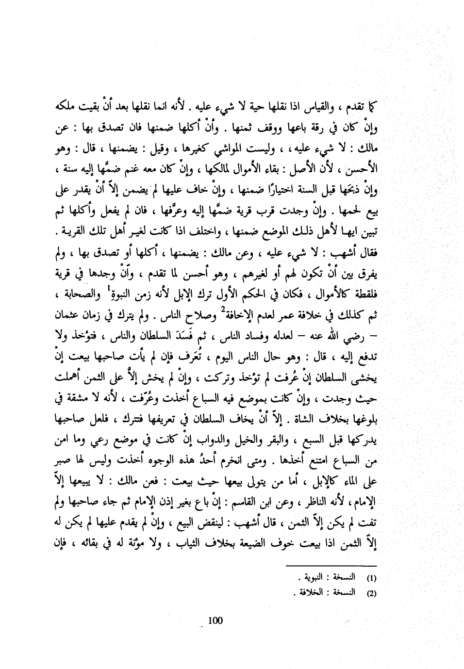 كَمَا تَقَدَّمَ وَالْقِيَاسُ إِذَا نَقَلَهَا حَيَّةً لَا شَيْءَ عَلَيْهِ لِأَنَّهُ إِنَّمَا نَقَلَهَا بَعْدَ أَنْ بَقِيَتْ مِلْكَهُ وَإِنْ كَانَ فِي رِقَّةٍ بَاعَهَا وَوَقَفَ ثَمَنَهَا وَإِنْ أَكَلَهَا ضَمِنَهَا فَإِنْ تَصَدَّقَ بِهَا عَنْ مَالِكٍ لَا شَيْءَ عَلَيْهِ وَلَيْسَتِ الْمَوَاشِي كَغَيْرِهَا وَقِيلَ يَضْمَنُهَا قَالَ وَهُوَ الْأَحْسَنُ لِأَنَّ الْأَصْلَ بَقَاءُ الْأَمْوَالِ لِمَالِكِهَا وَإِنْ كَانَ مَعَه غنم ضمنهَا إِلَيْهِ سنة اخْتِيَارا وَإِن ذَبحهَا قبل السّنة ضَمِنَهَا وَإِنْ خَافَ عَلَيْهَا لَمْ يَضْمَنْ إِلَّا أَنْ يَقْدِرَ عَلَى بَيْعِ لَحْمِهَا وَإِنْ وُجِدَتْ قُرْبَ قَرْيَةٍ ضَمَّهَا إِلَيْهِ وَعَرَّفَهَا فَإِنْ لَمْ يفعل وأكلها ثمَّ تبين أَيهَا لِأَهْلِ ذَلِكَ الْمَوْضِعِ ضَمِنَهَا وَاخْتُلِفَ إِذَا كَانَتْ لِغَيْرِ أَهْلِ تِلْكَ الْقَرْيَةِ فَقَالَ أَشْهَبُ لَا شَيْءَ عَلَيْهِ وَعَنْ مَالِكٍ يَضْمَنُهَا أَكَلَهَا أَوْ تَصَدَّقَ بِهَا وَلَمْ يُفَرِّقْ بَيْنَ أَنْ تَكُونَ لَهُمْ أَوْ لِغَيْرِهِمْ وَهُوَ أَحْسَنُ لِمَا تَقَدَّمَ وَإِنْ وَجَدَهَا فِي قَرْيَةٍ فَلُقَطَةٌ كَالْأَمْوَالِ فَكَانَ فِي الْحُكْمِ الْأَوَّلِ تَرْكُ الْإِبِلِ لِأَنَّهُ زَمَنُ النُّبُوَّةِ وَالصَّحَابَةِ ثُمَّ كَذَلِكَ فِي خِلَافَةِ عُمَرَ لِعَدَمِ الْإِخَافَةِ وَصَلَاحِ النَّاسِ وَلَمْ يَتْرُكْ فِي زَمَانِ عُثْمَانَ رَضِيَ اللَّهُ عَنْهُ لِعَدْلِهِ وَفَسَادِ النَّاسِ ثُمَّ فَسَدَ السُّلْطَانُ وَالنَّاسُ فَتُؤْخَذُ وَلَا تُدْفَعُ إِلَيْهِ قَالَ وَهُوَ حَالُ النَّاسِ الْيَوْمَ تُعَرَّفُ فَإِنْ لَمْ يَأْتِ صَاحِبُهَا بِيعَتْ إِنْ يُخْشَى السُّلْطَانُ إِنْ عُرِّفَتْ لَمْ تُؤْخَذْ وَتُرِكَتْ وَإِنْ لَمْ يُخْشَ إِلَّا عَلَى الثَّمَنِ أُهْمِلَتْ حَيْثُ وُجِدَتْ وَإِنْ كَانَتْ بِمَوْضِعٍ فِيهِ السِّبَاعُ أُخِذَتْ وَعُرِّفَتْ لِأَنَّهُ لَا مَشَقَّةَ فِي بُلُوغِهَا بِخِلَافِ الشَّاةِ إِلَّا أَنْ يُخَافَ السُّلْطَانُ فِي تَعْرِيفِهَا فَتُتْرَكُ فَلَعَلَّ صَاحِبَهَا يُدْرِكُهَا قَبْلَ السَّبُعِ وَالْبَقر وَالْخَيْل وَالدَّوَاب إِن كَانَت فِي موض رَعْيٍ وَمَا أَمِنَ مِنَ السِّبَاعِ امْتَنَعَ أَخْذُهَا وَمَتَى انْخَرَمَ أَحَدُ هَذِهِ الْوُجُوهِ أُخِذَتْ وَلَيْسَ لَهَا صَبْرٌ عَلَى الْمَاءِ كَالْإِبِلِ أَمَّا مَنْ يَتَوَلَّى بَيْعَهَا حَيْثُ بِيعَتْ فَعَنْ مَالِكٍ لَا يَبِيعُهَا إِلَّا الْإِمَامُ لِأَنَّهُ النَّاظِرُ وَعَنِ ابْنِ الْقَاسِمِ إِنْ بَاعَ بِغَيْرِ إِذْنِ الْإِمَامِ ثُمَّ جَاءَ صَاحِبُهَا وَلَمْ تُفِتْ لَمْ يَكُنْ إِلَّا الثَّمَنُ قَالَ أَشْهَبُ لَيُنْقَضِ الْبَيْعُ وَإِنْ لَمْ يَقْدُمْ عَلَيْهَا لَمْ يَكُنْ لَهُ إِلَّا الثَّمَنُ إِذَا بِيعَتْ خَوْفَ الضَّيْعَةِ بِخِلَافِ الثِّيَابِ وَلَا مُؤْنَةَ لَهُ فِي بَقَائِهِ فَإِنَّ