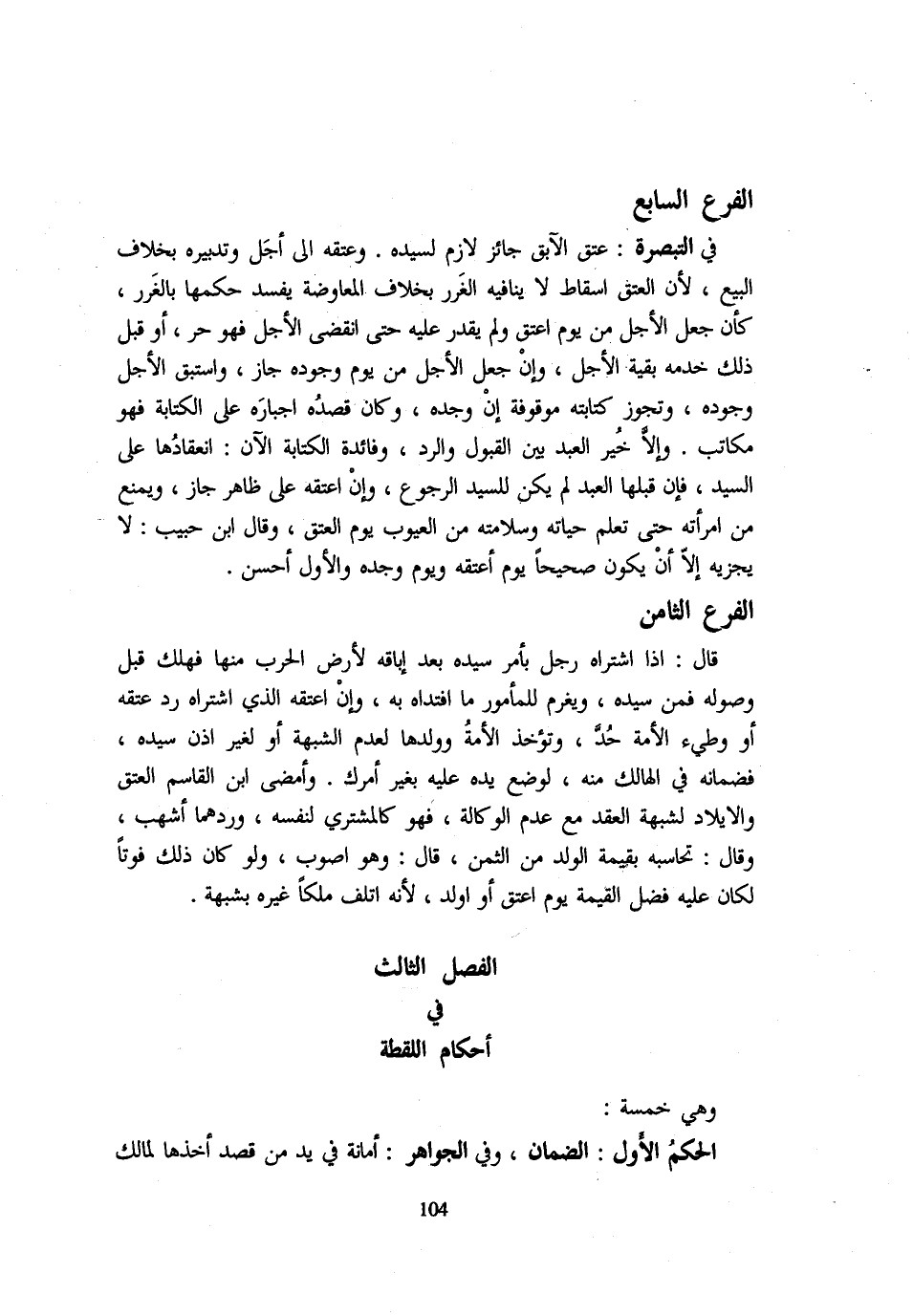 الْفَرْعُ السَّابِعُ فِي التَّبْصِرَةِ عِتْقُ الْآبِقِ جَائِزٌ لَازِمٌ لِسَيِّدِهِ وَعِتْقُهُ إِلَى أَجَلٍ وَتَدْبِيرُهُ بِخِلَافِ الْبَيْعِ لِأَنَّ الْعِتْقَ إِسْقَاطٌ لَا يُنَافِيهِ الْغَرَرُ بِخِلَافِ الْمُعَاوَضَةِ يُفْسِدُ حُكْمَهَا بِالْغَرَرِ كَأَنَّ جَعْلَ الْأَجَلِ مِنْ يَوْمِ أَعْتَقَ وَلَمْ يَقْدِرْ عَلَيْهِ حَتَّى انْقَضَى الْأَجَلُ فَهُوَ حُرٌّ أَوْ قَبْلَ ذَلِكَ خِدْمَةُ بَقِيَّةِ الْأَجَلِ وَإِنْ جَعَلَ الْأَجَلَ مِنْ يَوْمِ وُجُودِهِ جَازَ وَاسْتَبَقَ الْأَجَلُ وُجُودَهُ وَتَجُوزُ كِتَابَتُهُ مَوْقُوفَةً إِنْ وَجَدَهُ وَكَانَ قَصْدُهُ إِجْبَارَهُ عَلَى الْكِتَابَةِ فَهُوَ مُكَاتَبٌ وَإِلَّا خُيِّرَ الْعَبْدُ بَيْنَ الْقَبُولِ وَالرَّدِّ وَفَائِدَةُ الْكِتَابَةِ الْآنَ انْعِقَادُهَا عَلَى السَّيِّدِ فَإِنْ قَبِلَهَا الْعَبْدُ لَمْ يكن للسَّيِّد الرُّجُوع وَإِن اعتقه على ظَاهر جَازَ وَيُمْنَعُ مِنَ امْرَأَتِهِ حَتَّى تَعْلَمَ حَيَاتَهُ وَسَلَامَتَهُ مِنَ الْعُيُوبِ يَوْمَ الْعِتْقِ وَقَالَ ابْنُ حبيب لَا يجْزِيه إِلَّا أَنْ يَكُونَ صَحِيحًا يَوْمَ أَعْتَقَهُ وَيَوْمَ وَجَدَهُ وَالْأَوَّلُ أَحْسَنُ الْفَرْعُ الثَّامِنُ قَالَ إِذَا اشْتَرَاهُ رَجُلٌ بِأَمْرِ سَيِّدِهِ بَعْدَ إِبَاقِهِ لِأَرْضِ الْحَرْبِ مِنْهَا فَهَلَكَ قَبْلَ وُصُولِهِ فَمِنْ سَيِّدِهِ وَيَغْرَمُ لِلْمَأْمُورِ مَا افْتَدَاهُ بِهِ وَإِنْ أَعْتَقَهُ الَّذِي اشْتَرَاهُ رد عتقه أَو وطيء الْأَمَةَ حُدَّ وَتُؤْخَذُ الْأَمَةُ وَوَلَدُهَا لِعَدَمِ الشُّبْهَةِ أَوْ لِغَيْرِ إِذْنِ سَيِّدِهِ فَضَمَانُهُ فِي الْهَالِكِ مِنْهُ لوضع يَده عَلَيْهِ بِغَيْر أَمرك وَأَمْضَى ابْنُ الْقَاسِمِ الْعِتْقَ وَالْإِيلَادَ لِشُبْهَةِ الْعَقْدِ مَعَ عَدَمِ الْوَكَالَةِ فَهُوَ كَالْمُشْتَرِي لِنَفْسِهِ وَرَدَّهُمَا أَشْهَبُ وَقَالَ تُحَاسِبُهُ بِقِيمَةِ الْوَلَدِ مِنَ الثَّمَنِ قَالَ وَهُوَ أَصْوَبُ وَلَوْ كَانَ ذَلِكَ فَوْتًا لَكَانَ عَلَيْهِ فَضْلُ الْقِيمَةِ يَوْمَ أُعْتِقَ أَوْ اولد لِأَنَّهُ أتلف ملكا غَيْرِهِ بِشُبْهَةٍ