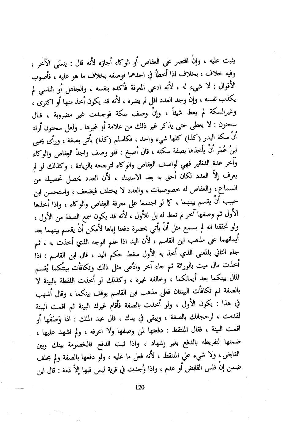 يُثْبِتُ عَلَيْهِ وَإِنِ اقْتَصَرَ عَلَى الْعِفَاصِ أَوِ الْوِكَاءِ أَجَازَهُ لِأَنَّهُ قَالَ يَنْسَى الْآخَرُ وَفِيهِ خِلَافٌ بِخِلَافِ إِذَا أَخْطَأَ فِي أَحَدِهِمَا فَوَصَفَهُ بِخِلَافِ مَا هُوَ عَلَيْهِ فَأَصْوَبُ الْأَقْوَالِ لَا شَيْءَ لَهُ لِأَنَّهُ ادَّعَى الْمَعْرِفَةَ فَأَكَّدَهُ بِنَفْسِهِ أَو الْجَاهِل وَالنَّاسِي لَمْ يَكْذِبْ نَفْسَهُ وَإِنْ وُجِدَ الْعَدَدُ أَقَلَّ لَمْ يَضُرَّهُ لِأَنَّهُ قَدْ يَكُونُ أَخَذَ مِنْهَا أَوِ اكْتَرَى وَغَيْرُ السِّكَّةِ لَمْ يُعْطَ شَيْئًا وَإِن وصف سكَّة فَوجدت غير مَضْرُوبَة وَقَالَ سَحْنُونٌ لَا يُعْطَى حَتَّى يَذْكُرَ غَيْرَ ذَلِكَ مِنْ عَلَامَةٍ أَوْ غَيْرِهَا وَلَعَلَّ سَحْنُون أَرَادَ أَن سكَّة الْبَدْر كَذَا كلهَا شَيْء وَاحِد فكاسلم كَذَا يَأْتِي بِصِفَةٍ وَرَأَى يَحْيَى بْنُ عُمَرَ أَنْ يَأْخُذَهَا بِصِفَةِ سِكَّتِهِ قَالَ أَصْبَغُ فَلَوْ وَصَفَ وَاجِد العفاص والوكاء وَآخر عدَّة الدَّنَانِيرِ فَهِيَ لِوَاصِفِ الْعِفَاصِ وَالْوِكَاءِ لِتَرَجُّحِهُ بِالزِّيَادَةِ وَكَذَلِكَ لَوْ لَمْ يُعَرِّفْ إِلَّا الْعَدَدَ لَكَانَ أَحَقَّ بِهِ بَعْدَ الِاسْتِينَاءِ لِأَنَّ الْعَدَدَ يَحْصُلُ تَحْصِيلُهُ مِنَ السَّمَاعِ وَالْعِفَاصَ لَهُ خُصُوصِيَّاتٌ وَالْعَدَدُ لَا يَخْتَلِفُ فَيَضْعُفُ وَاسْتَحْسَنَ ابْنُ حَبِيبٍ أَنْ يُقْسَمَ بَيْنَهُمَا كَمَا لَوِ اجْتَمَعَا عَلَى مَعْرِفَةِ الْعِفَاصِ وَالْوِكَاءِ وَإِذَا أَخَذَهَا الْأَوَّلُ ثُمَّ وَصَفَهَا آخَرُ لَمْ تُعْطَ لَهُ بَلْ لِلْأَوَّلِ لِأَنَّهُ قَدْ يَكُونُ سَمِعَ الصِّفَةَ مِنَ الْأَوَّلِ وَلَوْ تَحَقَّقْنَا أَنَّهُ لَمْ يَسْمَعْ مِثْلَ أَنْ يَأْتِيَ بِحَضْرَة دَفنهَا إِيَّاهَا لِأَمْكَنَ أَنْ يُقْسَمَ بَيْنَهُمَا بَعْدَ أَيْمَانِهِمَا عَلَى مَذْهَبِ ابْنِ الْقَاسِمِ لِأَنَّ الْيَدَ إِذَا عُلِمَ الْوَجْهُ الَّذِي أَخَذَتْ بِهِ ثُمَّ جَاءَ الثَّانِي بِالْمَعْنَى الَّذِي أَخَذَ بِهِ الْأَوَّلُ سَقَطَ حُكْمُ الْيَدِ قَالَ ابْنُ الْقَاسِمِ إِذَا أَخَذْتَ أَخذ مَالَ مَيِّتٍ بِالْوِرَاثَةِ ثُمَّ جَاءَ آخَرُ وَادَّعَى مِثْلَ ذَلِكَ وَتَكَافَأَتْ بَيِّنَتُكُمَا يُقْسَمُ الْمَالُ بَيْنَكُمَا بَعْدَ أَيْمَانِكُمَا وَخَالَفَهُ غَيْرُهُ وَكَذَلِكَ لَوْ أَخَذْتَ اللُّقَطَةَ بِالْبَيِّنَةِ لَا بِالصِّفَةِ ثُمَّ تَكَافَأَتِ الْبَيِّنَتَانِ فَعَلَى مَذْهَبِ ابْنِ الْقَاسِمِ يُوقَفُ بَيْنَكُمَا وَقَالَ أَشهب فِي هَذَا يكون الأول وَلَوْ أَخَذْتَ بِالصِّفَةِ فَأَقَامَ غَيْرُكَ الْبَيِّنَةَ ثُمَّ أَقَمْتَ الْبَيِّنَةَ لَقُدِّمْتَ لِرُجْحَانِكَ بِالصِّفَةِ وَيَبْقَى فِي يَدِكَ قَالَ عَبْدُ الْمَلِكِ إِذَا وَصَفَهَا أَوْ أَقَمْتَ الْبَيِّنَةَ فَقَالَ الْمُلْتَقِطُ دَفَعْتُهَا لِمَنْ وَصَفَهَا وَلَا أَعْرِفُهُ وَلَمْ أُشْهِدْ عَلَيْهَا ضَمِنَهَا لِتَفْرِيطِهِ بِالدَّفْعِ بِغَيْرِ إِشْهَادٍ وَإِذَا ثَبَتَ الدَّفْعُ فَالْخُصُومَةُ بَيْنَكَ وَبَيْنَ الْقَابِضِ وَلَا شَيْءَ عَلَى الْمُلْتَقِطِ لِأَنَّهُ فَعَلَ مَا عَلَيْهِ وَلَوْ دَفَعَهَا بِالصِّفَةِ وَلَمْ يَحْلِفْ ضَمِنَ إِنْ فَلَسَ الْقَابِضُ أَوْ عدم وَإِذا وجد فِي قَرْيَةٍ لَيْسَ فِيهَا إِلَّا ذِمَّةٌ قَالَ ابْن