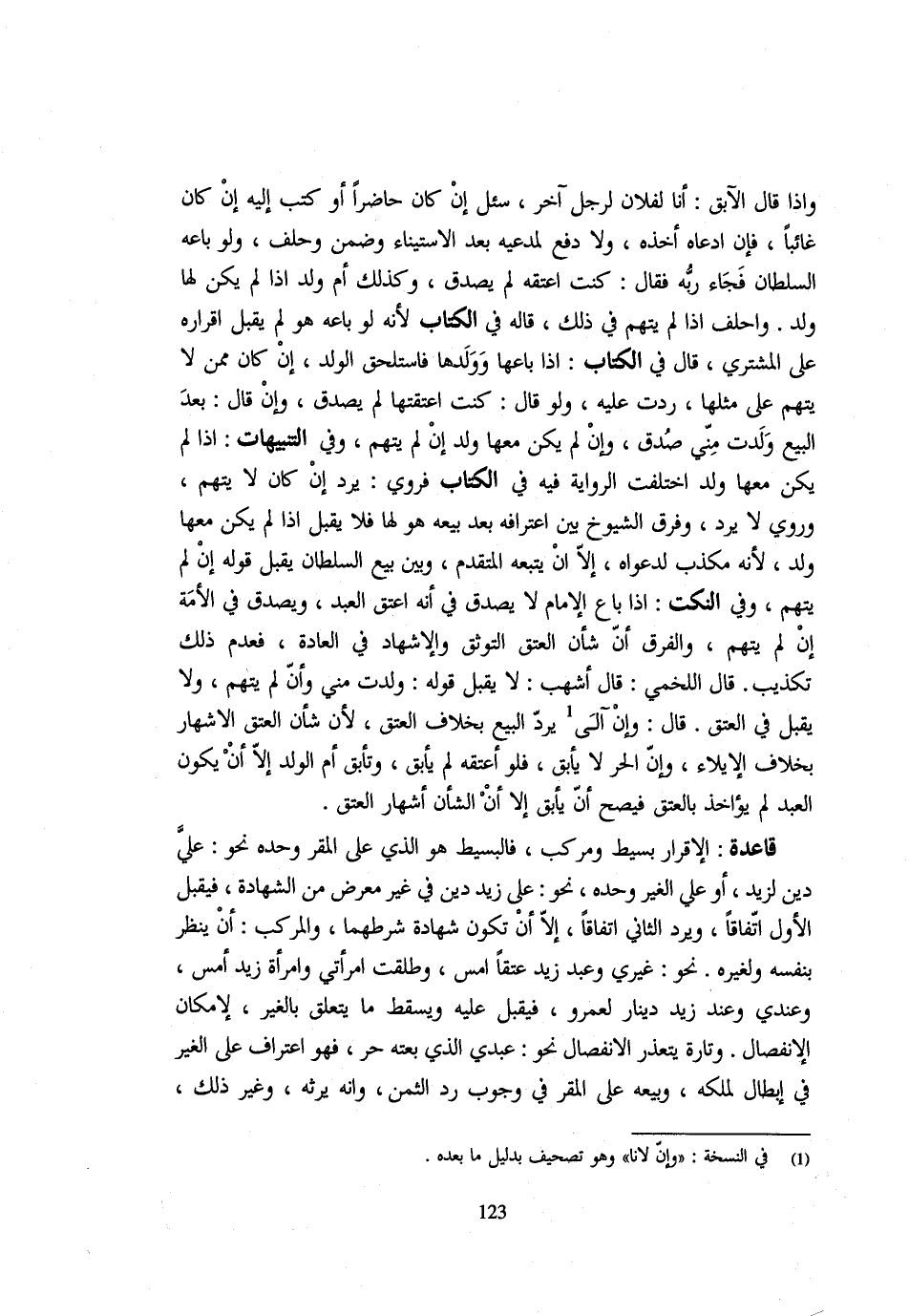 وَإِذَا قَالَ الْآبِقُ أَنَا لِفُلَانٍ لِرَجُلٍ آخَرَ سُئِلَ إِنْ كَانَ حَاضِرًا أَوْ كُتِبَ إِلَيْهِ إِن كَانَ غَائِبا فَإِن دَعَاهُ إخذه وَلَا دُفِعَ لِمُدَّعِيهِ بَعْدَ الِاسْتِينَاءِ وَضَمِنَ وَحَلَفَ وَلَوْ بَاعَهُ السُّلْطَانُ فَجَاءَ رَبُّهُ فَقَالَ كُنْتُ أَعْتِقُهُ لَمْ يُصَدَّقْ وَكَذَلِكَ أُمُّ وَلَدٍ إِذَا لَمْ يَكُنْ لَهَا وَلَدٌ وَأُحْلِفَ إِذَا لَمْ يُتَّهَمْ فِي ذَلِك قَالَ فِي الْكِتَابِ لِأَنَّهُ لَوْ بَاعَهُ هُوَ لَمْ يَقْبَلْ إِقْرَارَهُ عَلَى الْمُشْتَرِي قَالَ فِي الْكِتَابِ إِذا بَاعهَا وَوَلدهَا واستلحق الْوَلَدَ إِنْ كَانَ مِمَّنْ لَا يُتَّهَمُ عَلَى مِثْلِهَا رُدَّتْ عَلَيْهِ وَلَوْ قَالَ كُنْتُ أَعْتَقْتُهَا لَمْ يُصَدَّقْ وَإِنْ قَالَ بَعْدَ الْبَيْعِ وَلَدَتْ مِنِّي صُدِّقَ وَإِنْ لَمْ يَكُنْ مَعَهَا وَلَدٌ إِنْ لَمْ يُتَّهَمْ وَفِي التَّنْبِيهَاتِ إِذَا لَمْ يكن مَعهَا ولد اخْتلفت الرِّوَايَة فِي الْكِتَابِ فَرُوِيَ يُرَدُّ إِنْ كَانَ لَا يُتَّهَمُ وَرُوِيَ لَا يُرَدُّ وَفَرَّقَ الشُّيُوخُ بَيْنَ اعْتِرَافِهِ بَعْدَ بَيْعِهِ هُوَ لَهَا فَلَا يُقْبَلُ إِذَا لَمْ يَكُنْ مَعَهَا وَلَدٌ لِأَنَّهُ مُكَذِّبٌ لِدَعْوَاهُ إِلَّا أَنْ يَتْبَعَهُ الْمُتَقَدِّمُ وَبَيْنَ بَيْعِ السُّلْطَانِ يُقْبَلُ قَوْلُهُ إِنْ لَمْ يُتَّهَمْ وَفِي النكت إِذا بَاعَ الإِمَام لم يصدق فِي أَنه عتق الْعَبْدَ وَيُصَدَّقُ فِي الْأَمَةِ إِنْ لَمْ يُتَّهَمْ وَالْفَرْقُ أَنَّ شَأْنَ الْعِتْقِ التَّوَثُّقُ وَالْإِشْهَادُ فِي الْعَادَةِ فَعَدَمُ ذَلِكَ تَكْذِيبٌ قَالَ اللَّخْمِيُّ قَالَ أَشْهَبُ لَا يُقْبَلُ قَوْلُهُ وَلَدَتْ مِنِّي وَإِنْ لَمْ يُتَّهَمْ وَلَا يُقْبَلُ فِي الْعِتْقِ قَالَ وَإِنْ آلَى يُرَدُّ الْبَيْعُ بِخِلَافِ الْعِتْقِ لِأَنَّ شَأْنَ الْعِتْقِ الْإِشْهَارُ بِخِلَافِ الْإِيلَاءِ وَأَنَّ الْحُرَّ لَا يَأْبَقُ فَلَوْ أَعْتَقَهُ لَمْ يَأْبَقْ وَتَأْبَقُ أُمُّ الْوَلَدِ إِلَّا أَنْ يَكُونَ الْعَبْدُ لَمْ يُؤَاخَذْ بِالْعِتْقِ فَيَصِحُّ أَنْ يَأْبَقَ إِلَّا أَنَّ الشَّأْنَ إِشْهَارُ الْعِتْقِ قَاعِدَةٌ الْإِقْرَارُ بَسِيطٌ وَمُرَكَّبٌ فَالْبَسِيطُ هُوَ الَّذِي عَلَى الْمُقِرِّ وَحْدَهُ نَحْوَ عَلَيَّ دَيْنٌ لِزَيْدٍ أَوْ عَلَى الْغَيْرِ وَحْدَهُ نَحْوَ عَلَى زَيْدٍ دَيْنٌ فِي غَيْرِ مَعْرَضٍ مِنَ الشَّهَادَةِ فَيُقْبَلُ الْأَوَّلُ اتِّفَاقًا وَيُرَدُّ الثَّانِي اتِّفَاقًا إِلَّا أَنْ تَكُونَ شَهَادَةَ شَرْطِهِمَا وَالْمُرَكَّبُ أَن ينظر بِنَفسِهِ وَلغيره نَحْو غَيْرِي وَعَبْدُ زَيْدٍ عَتَقَا أَمْسَ وَطُلِّقَتِ امْرَأَتِي وَامْرَأَةُ زَيْدٍ أَمْسَ وَعِنْدِي وَعِنْدَ زَيْدٍ دِينَارٌ لِعَمْرٍو فَيُقْبِلُ عَلَيْهِ وَيَسْقُطُ مَا يَتَعَلَّقُ بِالْغَيْرِ لِإِمْكَانِ الِانْفِصَالِ وَتَارَةً يَتَعَذَّرُ الِانْفِصَالُ نَحْوَ عَبْدِي الَّذِي بِعْتُهُ حُرٌّ فَهُوَ اعْتِرَافٌ عَلَى الْغَيْرِ فِي إبِْطَال لملكه وَبَيْعُهُ عَلَى الْمُقِرِّ فِي وُجُوبِ رَدِّ الثَّمَنِ وَأَنَّهُ يَرِثُهُ وَغَيْرُ ذَلِكَ